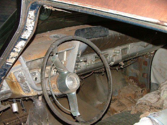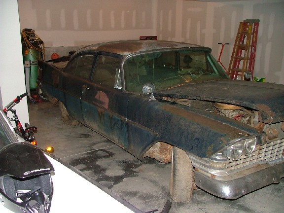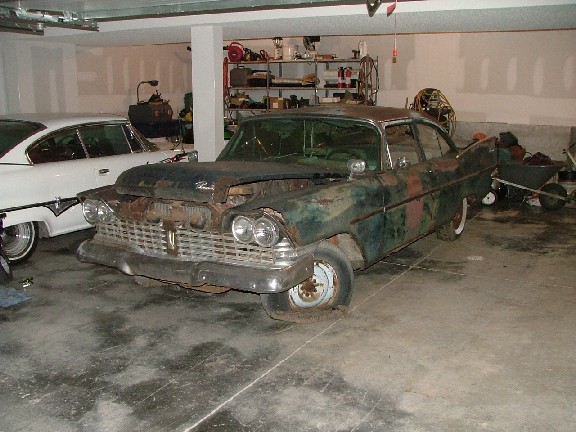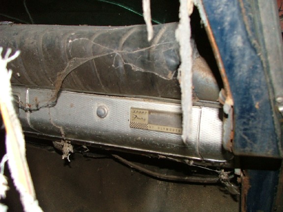 Mike from KC, a Forward Looker from Kansas City MO, recently retrieved this rough and rotting 59 Savoy 2-door sedan but now has it up for sale. One of the previous owners stuck a Sport Fury dash plaque on the glovebox door, and I wonder what he was thinking. The engine is claimed to be a 361 Golden Commando, but I’m not so sure. And, it has a TorqueFlite transmission connected to it. Mike is asking $1000 for this Savoy, but that figure is probably negotiable. Call him up at (816) 694-8612, or e-mail him at sgtriffraf@earthlink.net for details.