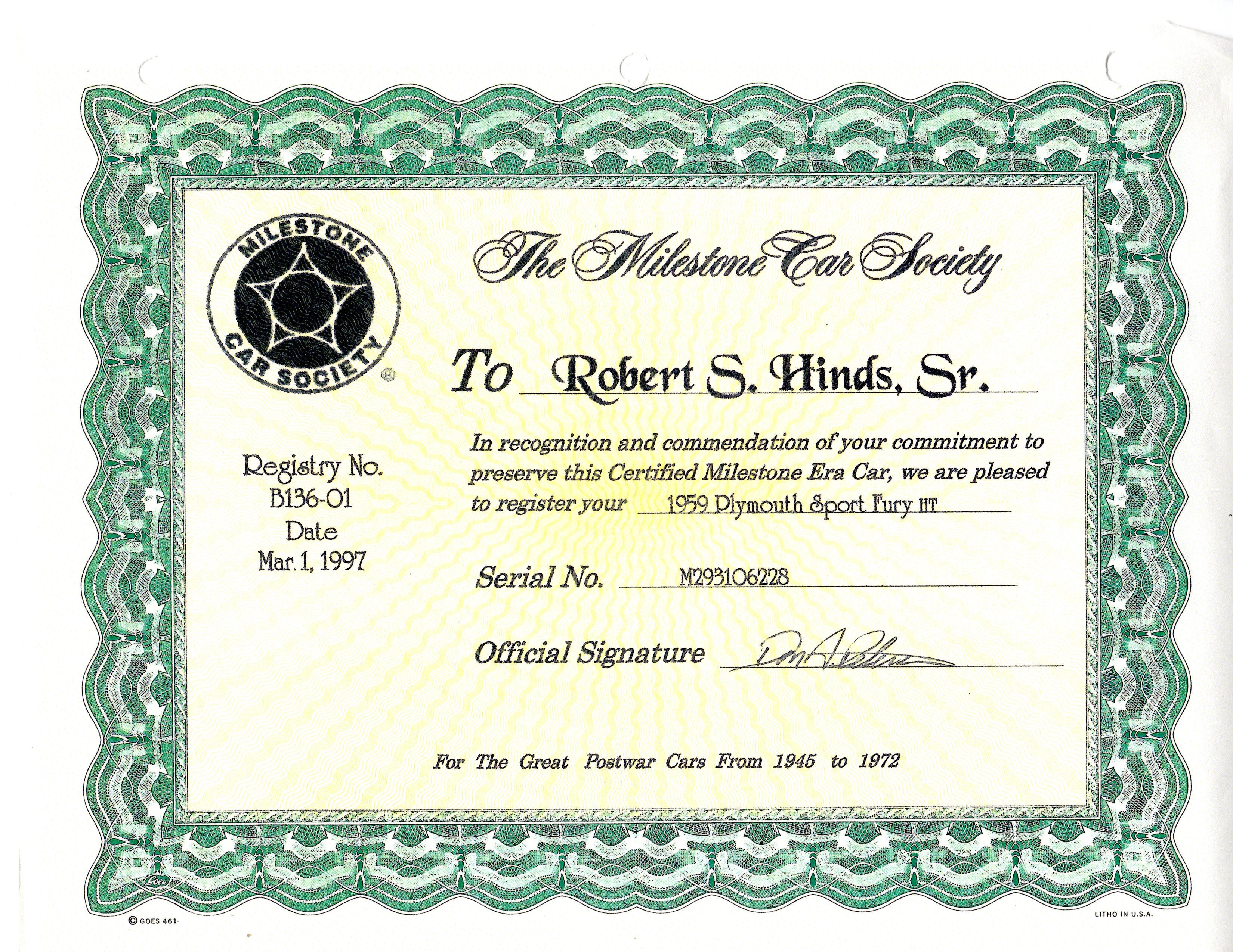 I have always said I am glad I am at the age I am at today as I would not want to start life over. Whatever happens to my Sport Fury, I will have lived and experienced life in the 50’s & 60’s when the economy was booming and cars were exciting to own and drive. Unlike cars today that all look pretty much alike, when these cars were produced, no one could accuse the “Big Three” of producing cookie cutter cars. A Chrysler car was totally different from a Ford, and Ford and Chrysler cars were noticeably different from a GM car. I still like my 59 Sport Fury for it makes a statement for itself when cruising down the road.