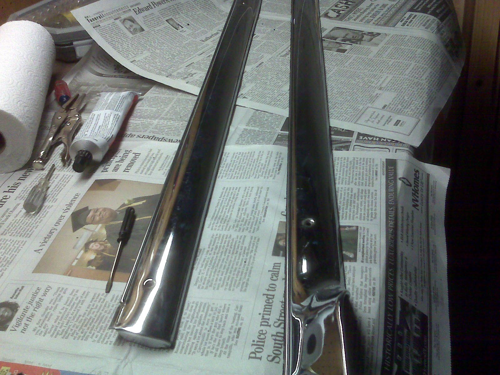Bright aluminum rivets on the garnish molding will show unless you spot them with some black paint, as I did.