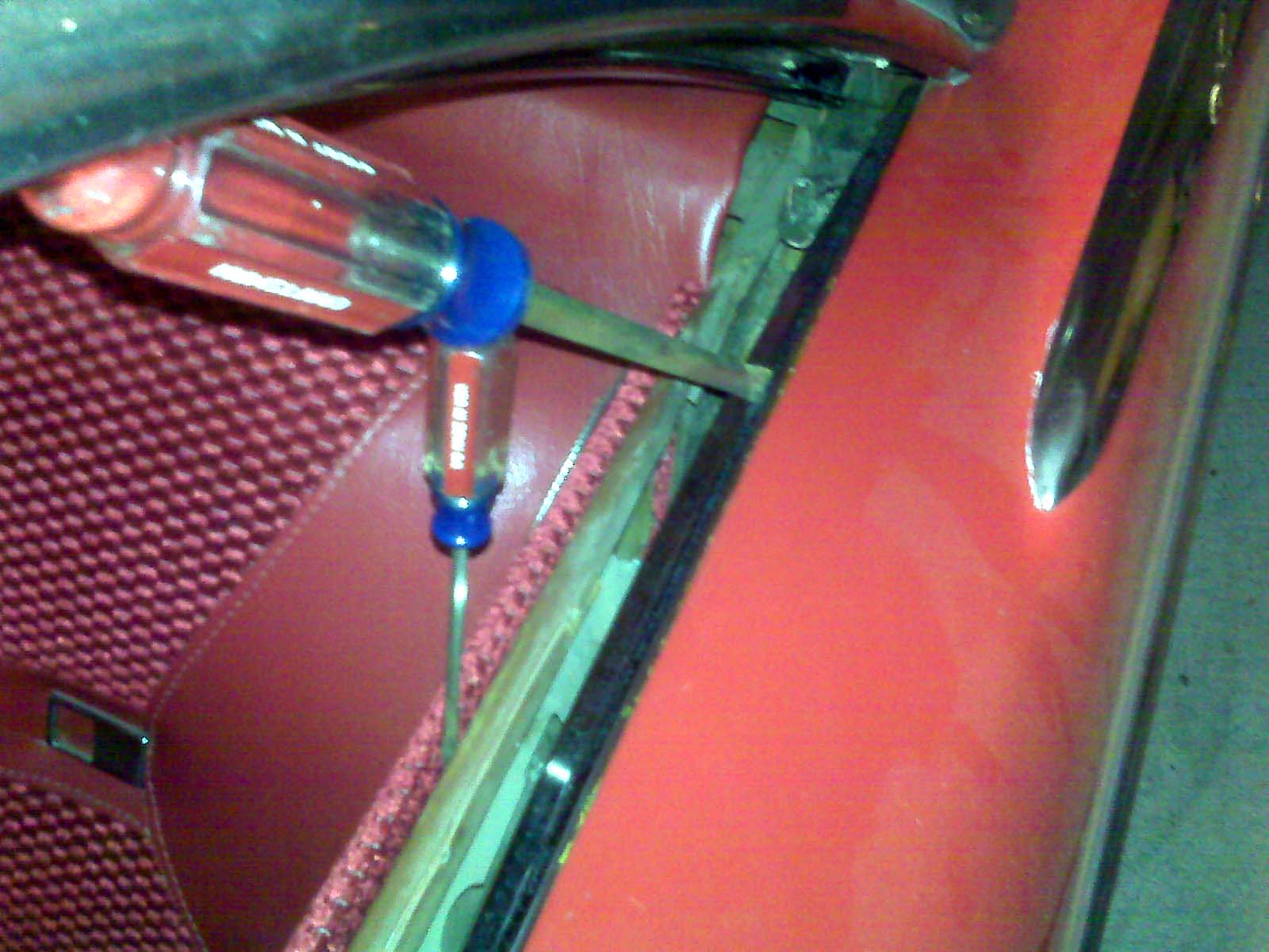 I globbed some onto a piece of cardboard, then dabbed it on the weatherstrip pried away from the channel, using a small screwdriver. The neat thing is you can control how much you get on, by pulling the blob along – it stretches and thins out. I got minimal extrusion, and now I’ve wedged some screwdrivers between the weatherstrip and the window to keep the pressure on. It seems to be working…