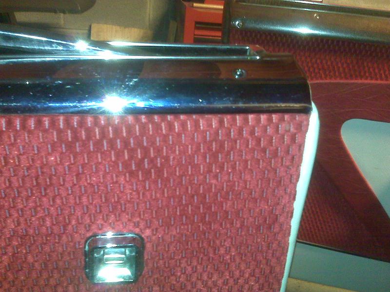 Well, that worked like a champ. And while I was at it, I fixed a nagging problem with the back seat panel – I never could get it to stay under the chrome molding. It kept coming out, and then the backing board would get bent by someone getting into the car; it’s even cracked (although, invisibly behind the material). It seems the guy who first did the interior, had the welt too long – and there were so many folds in the welt fabric, and the panel fabric itself, that the chrome molding didn’t have a chance to eclipse all of it. So I peeled back the cover, snipped the welt, took a nip and tuck here…