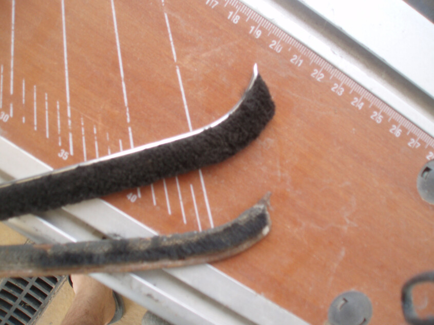 I bought a really nice kit from Restoration Specialties. The pieces match up in size and length quite nicely with the old ones. The interior ones attach to the chrome moldings. The old ones were stapled… I called RS and asked if they could recommend an adhesive to use instead (I think there must be asphalt or some petroleum derivative in the band just below the whisker part). He didn’t recommend one; he said I would not be happy with it. What do you all think?