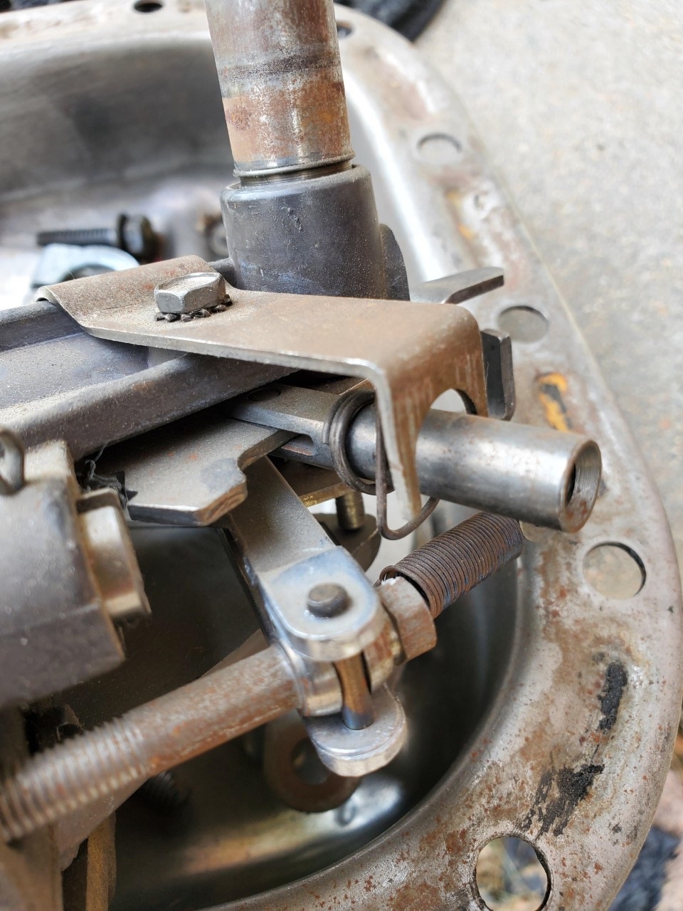 I think your name is Don? I have some pics from A functional torque flite button control, is that what you have? 1st pic is neutral, 2nd is d,3rd pic is R,4th is 2, 5th is 1 6th is A side shot of reverse and last is back in drive. The middle plate acts as A lever stop and sides of the unit must be tight. Is your cable adjusted properly at the tranny ? Also mine will “leak down” from the torque converter if it sits A number of months with out starting it. I will leak out the cable entry at the tranny. It over fills the pan capacity. Look in my and other previous posts in the rebuilds threads. Not sure if I helped let us know. Mark