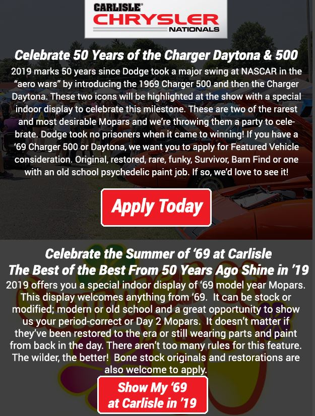 “We’re Celebrating 2 Special Anniversaries in 2019!”, says the email from Chrysler Carlisle Nationals.