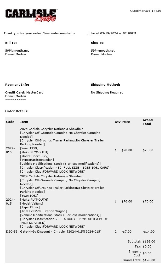 Today I signed up Faulkner and Valerie for Carlisle 2024. We’re goin’! Are you? If you’re bringing your '59, you’ll no longer find 59PLYMOUTH.NET as a entry in the Club dropdown - that’s because we should all be registering with a FORWARD LOOK NETWORK Club affiliation, so there will be no charge for the Forward Look tent. See you there!