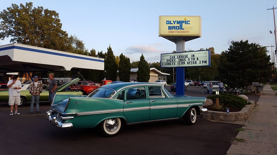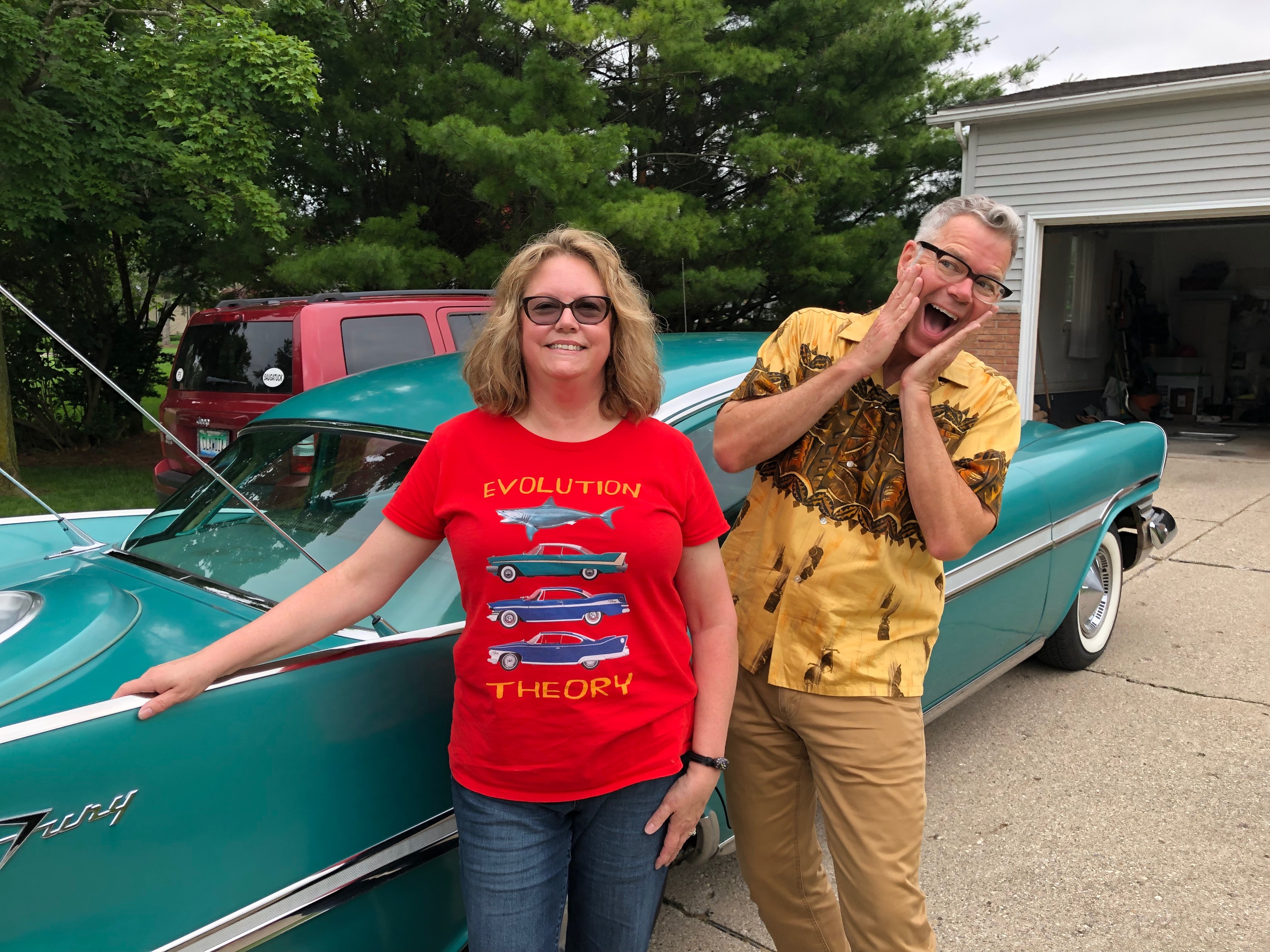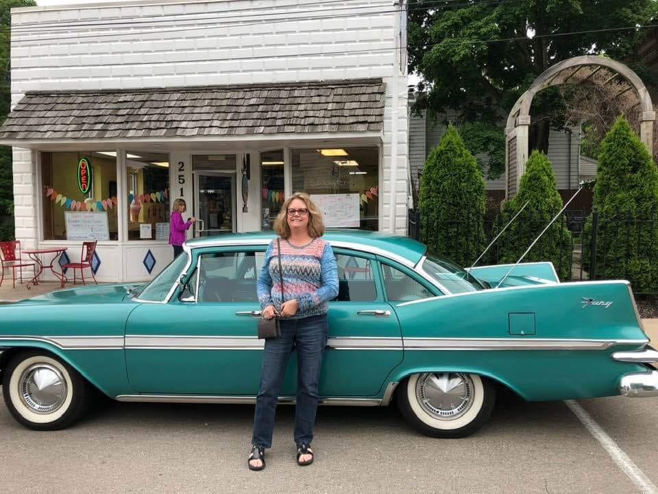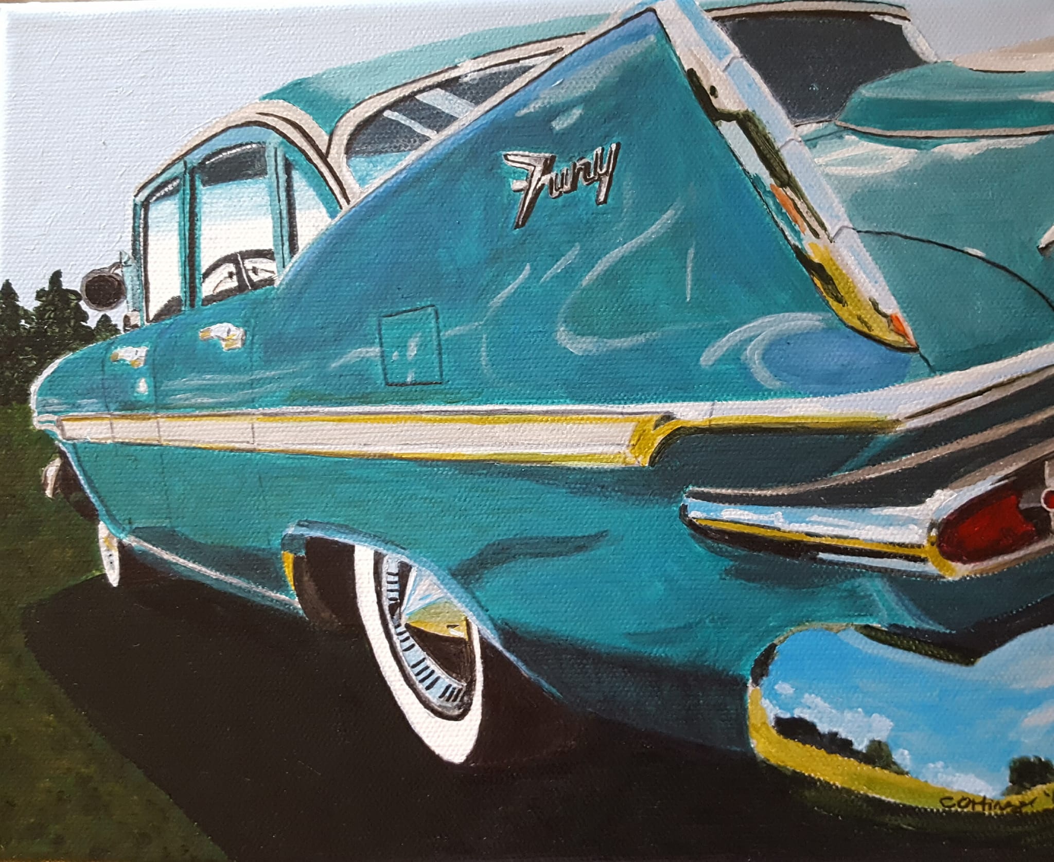 “I made and sold jewelry for years at art fairs, but, inspired by my car and the cars I was photographing at shows along with a 2018 trip to Palm Springs where I soaked up the Mid-century architecture, I started painting cars and vintage signs and scenes. They were a hit, and I’ve been doing it ever since. I have an online shop where I sell my work, and I’ve also been doing commissions for people who want paintings of their cars. I paint in a realistic style, and love to get the shine on the chrome just right! I live in Michigan, and I spend most of my summer weekends at either car shows or art fairs. The Plymouth can hold my entire art fair setup, and I sometimes use it as a prop at the shows!”