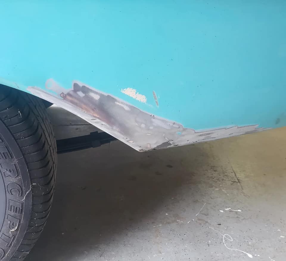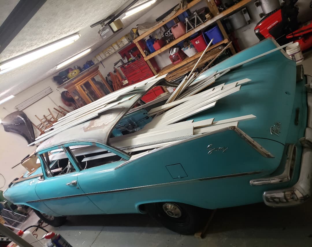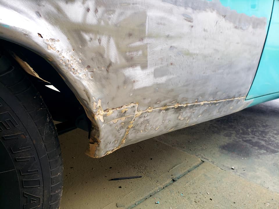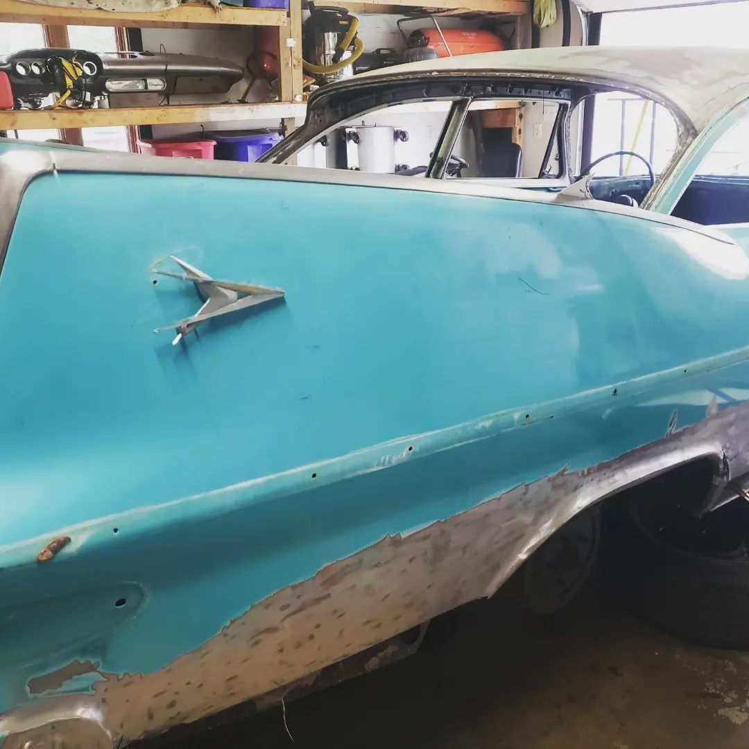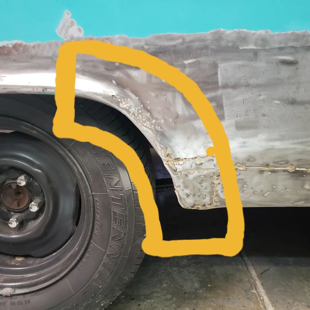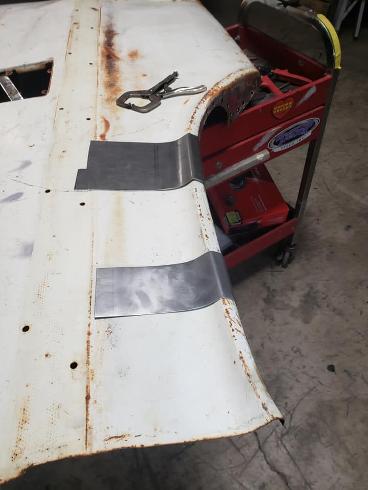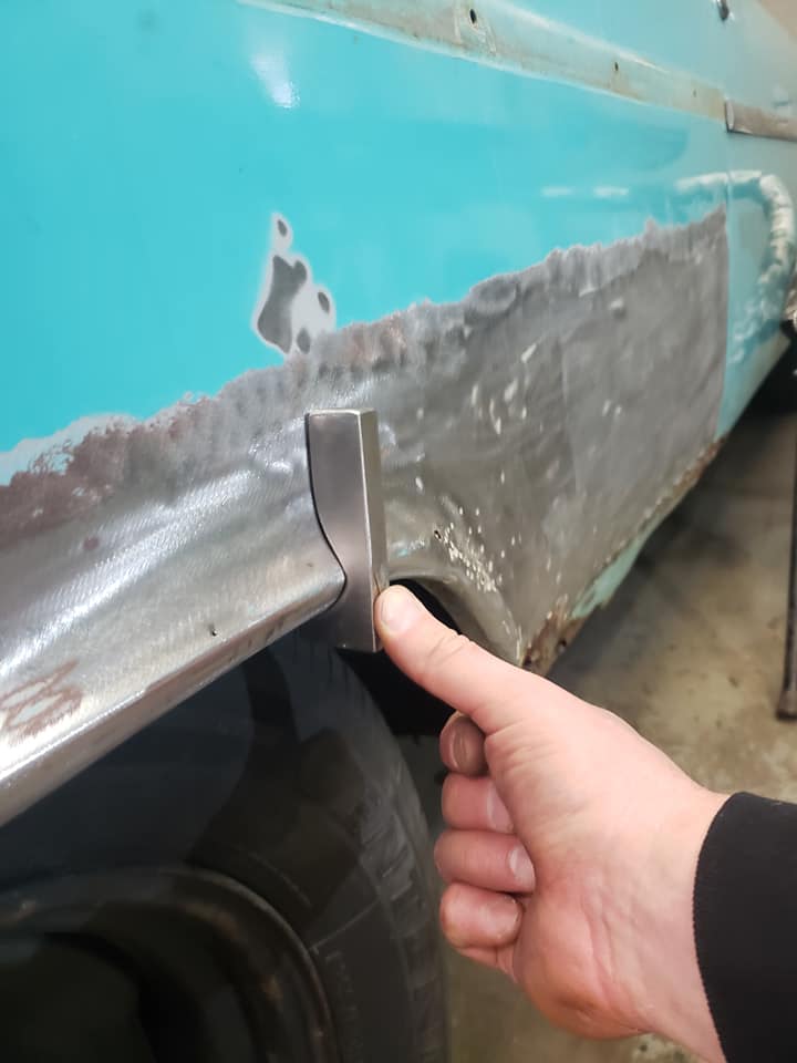 2022-05-15 Still working on perfecting the patch panels for the 59. Today I made a new one that is longer then the first one. It came out well. I still need to do some tuning on it. The first panel I made (last photo) went so well that I really didn’t learn as much as I could have on it. This panel today was a lot more of a challenge because of its extra length and shape. I am also working on a patch panel for the forward lip area of the quarter panel. The initial panel has presented some challenges I have not had time to sort out yet, but it’s next on the hit list.