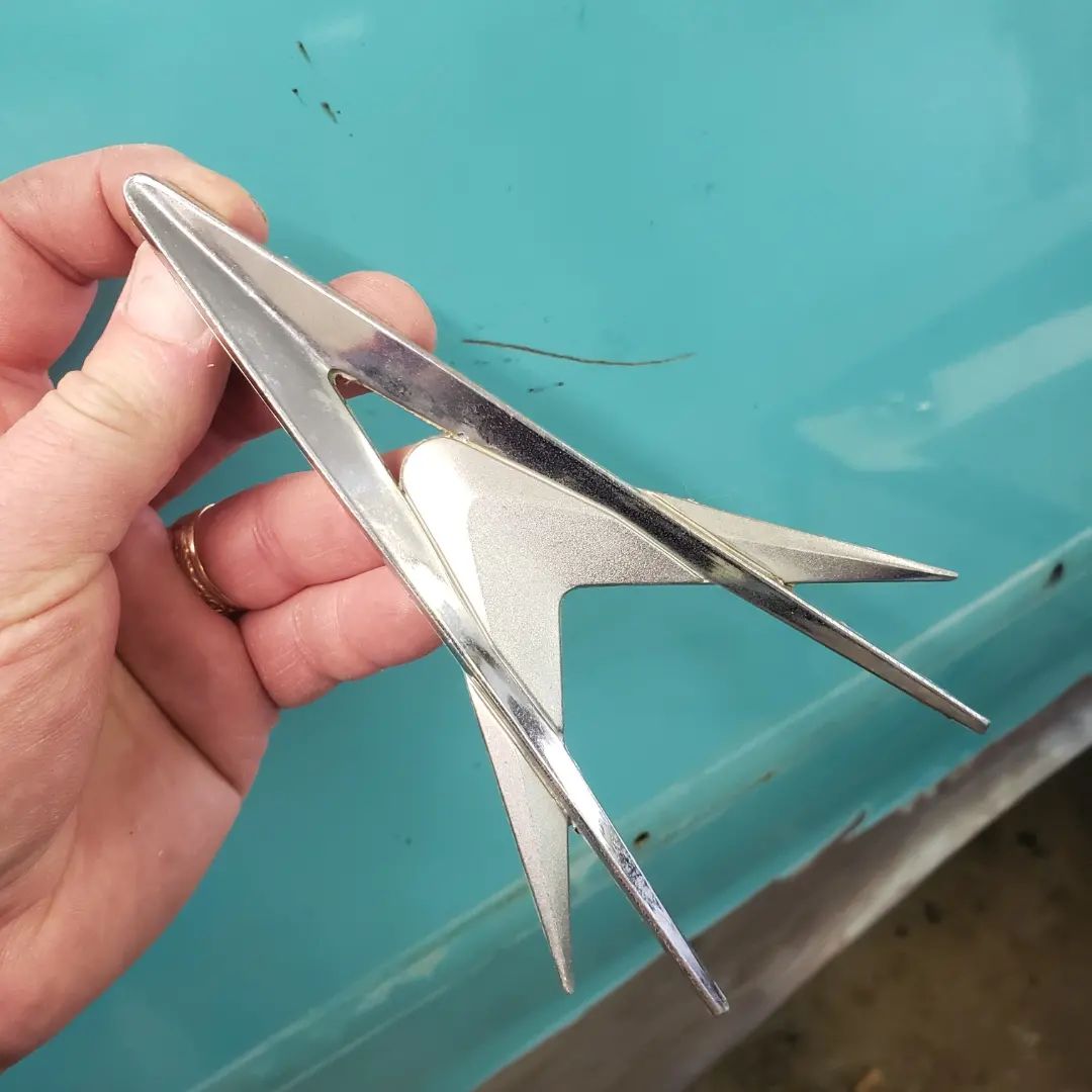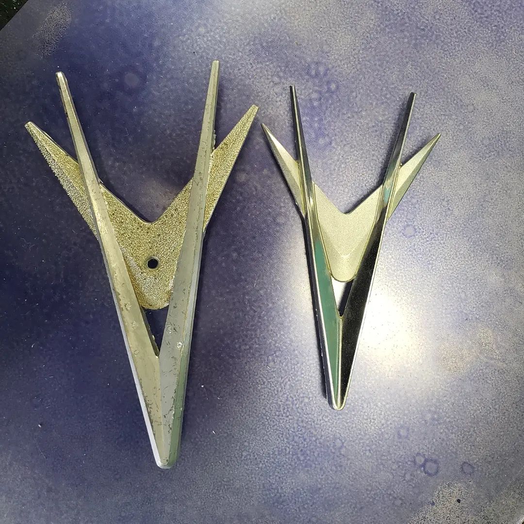 2022-04-27 My recent forwardlook emblem purchase came in today. Super nice, no broken mounting studs. Going to use this smaller style one on the 59 plymouth quarter fin as opposed to the larger 1956ish Dodge truck style forwardlook emblem in the last photo.