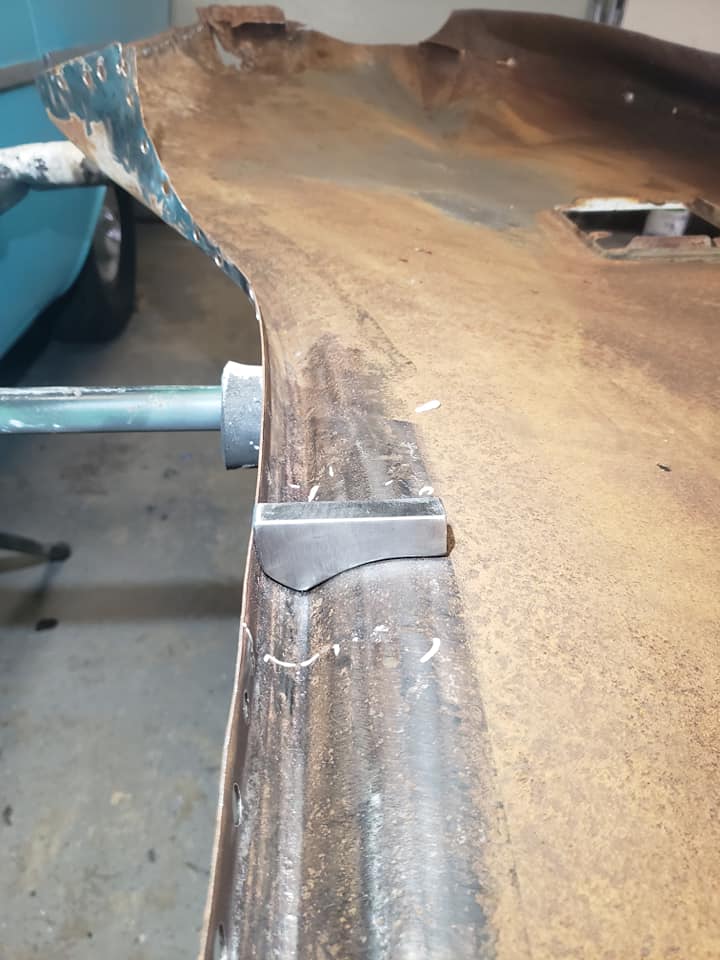 2022-01-24 In process- Pullmax Dies that I am making to form the wheel lip on the patch panels for the 1959 Plymouth. I used a bondo mold on the inside of my used 59 quarters to get an accurate profile. I then transferred that to a 1/2in. piece of metal. They most likely will get cut down some and will require alot of fine tuning once running in the Pullmax Machine. But, pretty happy with the progress so far this weekend.