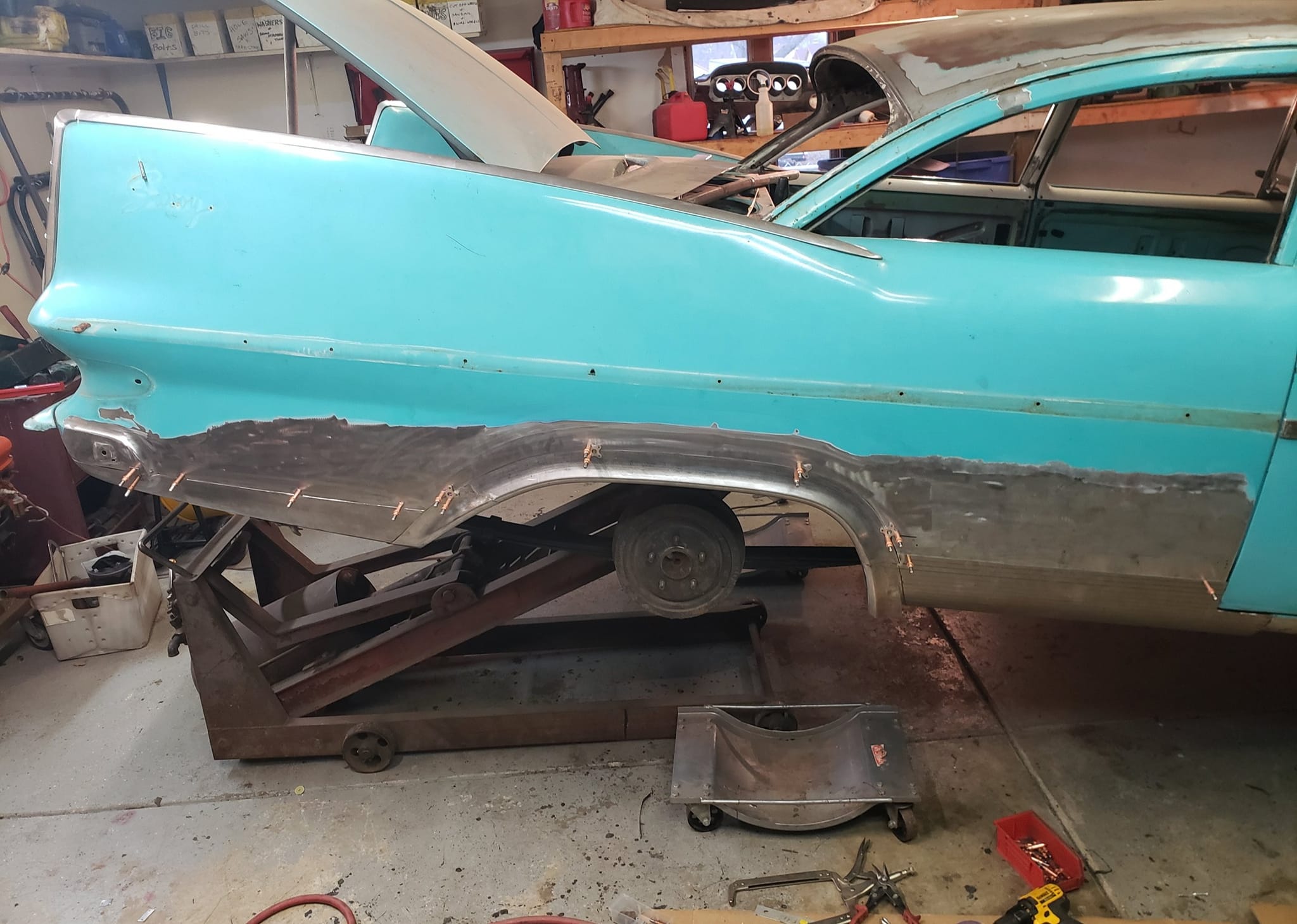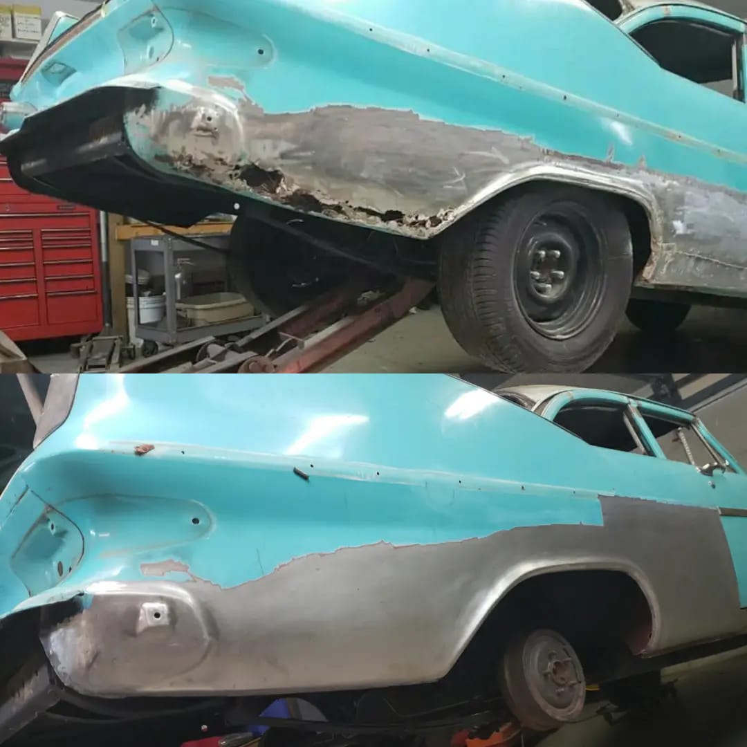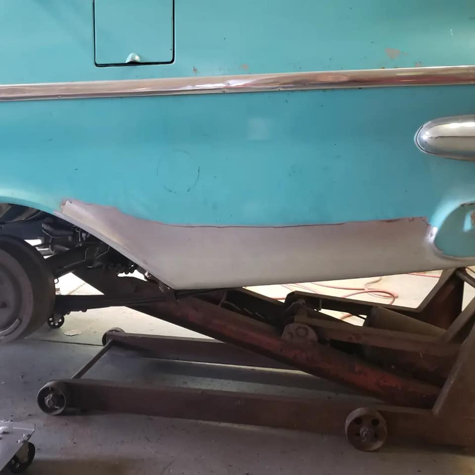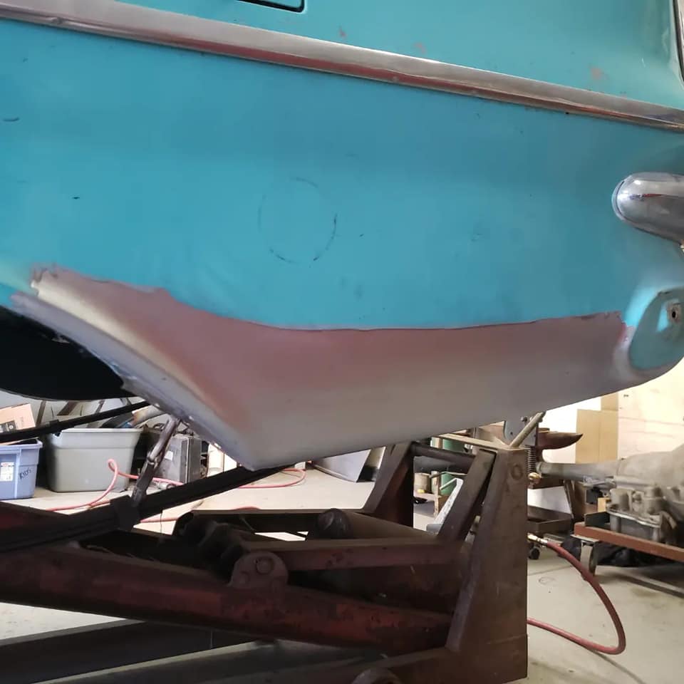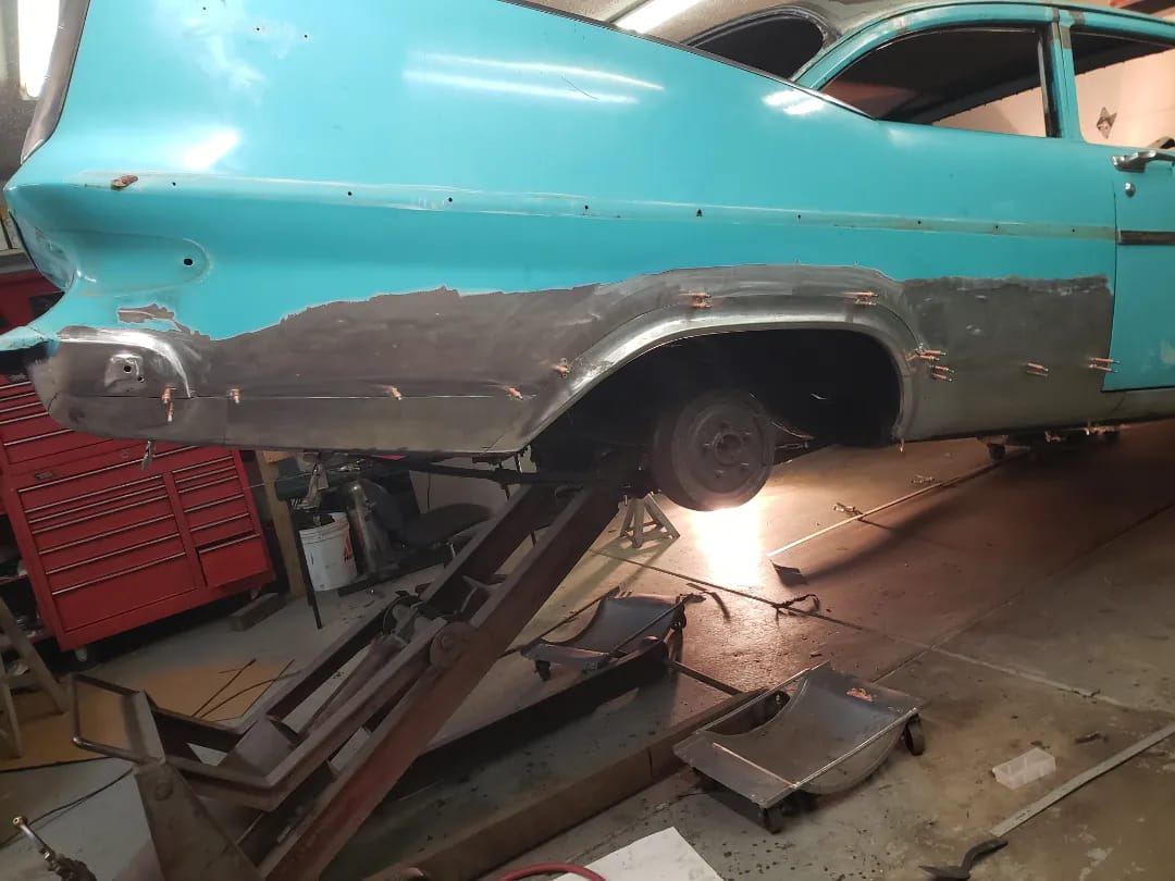 2023-01-29 Not a lot to show off on the 59 this weekend. I spent quite a bit of time making the rear dog legs for both sides of the car. I made the patterns yesterday. Ran to work today and formed them through the Pullmax. Without having the car there I did a lot of guessing on what they should look like before coming home. Most the guessing was wrong but fortunately fixable. Drivers side needs a little more shaping but is almost done being fitted.