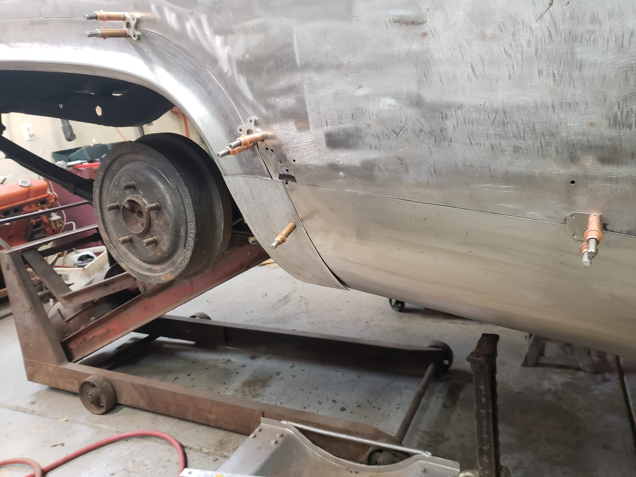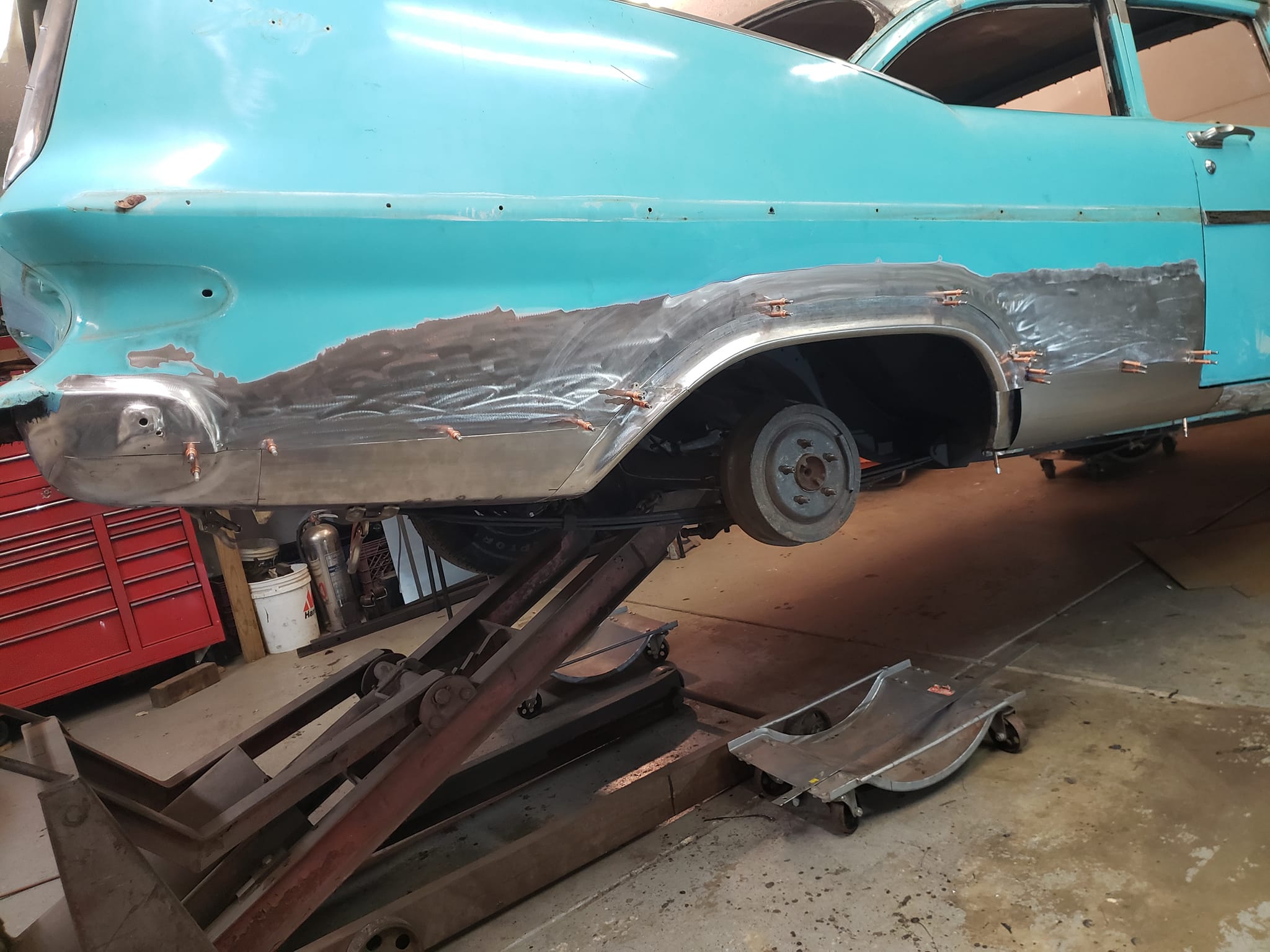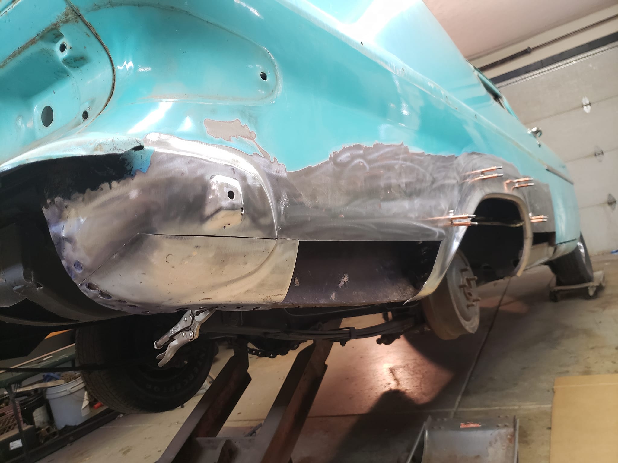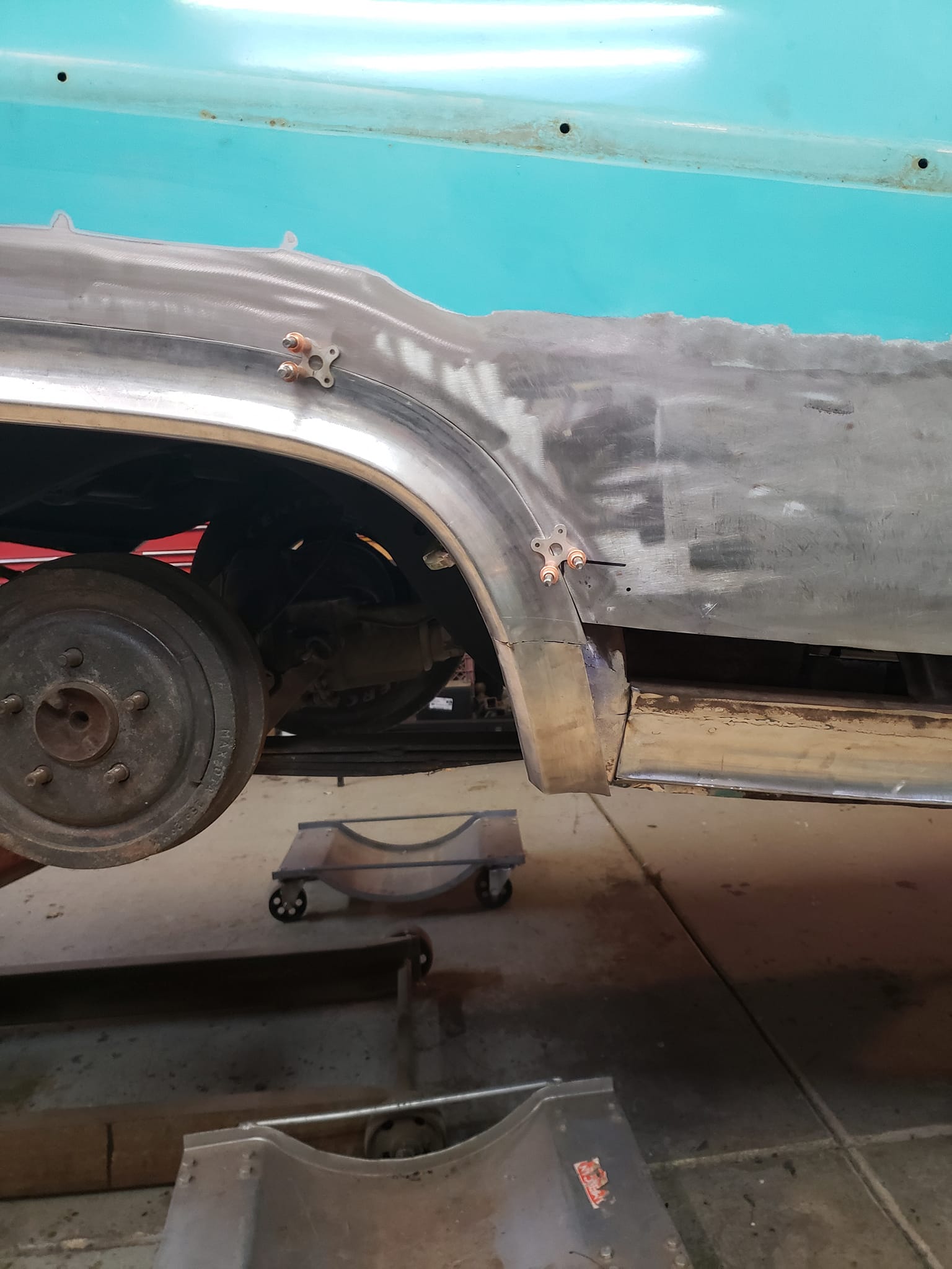 2023-01-29 Not a lot to show off on the 59 this weekend. I spent quite a bit of time making the rear dog legs for both sides of the car. I made the patterns yesterday. Ran to work today and formed them through the Pullmax. Without having the car there I did a lot of guessing on what they should look like before coming home. Most the guessing was wrong but fortunately fixable. Drivers side needs a little more shaping but is almost done being fitted.