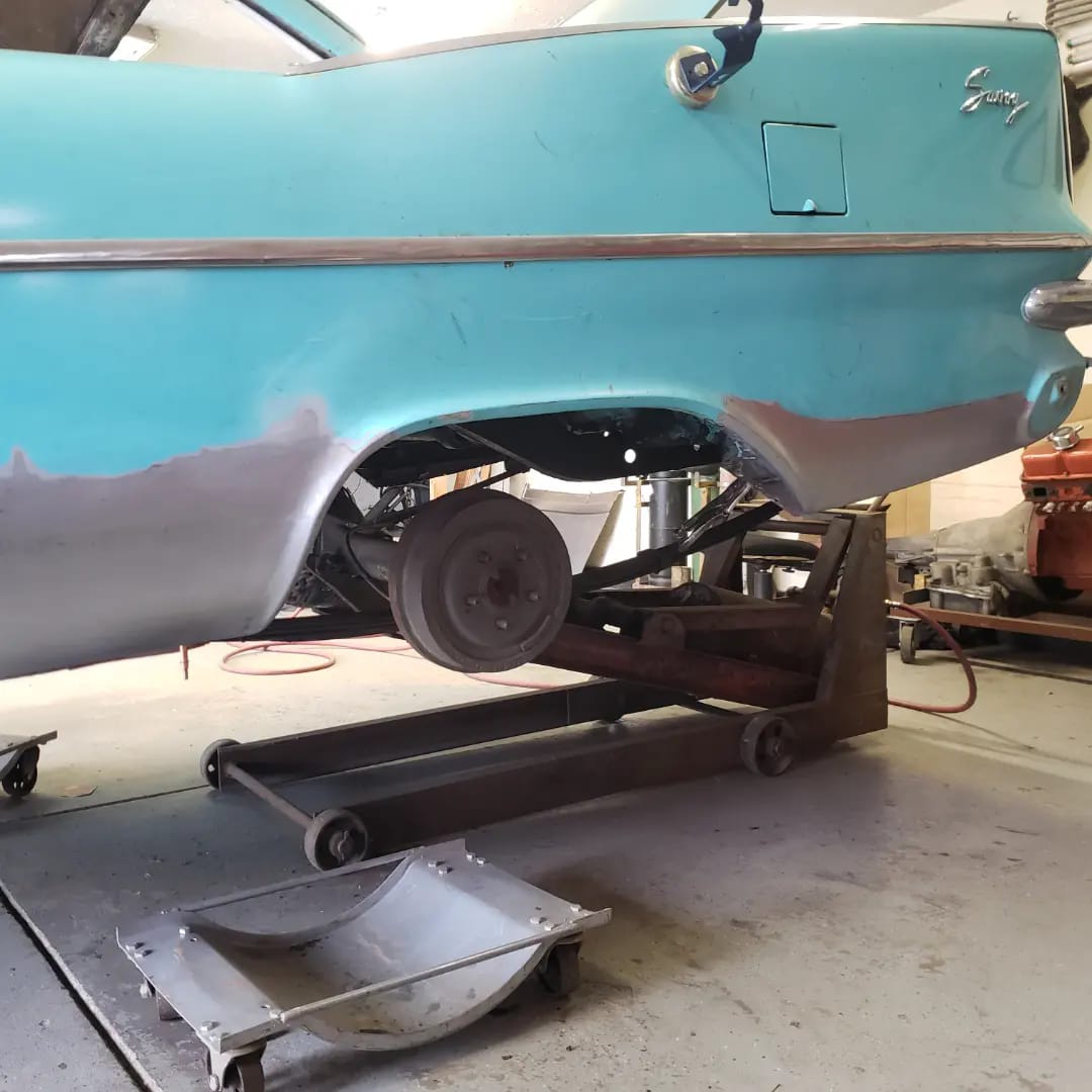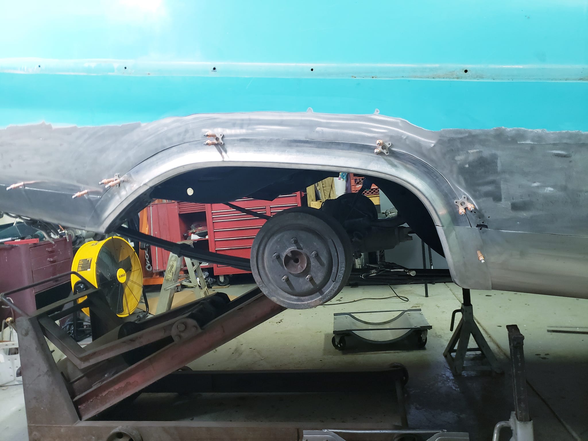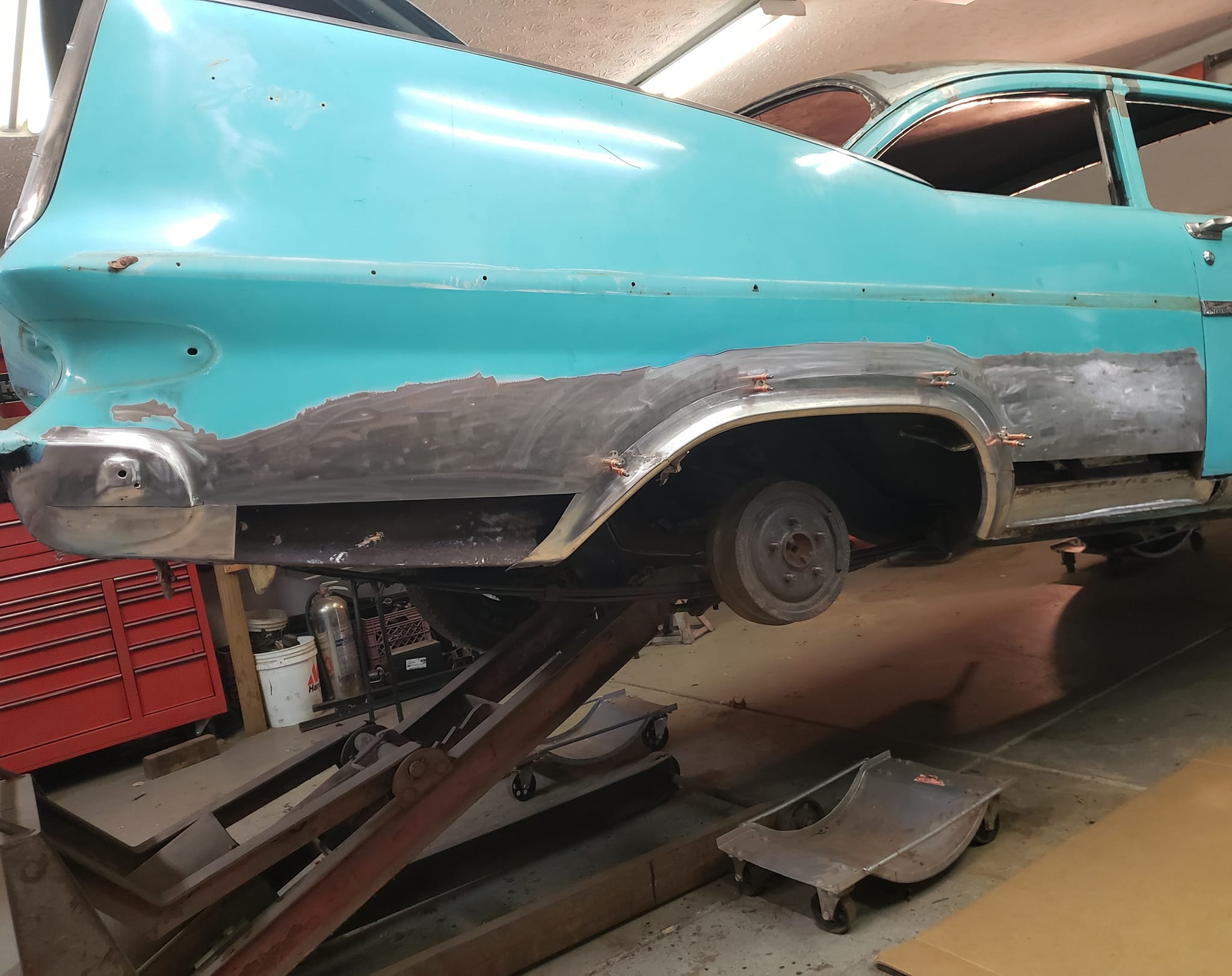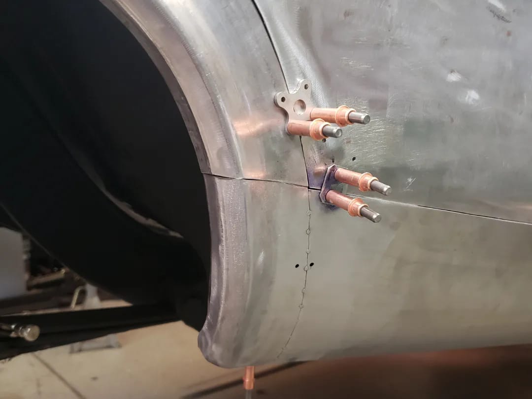 2023-01-29 Not a lot to show off on the 59 this weekend. I spent quite a bit of time making the rear dog legs for both sides of the car. I made the patterns yesterday. Ran to work today and formed them through the Pullmax. Without having the car there I did a lot of guessing on what they should look like before coming home. Most the guessing was wrong but fortunately fixable. Drivers side needs a little more shaping but is almost done being fitted.
