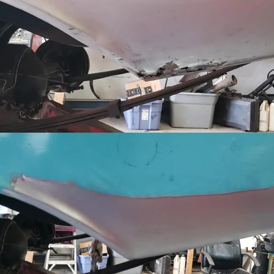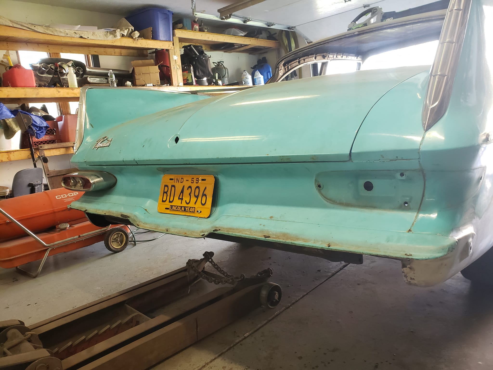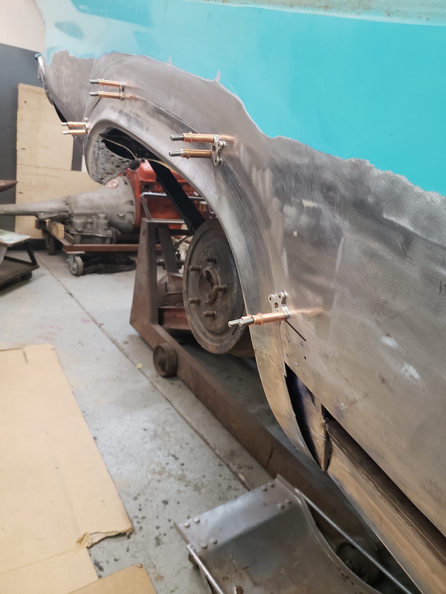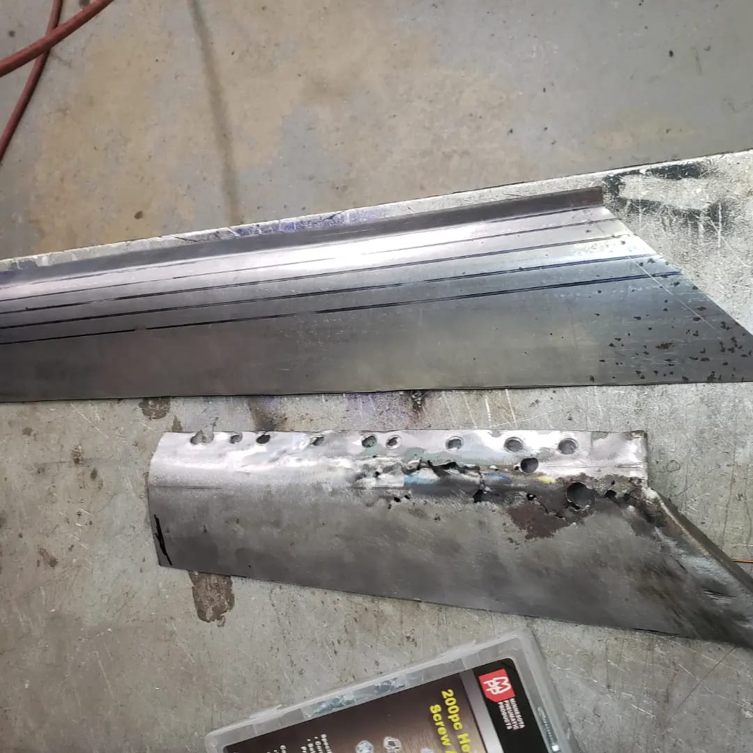 2023-01-29 Not a lot to show off on the 59 this weekend. I spent quite a bit of time making the rear dog legs for both sides of the car. I made the patterns yesterday. Ran to work today and formed them through the Pullmax. Without having the car there I did a lot of guessing on what they should look like before coming home. Most the guessing was wrong but fortunately fixable. Drivers side needs a little more shaping but is almost done being fitted.