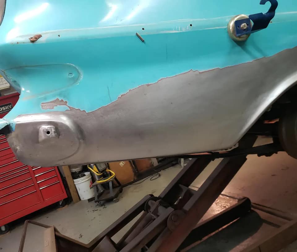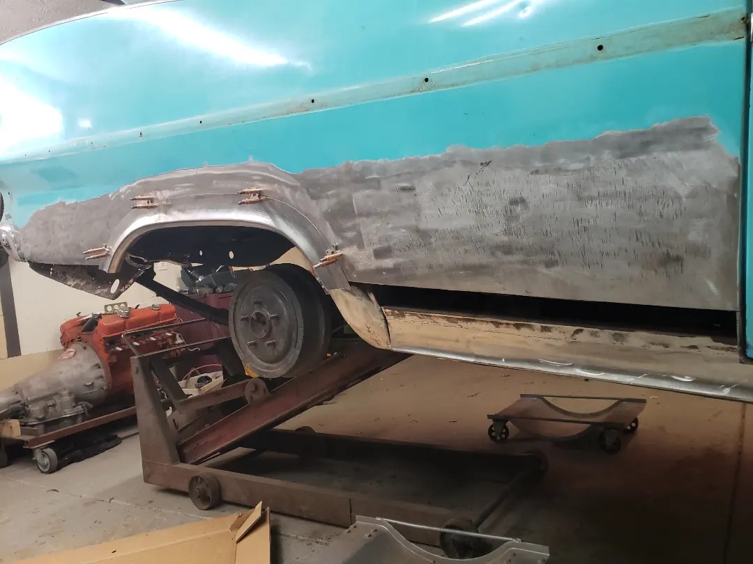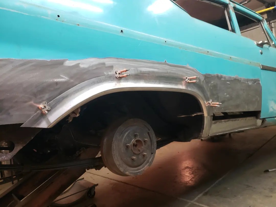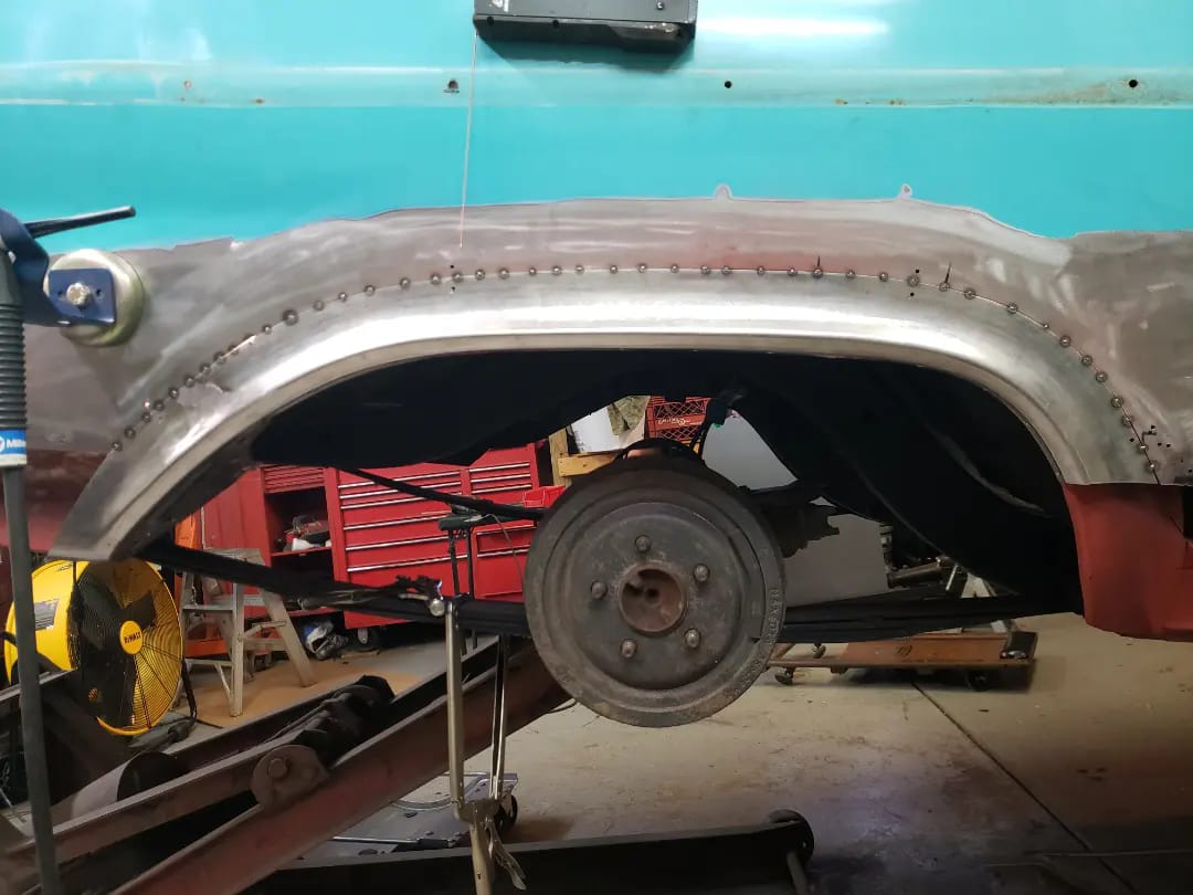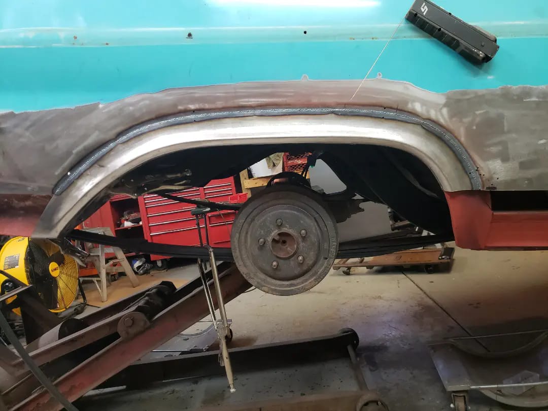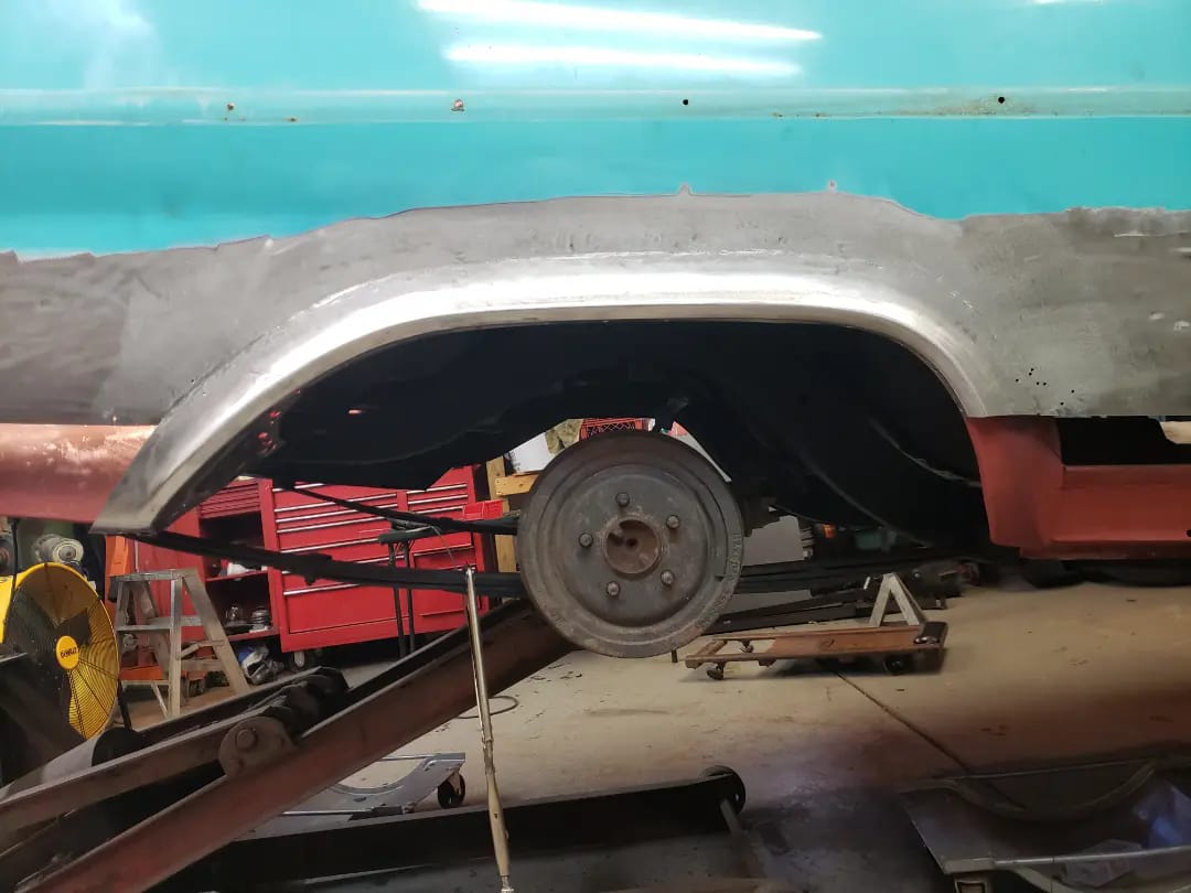 2023-04-08 Finally back on four wheels and getting a little sunlight after way too long. Drivers side quarter panel is basically done now. Time to move on to some other metal mods.