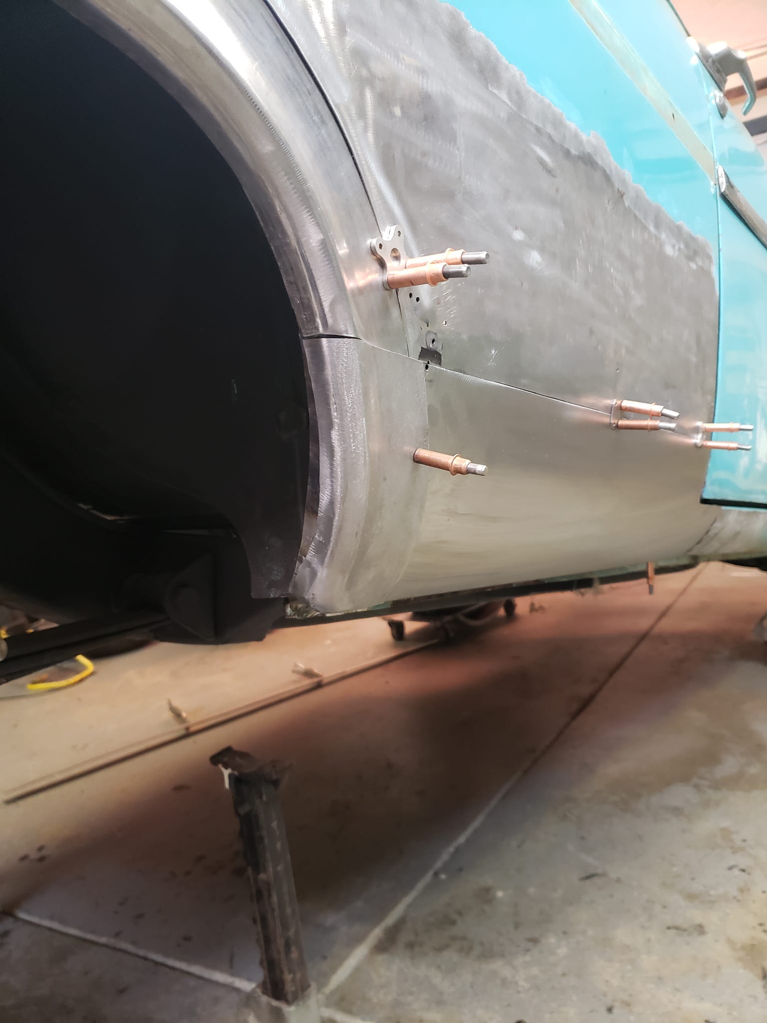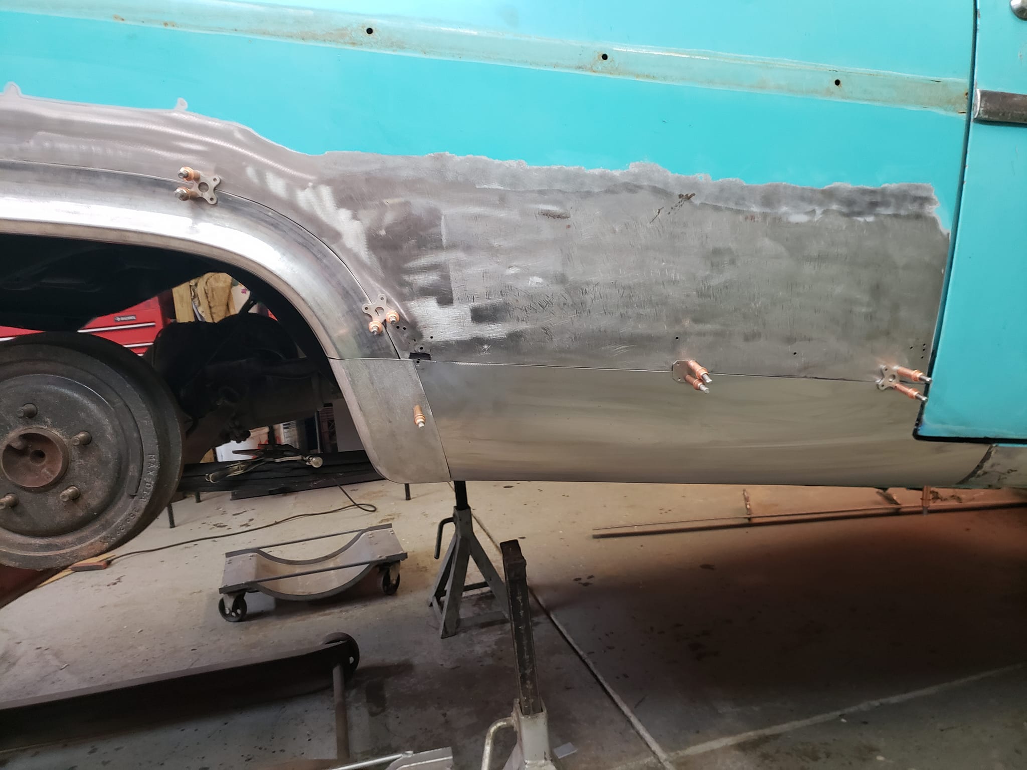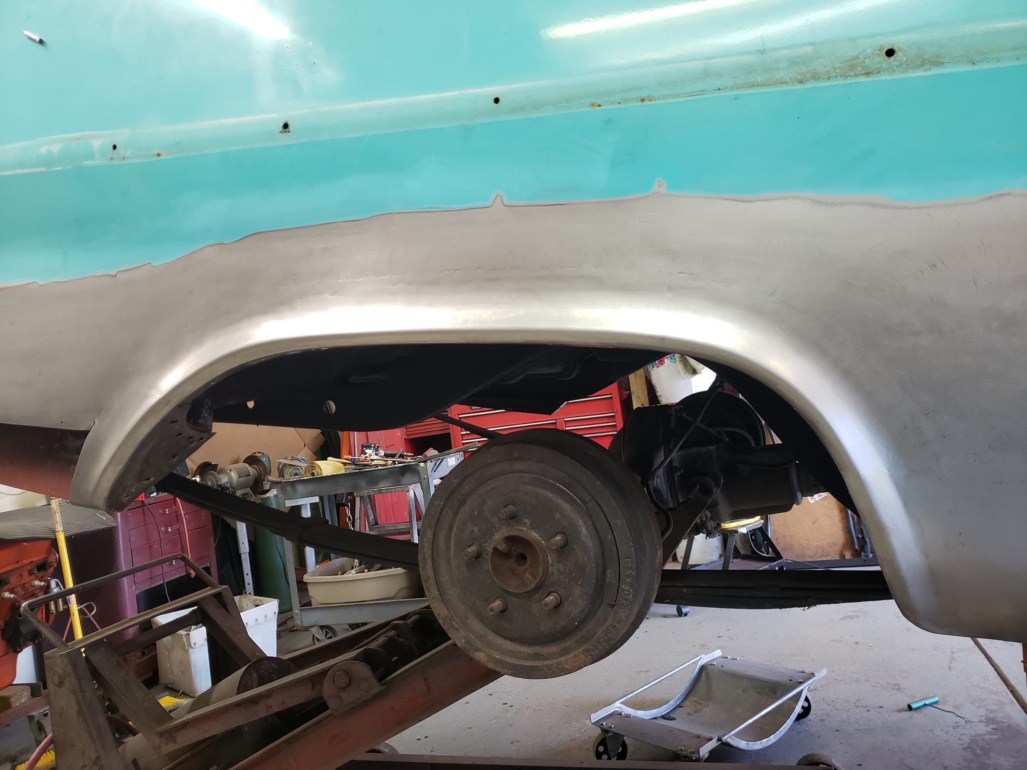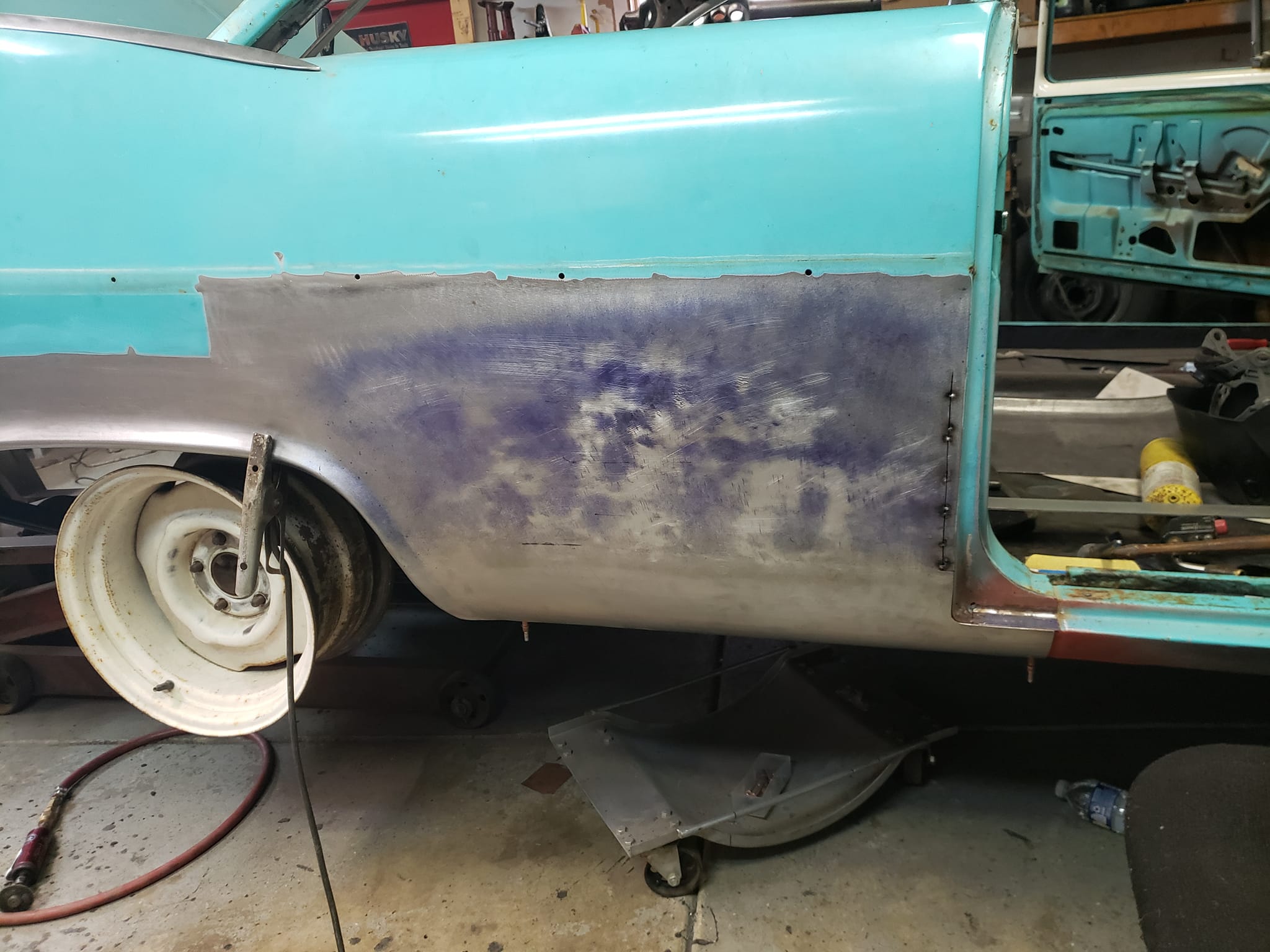 2023-04-08 Finally back on four wheels and getting a little sunlight after way too long. Drivers side quarter panel is basically done now. Time to move on to some other metal mods.