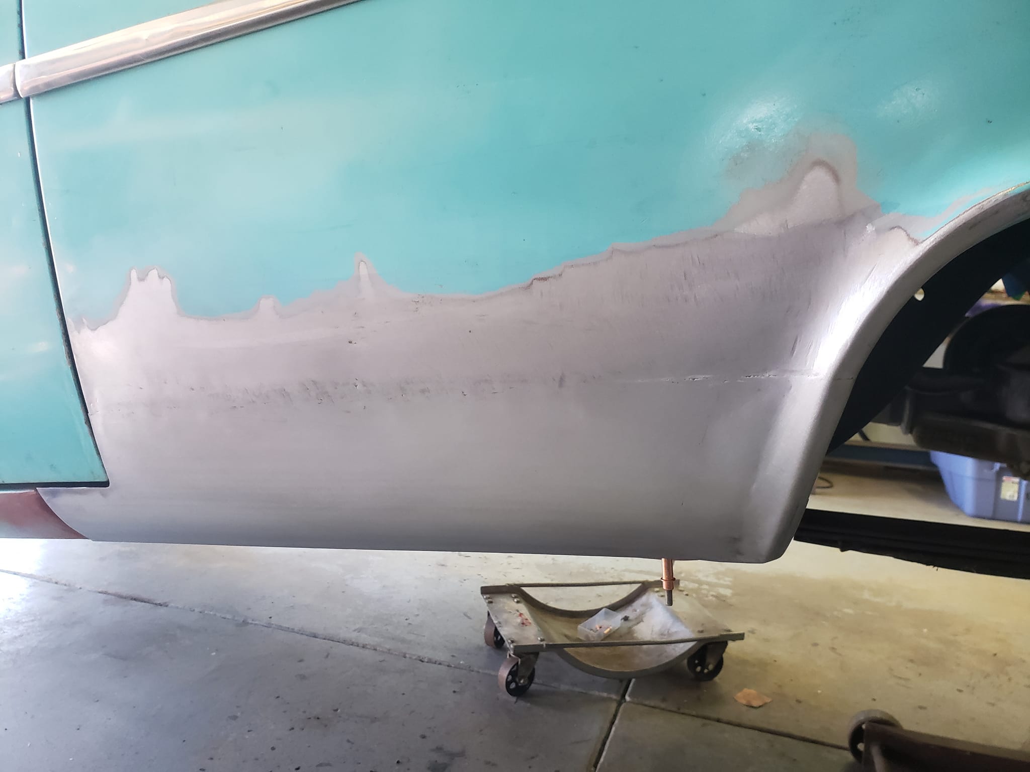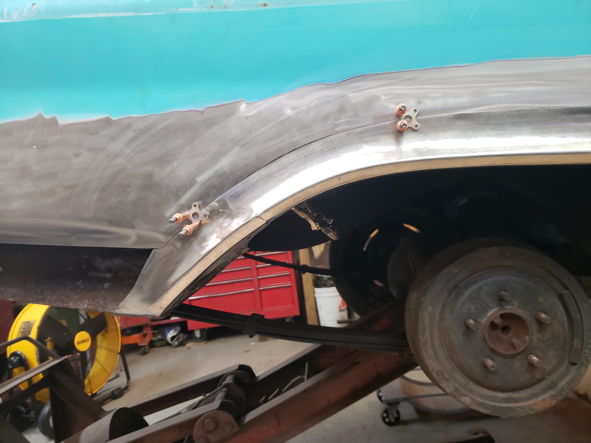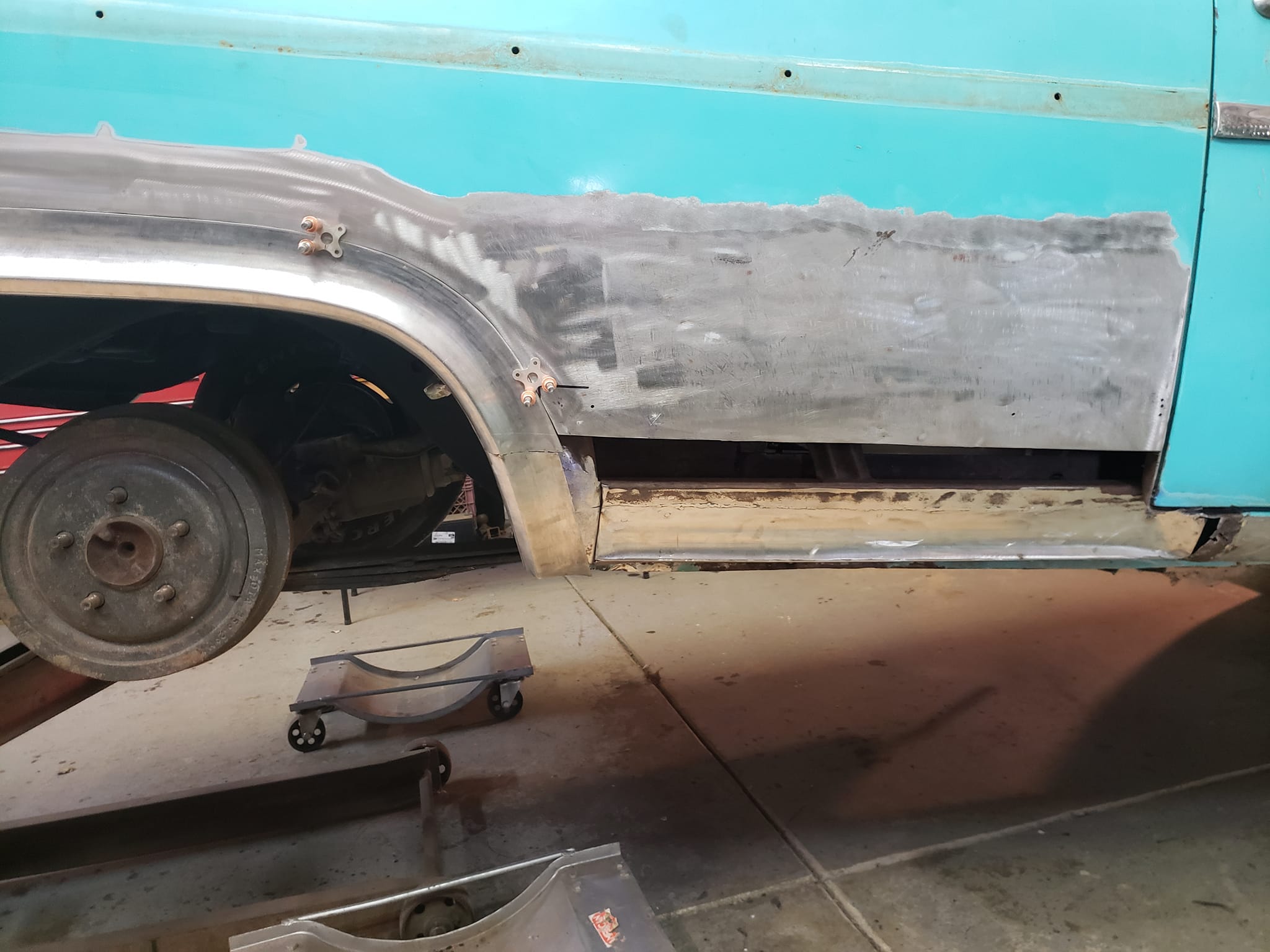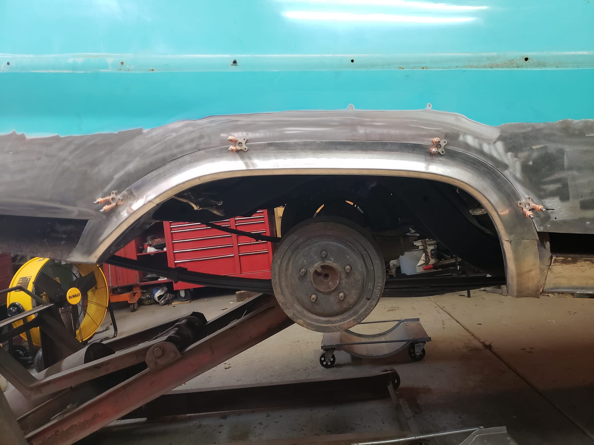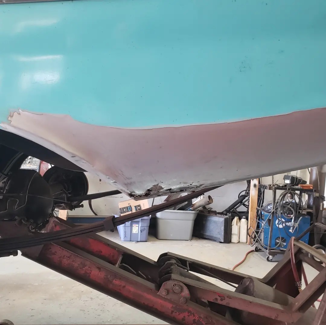 2023-04-08 Finally back on four wheels and getting a little sunlight after way too long. Drivers side quarter panel is basically done now. Time to move on to some other metal mods.
