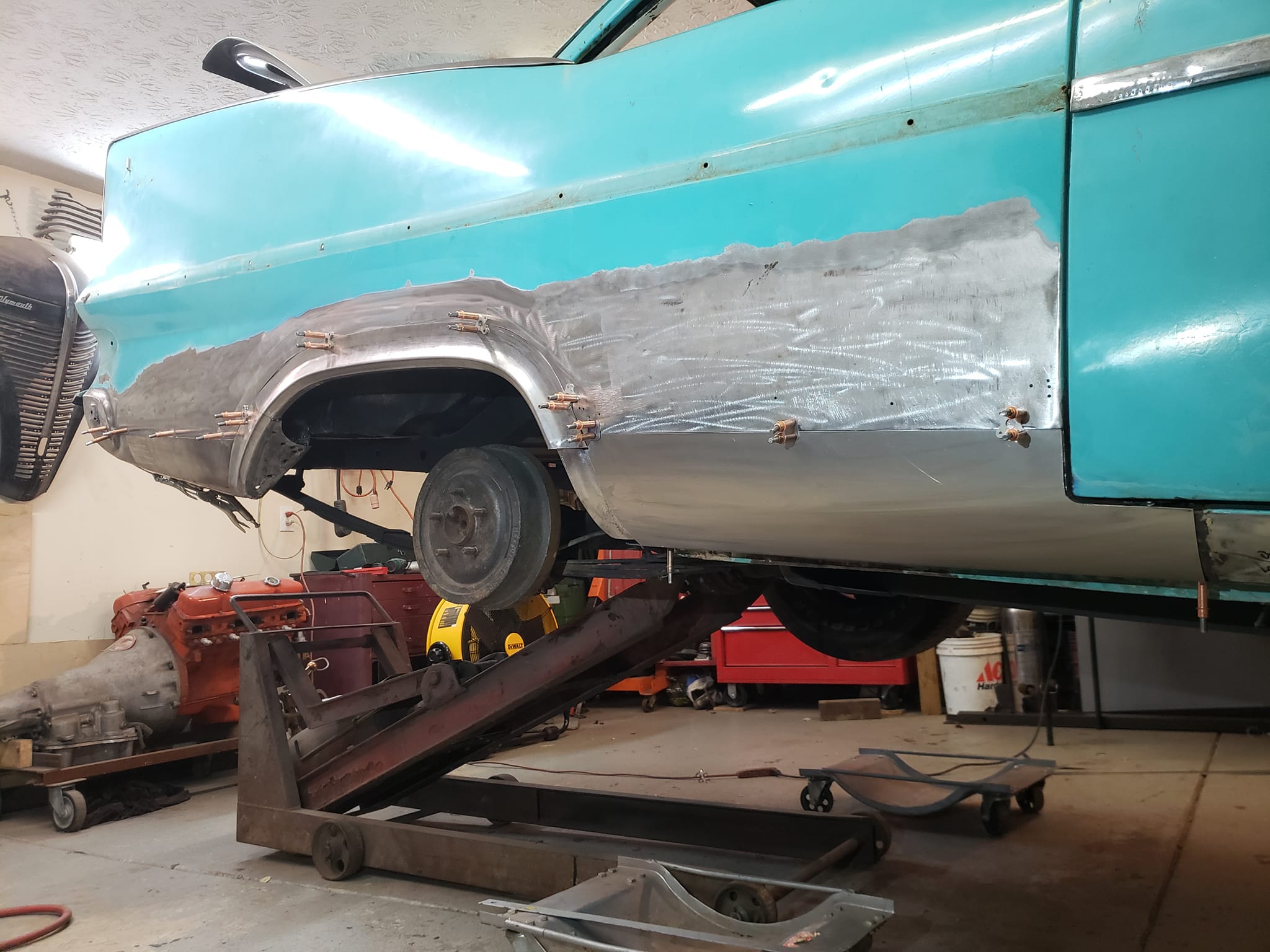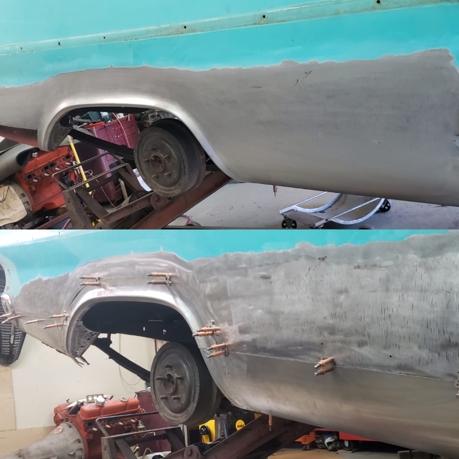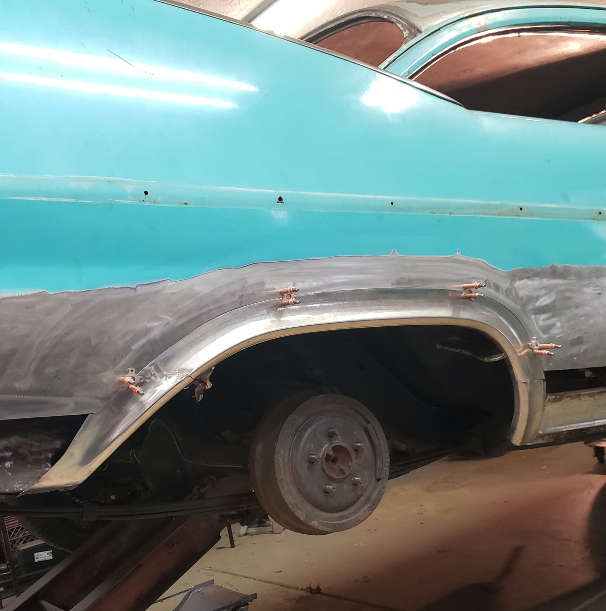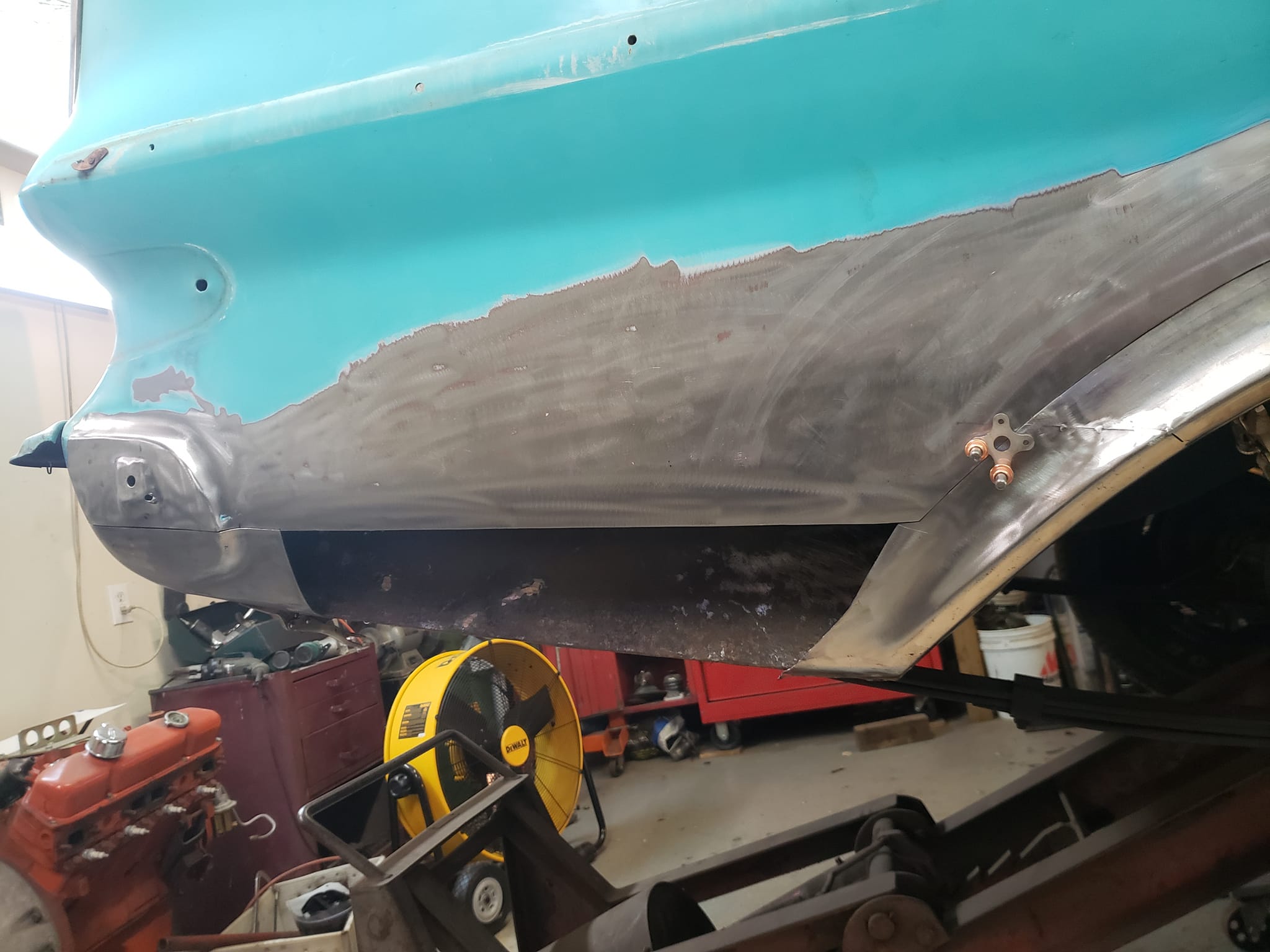 2023-04-08 Finally back on four wheels and getting a little sunlight after way too long. Drivers side quarter panel is basically done now. Time to move on to some other metal mods.