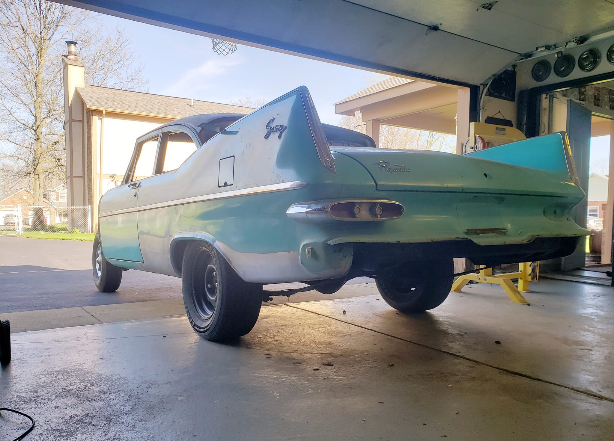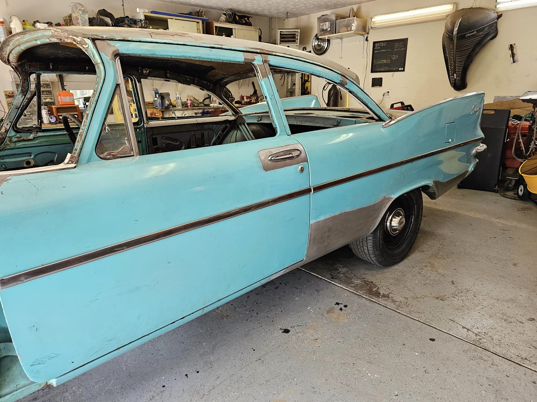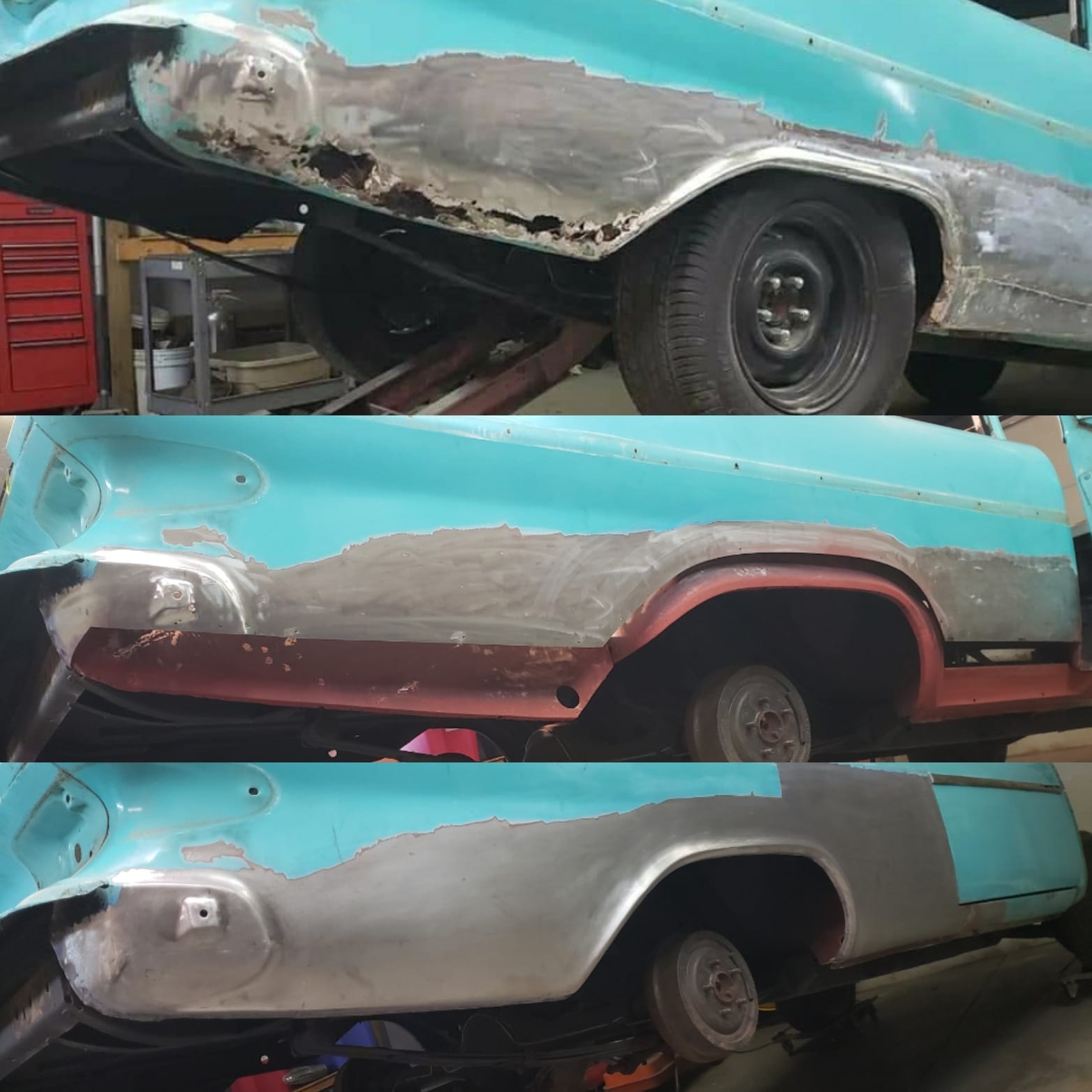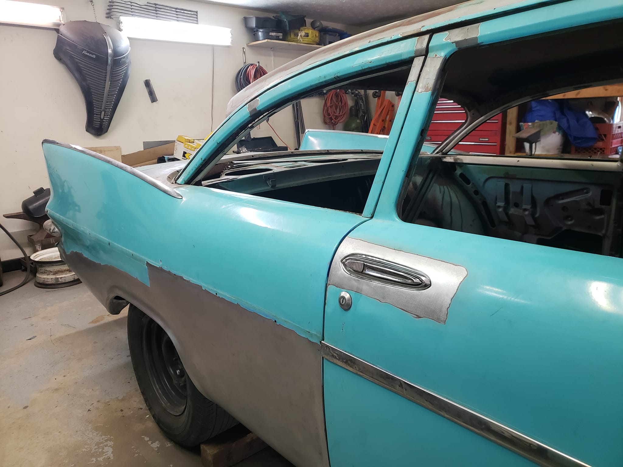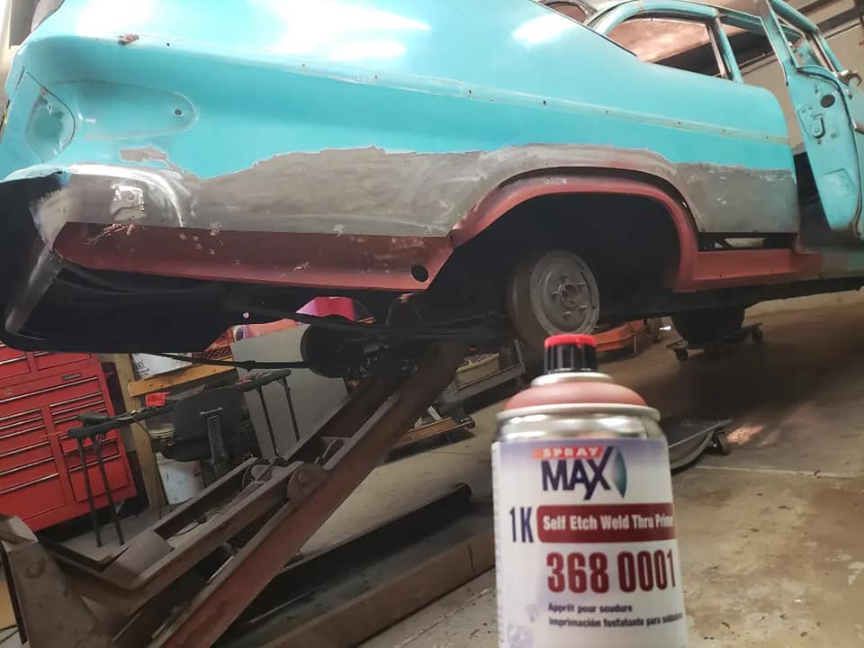 2023-04-08 Finally back on four wheels and getting a little sunlight after way too long. Drivers side quarter panel is basically done now. Time to move on to some other metal mods.