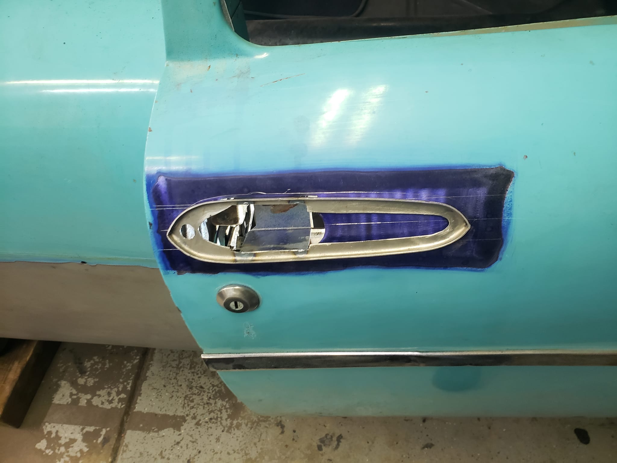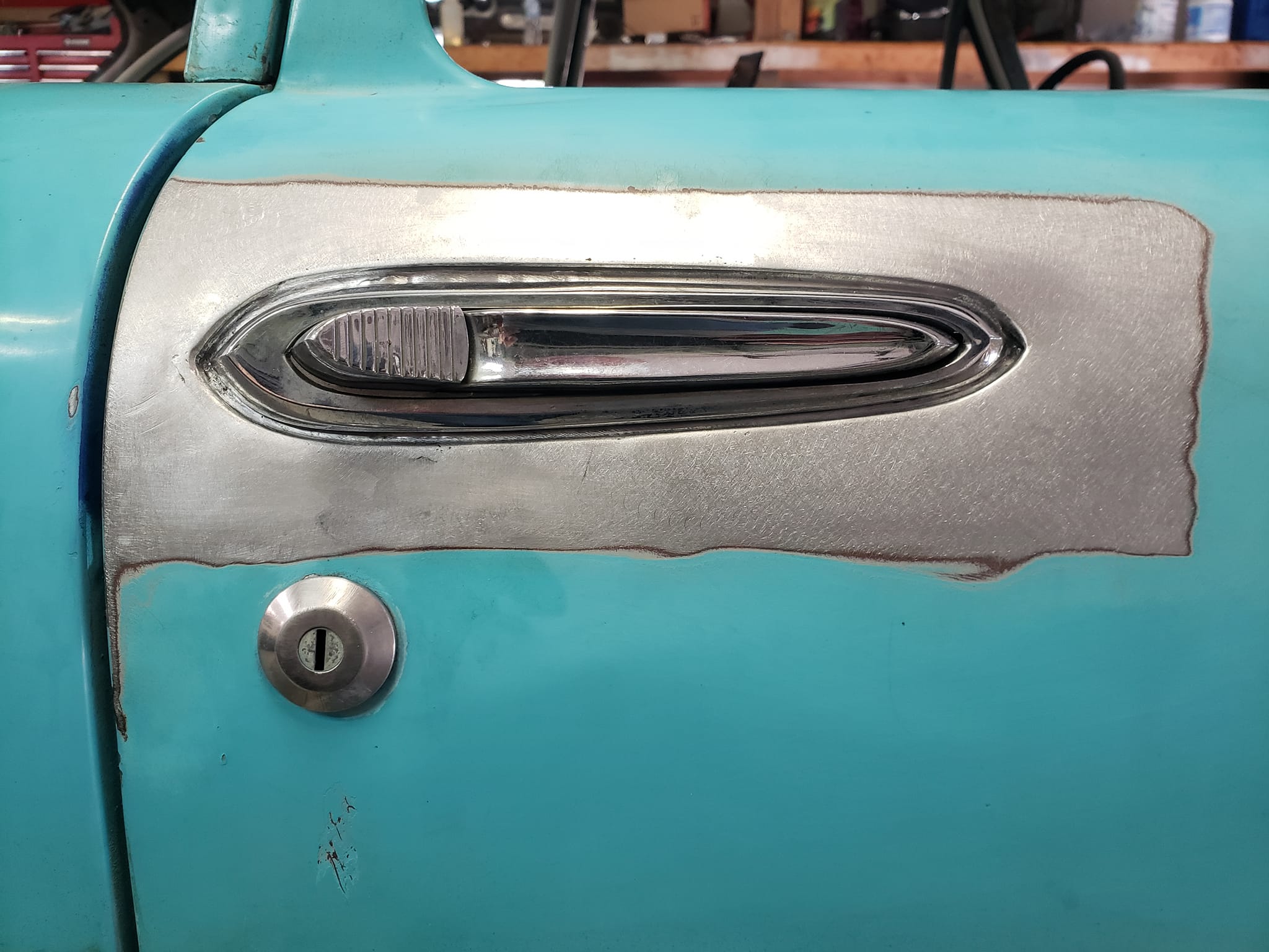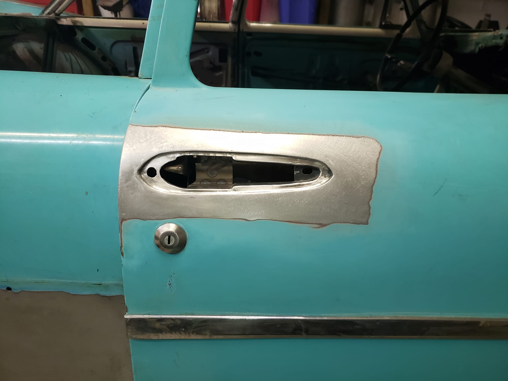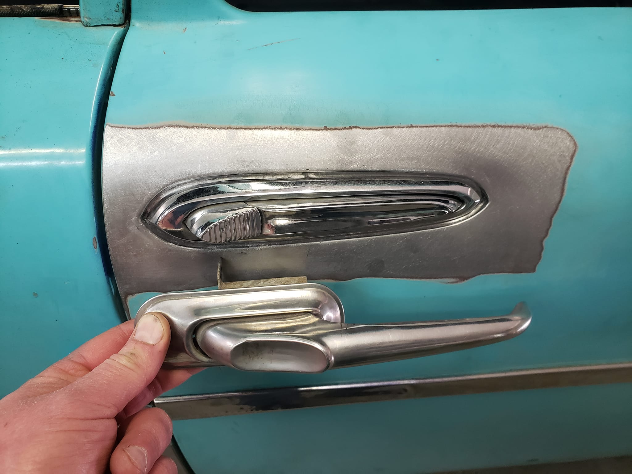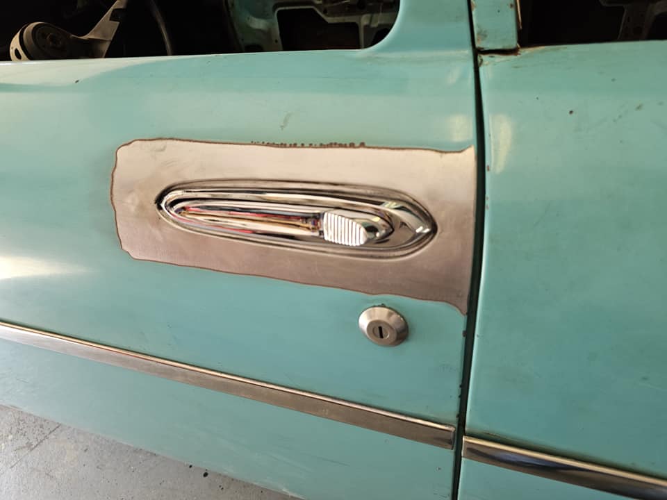 2023-04-29 The 55/56 Desoto door handle transplant was a success. I made an aluminum buck at work and used it to create the countersink shape the door handles would sit within. From there, I used that shape to build my door handle mechanism off of. I had no way of knowing if my handmade door latch mechanism was going to actually work until they were tack welded in the doors. Fortunately, the handles worked flawlessly the first try. I am pleased with the final results.