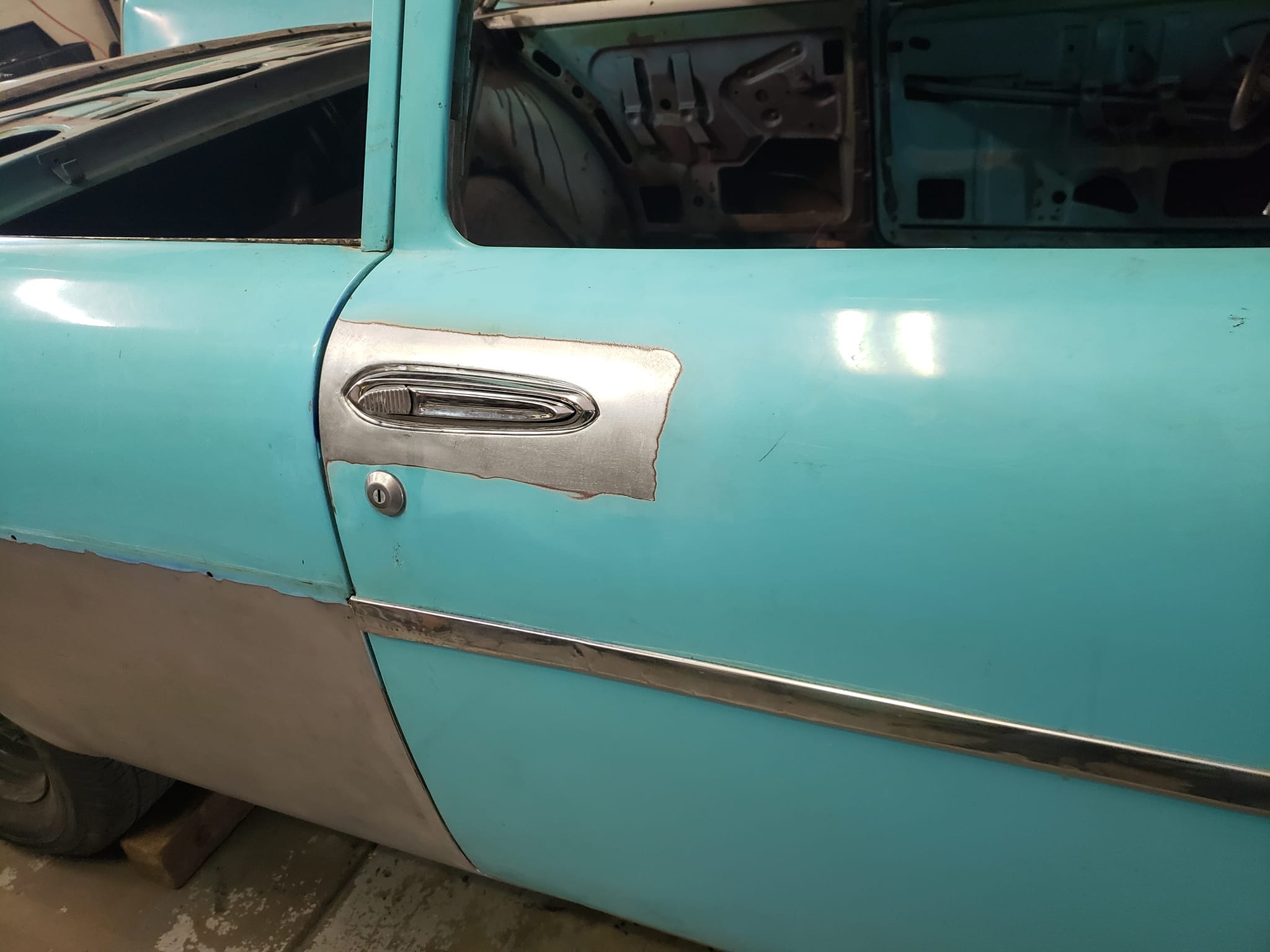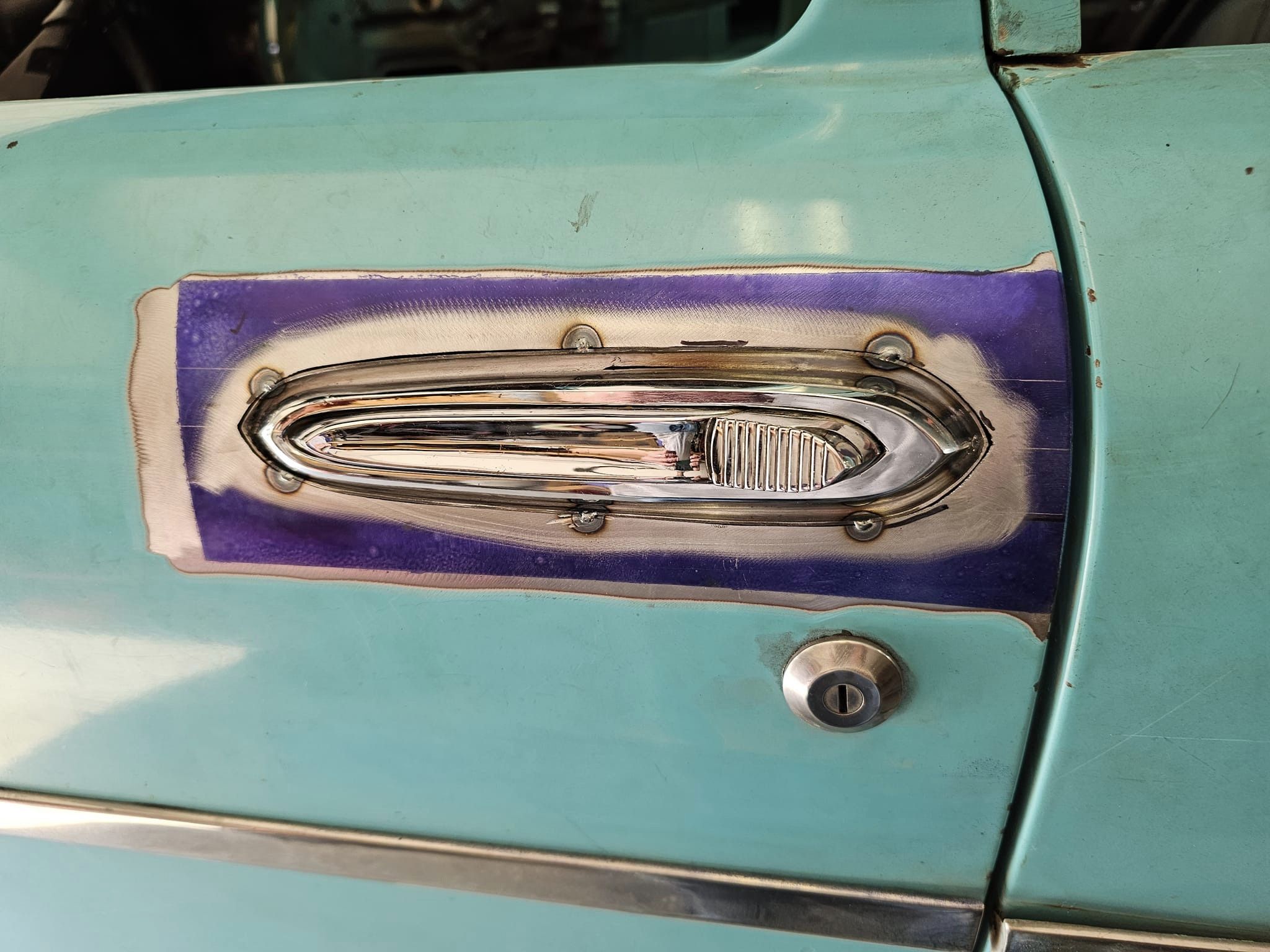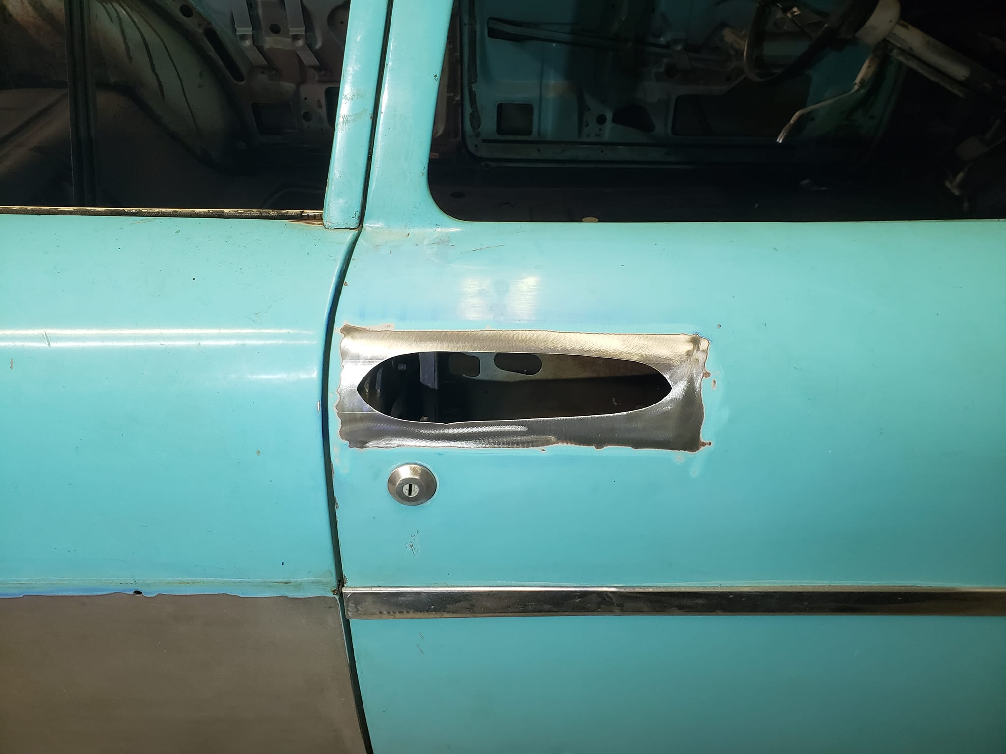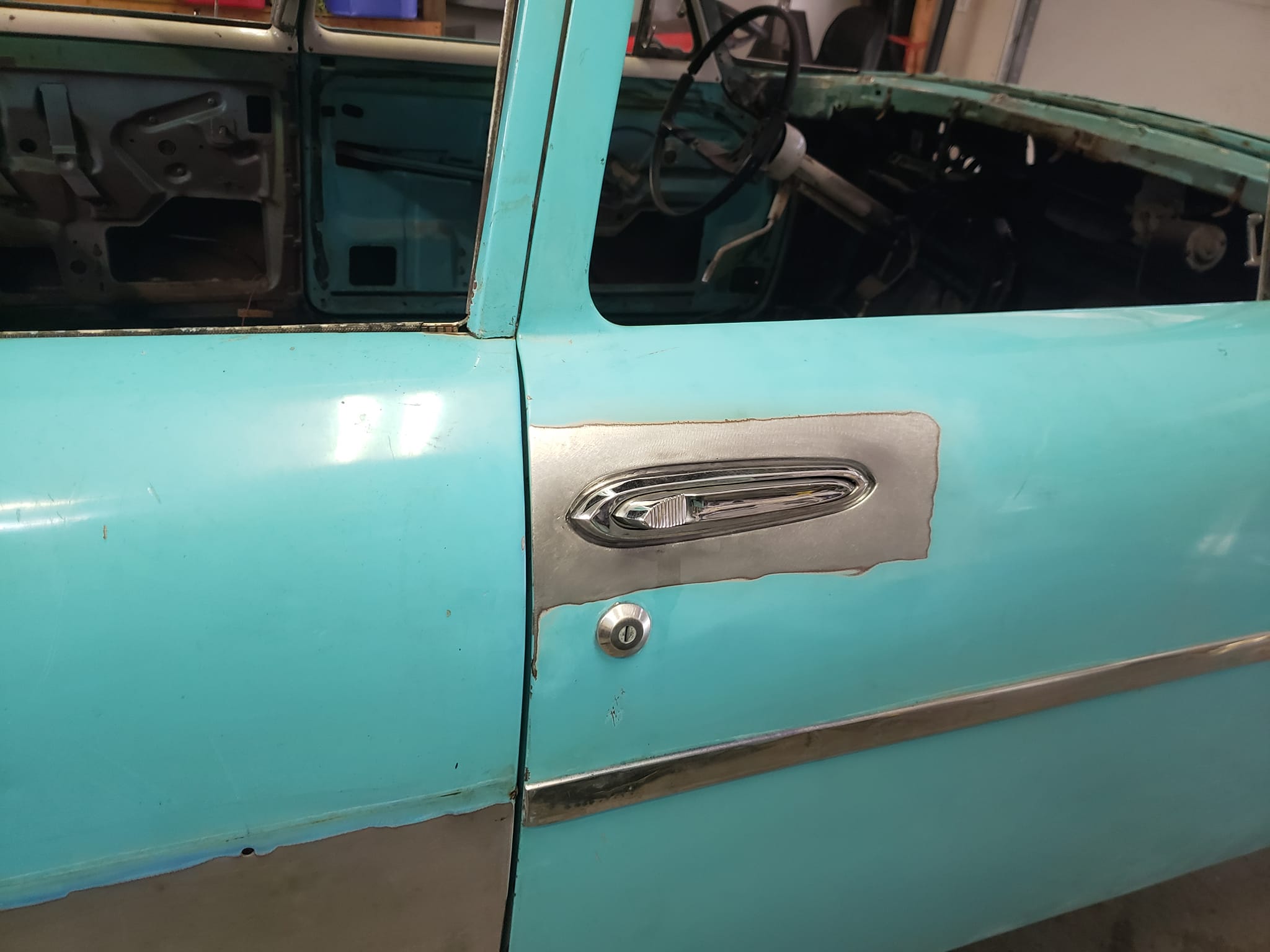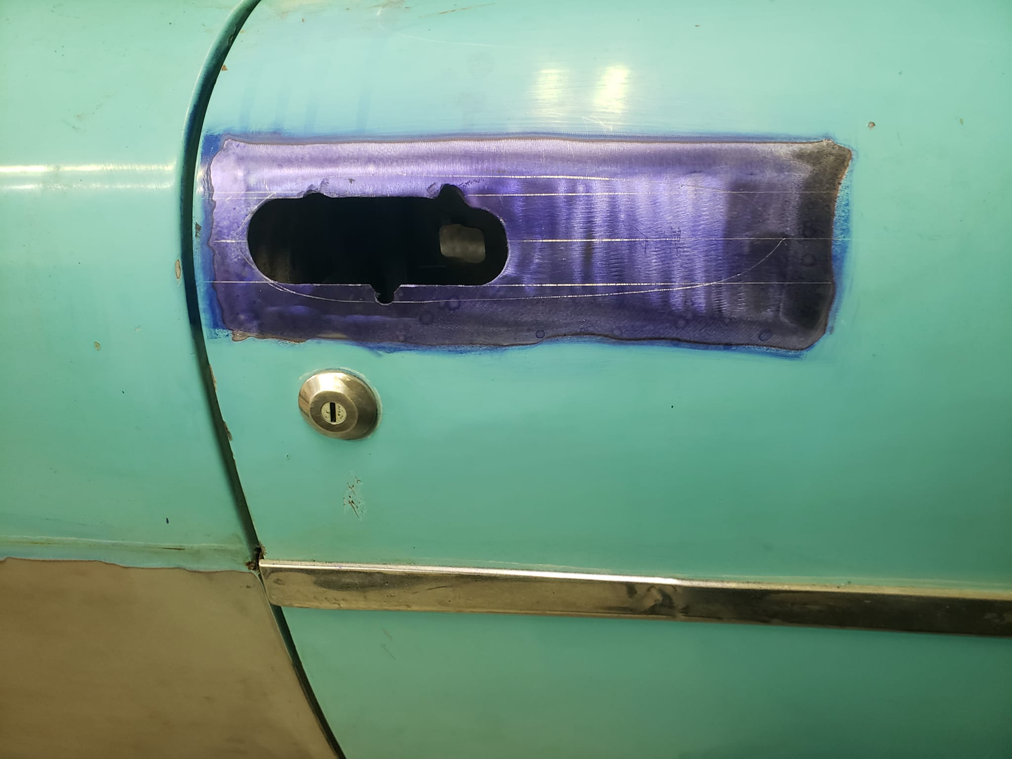 2023-04-29 The 55/56 Desoto door handle transplant was a success. I made an aluminum buck at work and used it to create the countersink shape the door handles would sit within. From there, I used that shape to build my door handle mechanism off of. I had no way of knowing if my handmade door latch mechanism was going to actually work until they were tack welded in the doors. Fortunately, the handles worked flawlessly the first try. I am pleased with the final results.
