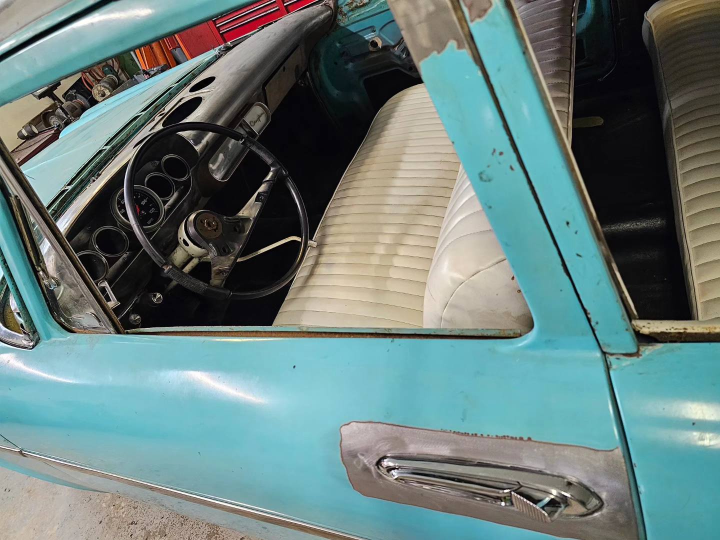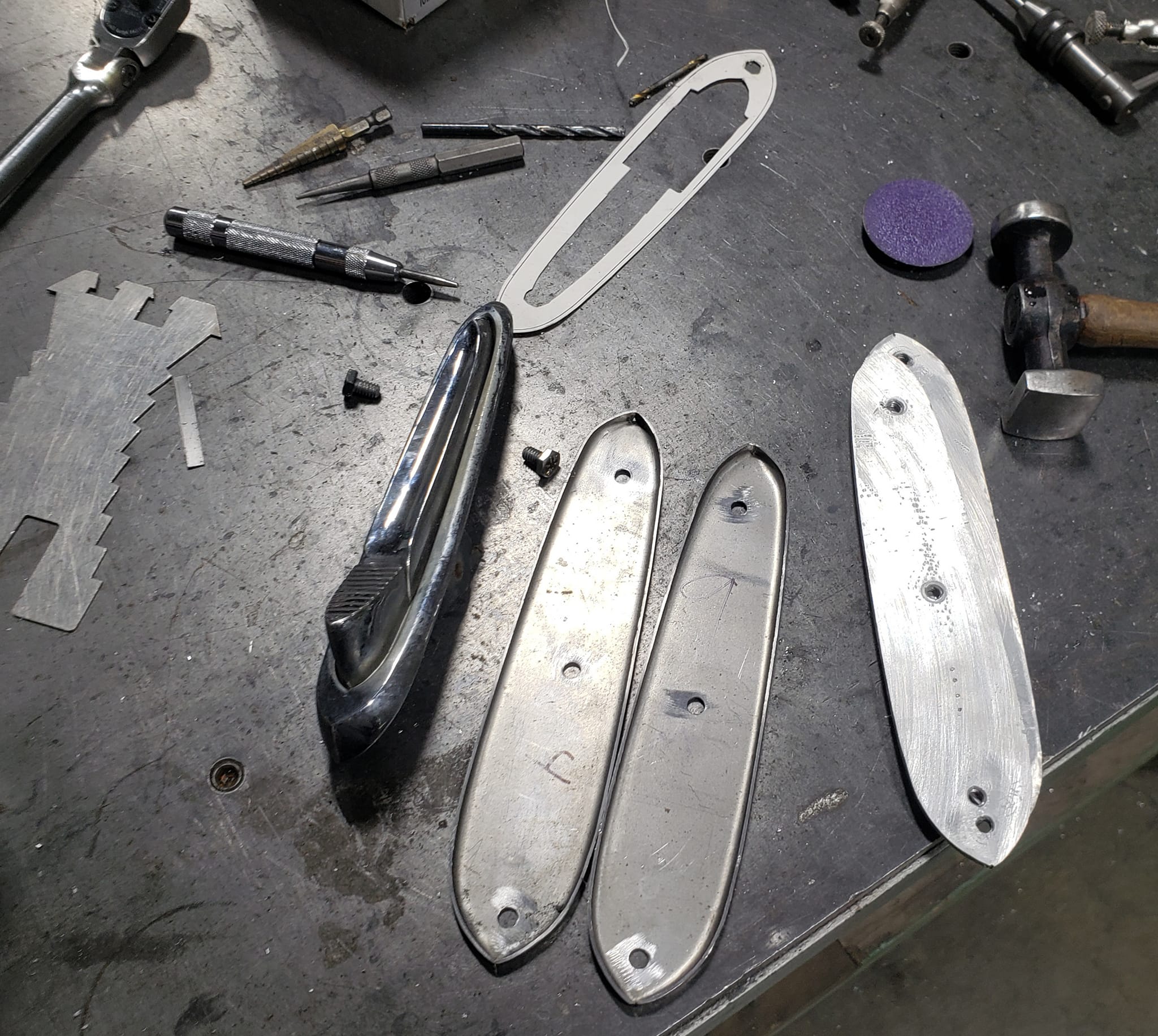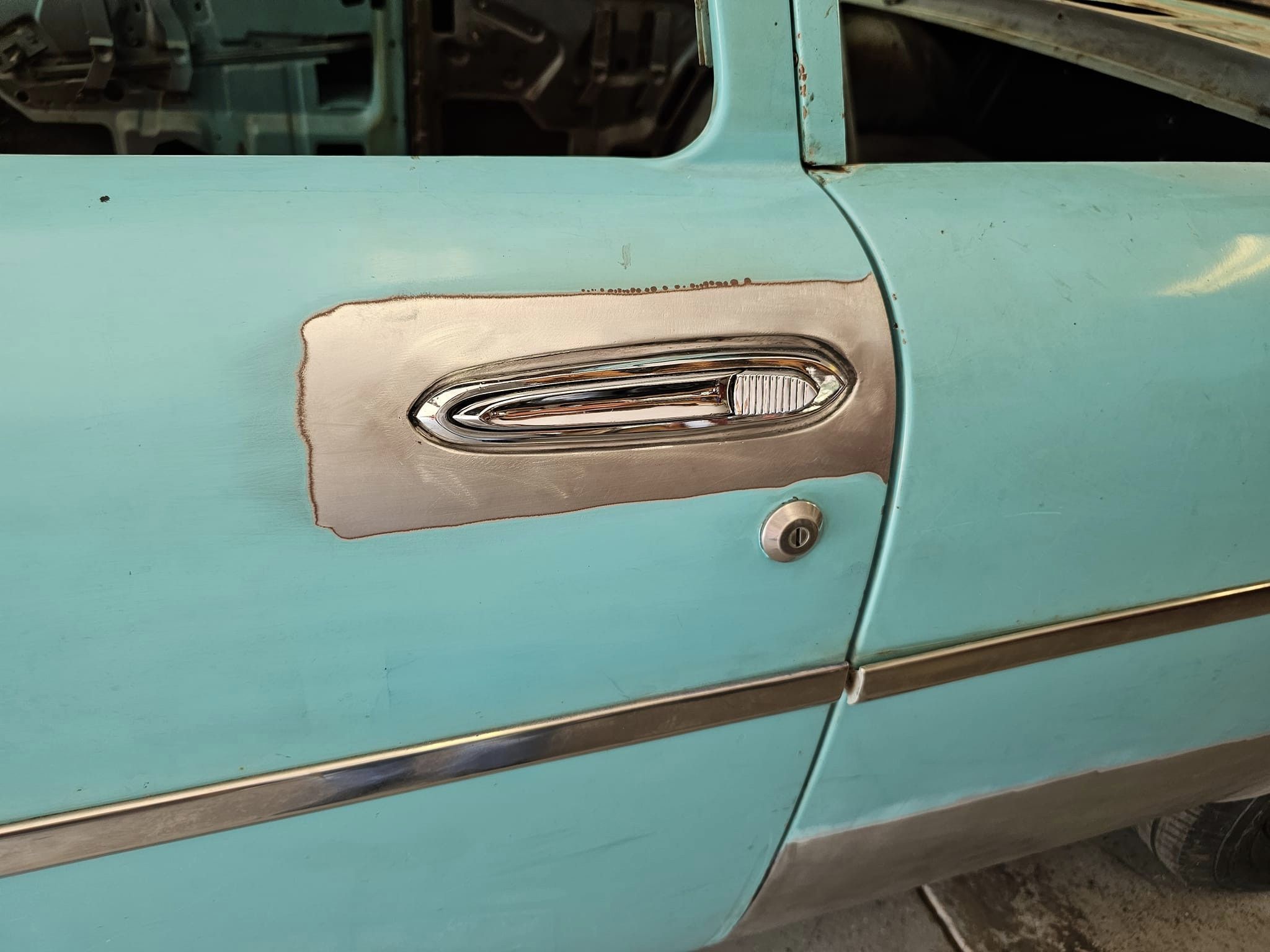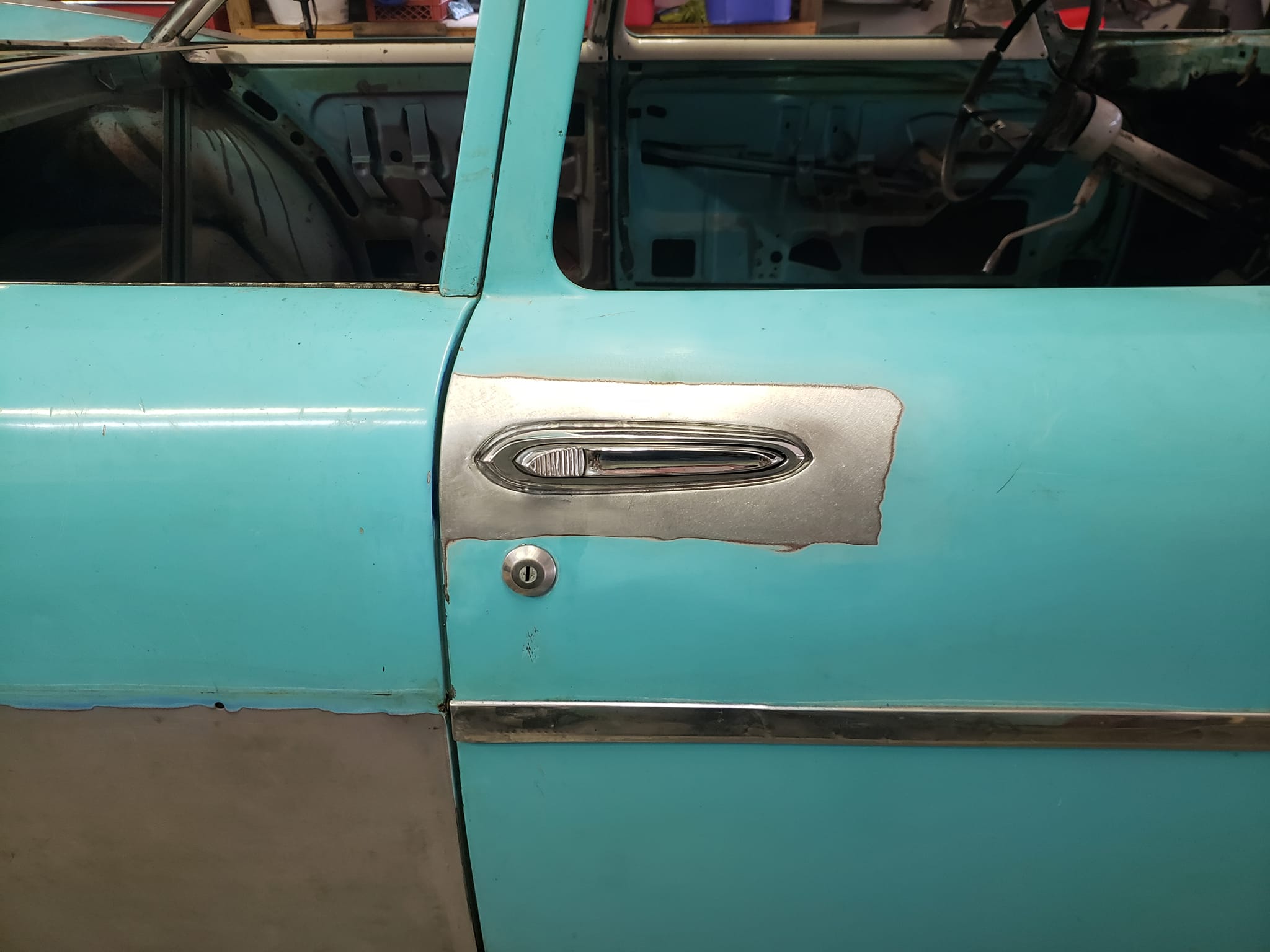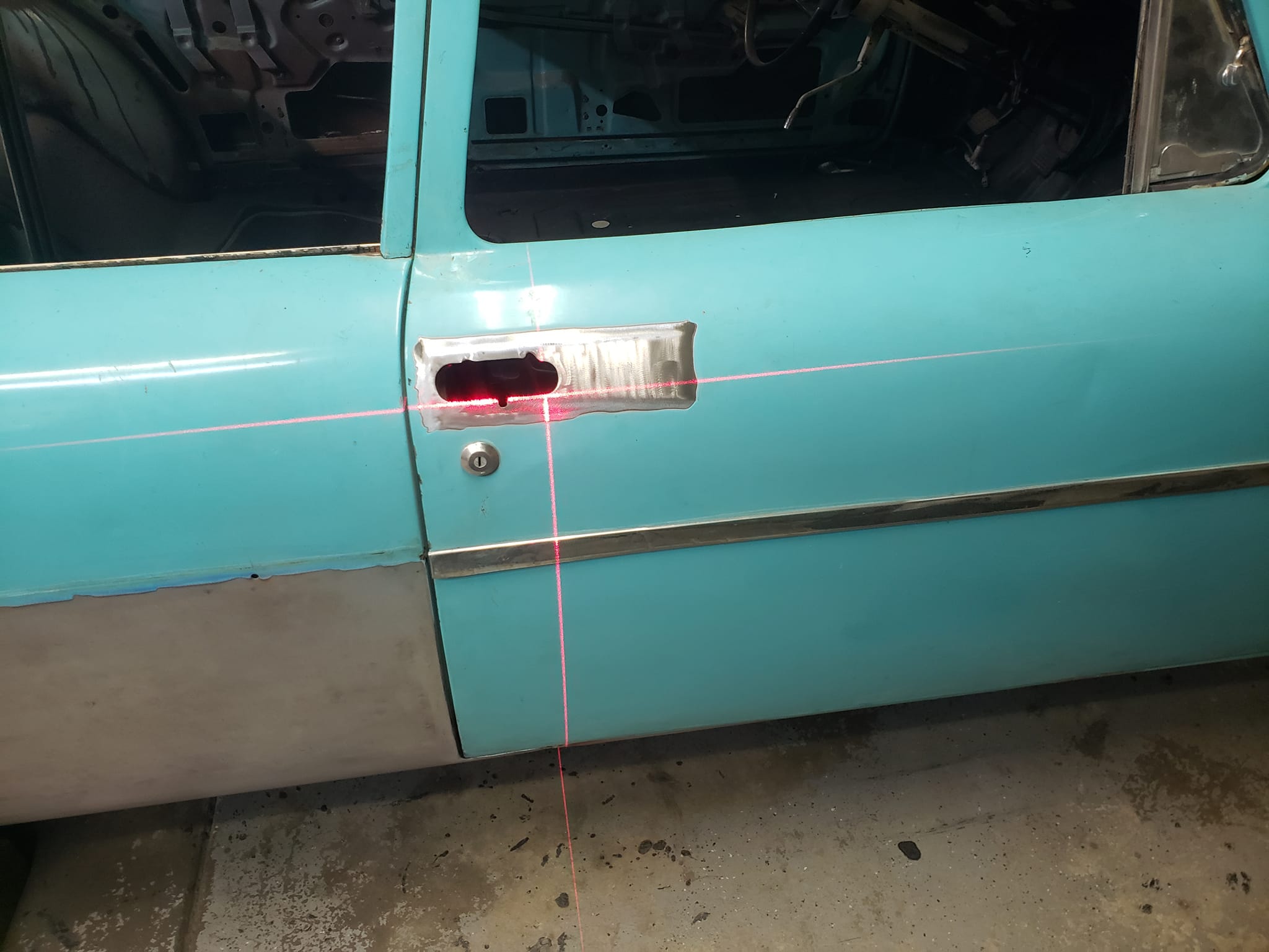 2023-04-29 The 55/56 Desoto door handle transplant was a success. I made an aluminum buck at work and used it to create the countersink shape the door handles would sit within. From there, I used that shape to build my door handle mechanism off of. I had no way of knowing if my handmade door latch mechanism was going to actually work until they were tack welded in the doors. Fortunately, the handles worked flawlessly the first try. I am pleased with the final results.