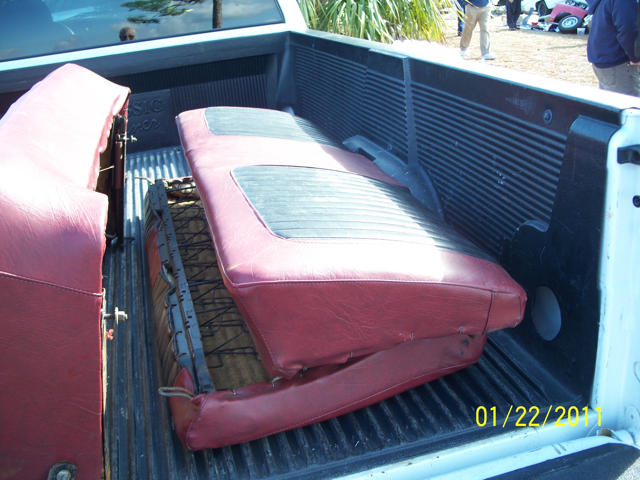 I went to a MOPAR CAR SHOW / SWAP MEET today in Melbourne, Fl. about 118 miles from here. Ther were at lease 250 cars and lots of parts vendors. I just happend to find a complete set of seats out of a 67 Barracuda in excellent condition (No Rust), front bench with an armrest and the back seats for only $150.00. they are about 3" narrower than the swivel seats in Greenie but I can make them work. The guy goes fishing here reguarly so he will bring them to me. I had my Desoto so I’m grateful for that. Meanwhile I will be looking for the correct seats and if I find them I can easily get my money back on these, maybe even more. See pitchuhs.