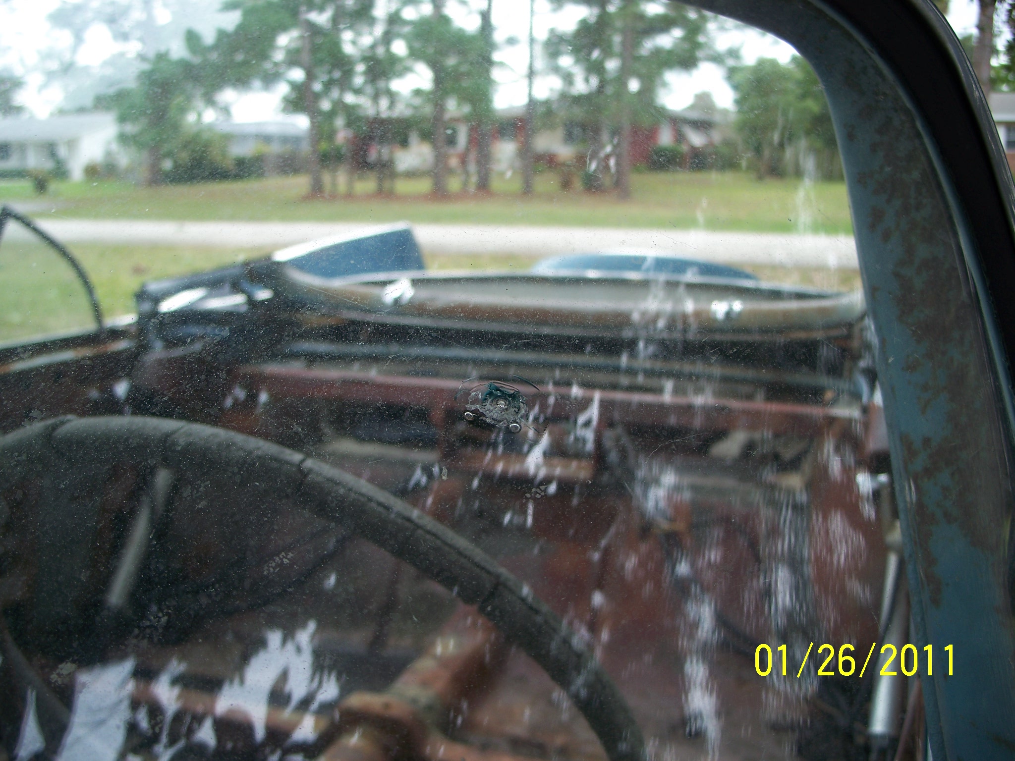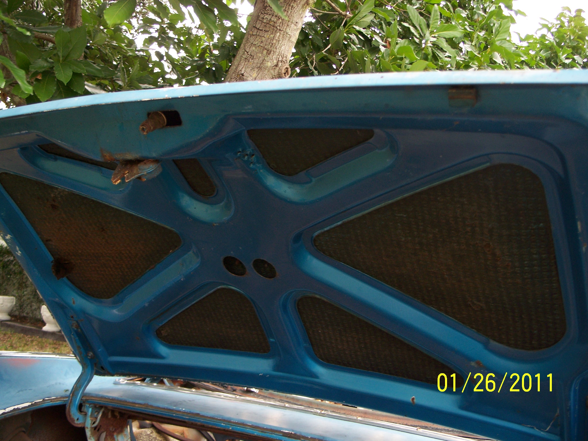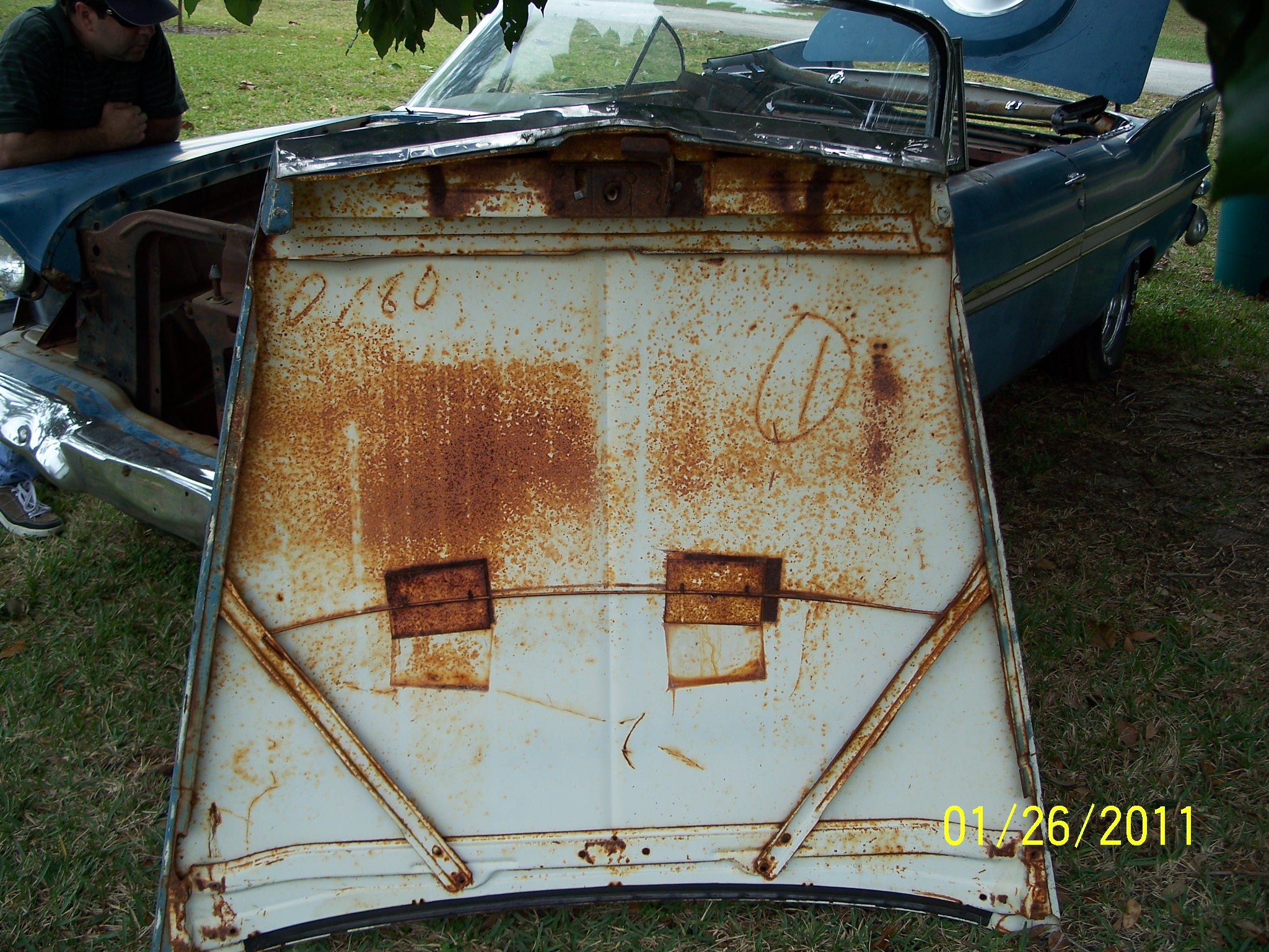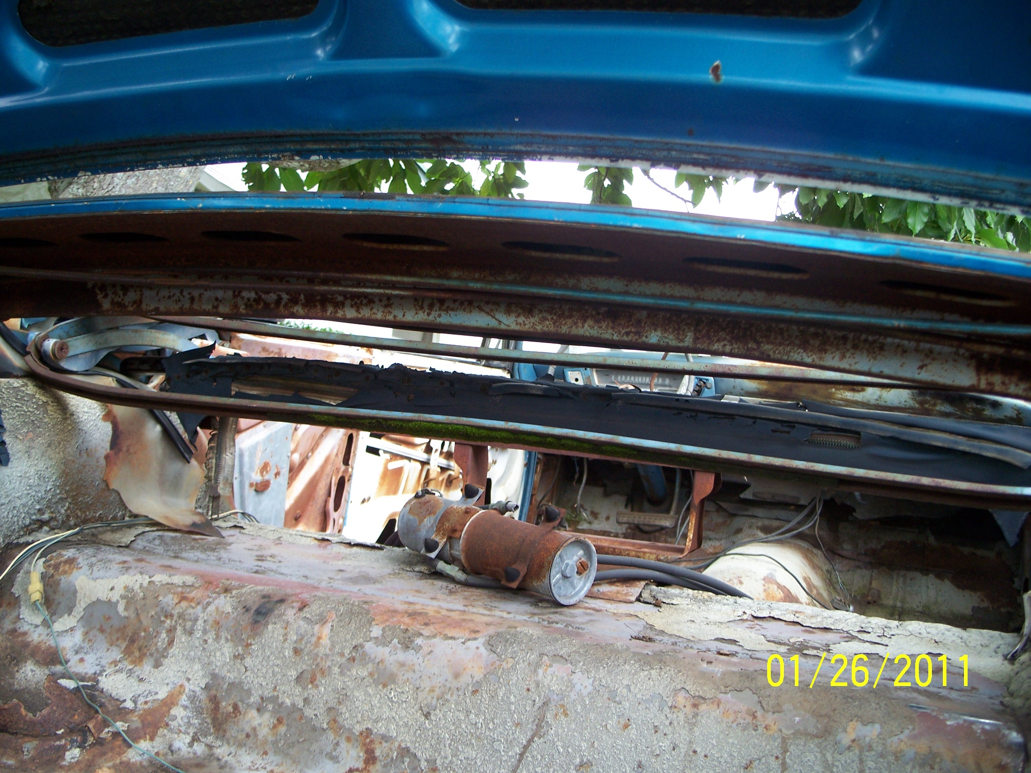 Alright, Already, Hold your britches on, Here are the pitchuhs. It’s about what I expected, the body overall is in better shape than the red and white one I’m doing right now. I’m reasonable sure it was originall white. The windshield has a fisheye, looks to have been made by a BB. Windshield will stay, I can live with it. No seats, there is a seat spring but can’t figure where it goes. It has snaps on it. One of those hard to find pieces that goes over the top cylinder is missing. It will need new floors and inner rockers, the outer rockers seem to be OK. It will need lower rear outer quarters but I think the trunk floor is saveable. The dash is all screwed up but I have a complete one in my parts car. It has power steering but standard brakes, I will put power brakes in it. The inner fenders have been cut for (headers maybe) the frame is real good. Ther is some kind of tag on the firewall held on with a screw right in the middle, I will take it off and clean it up, it is probably a door tag, it looks to big to fit on the cowl. Yea, the gas tank is there, no surface rust on bottom. It will be a long slow process but I’m up to it.