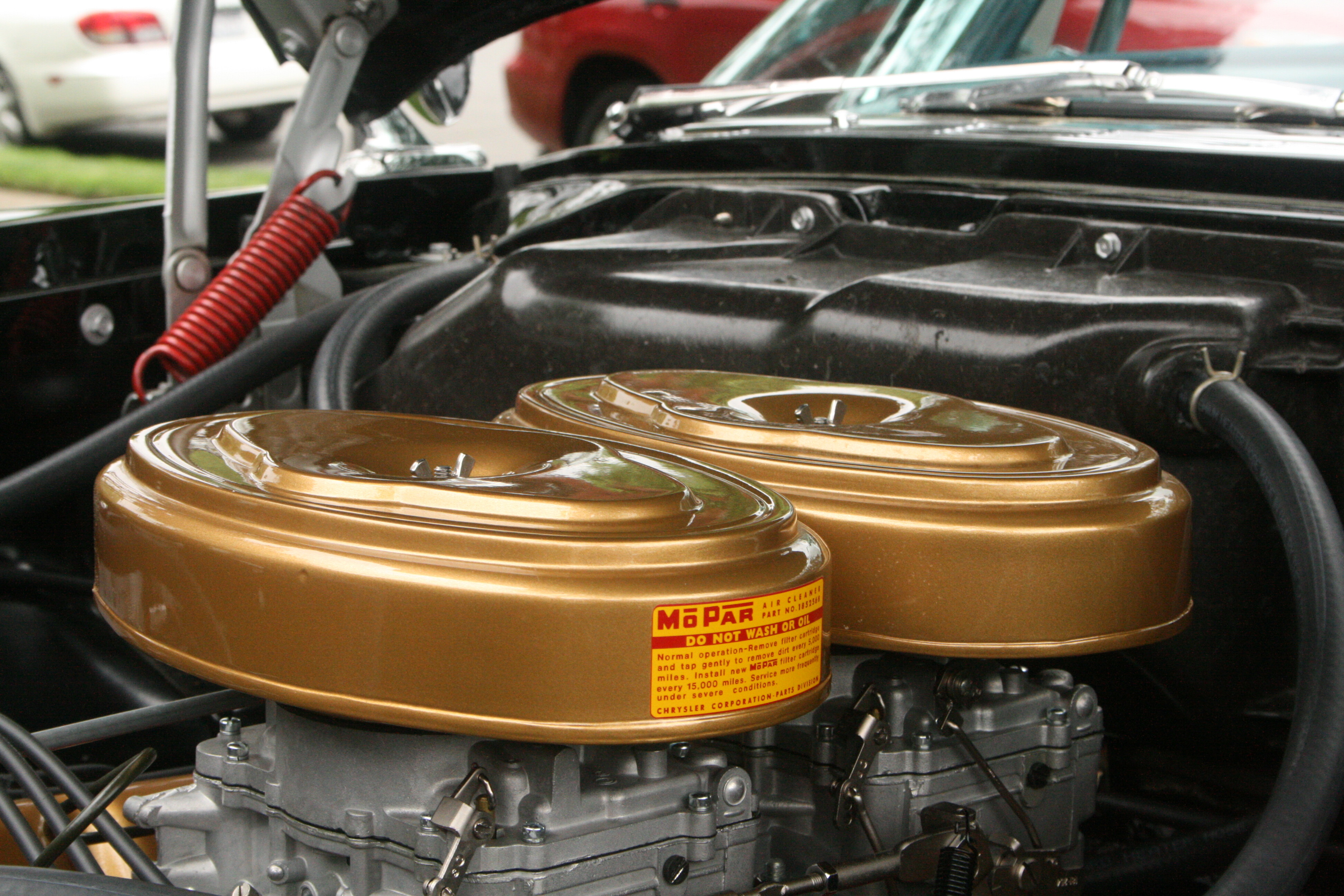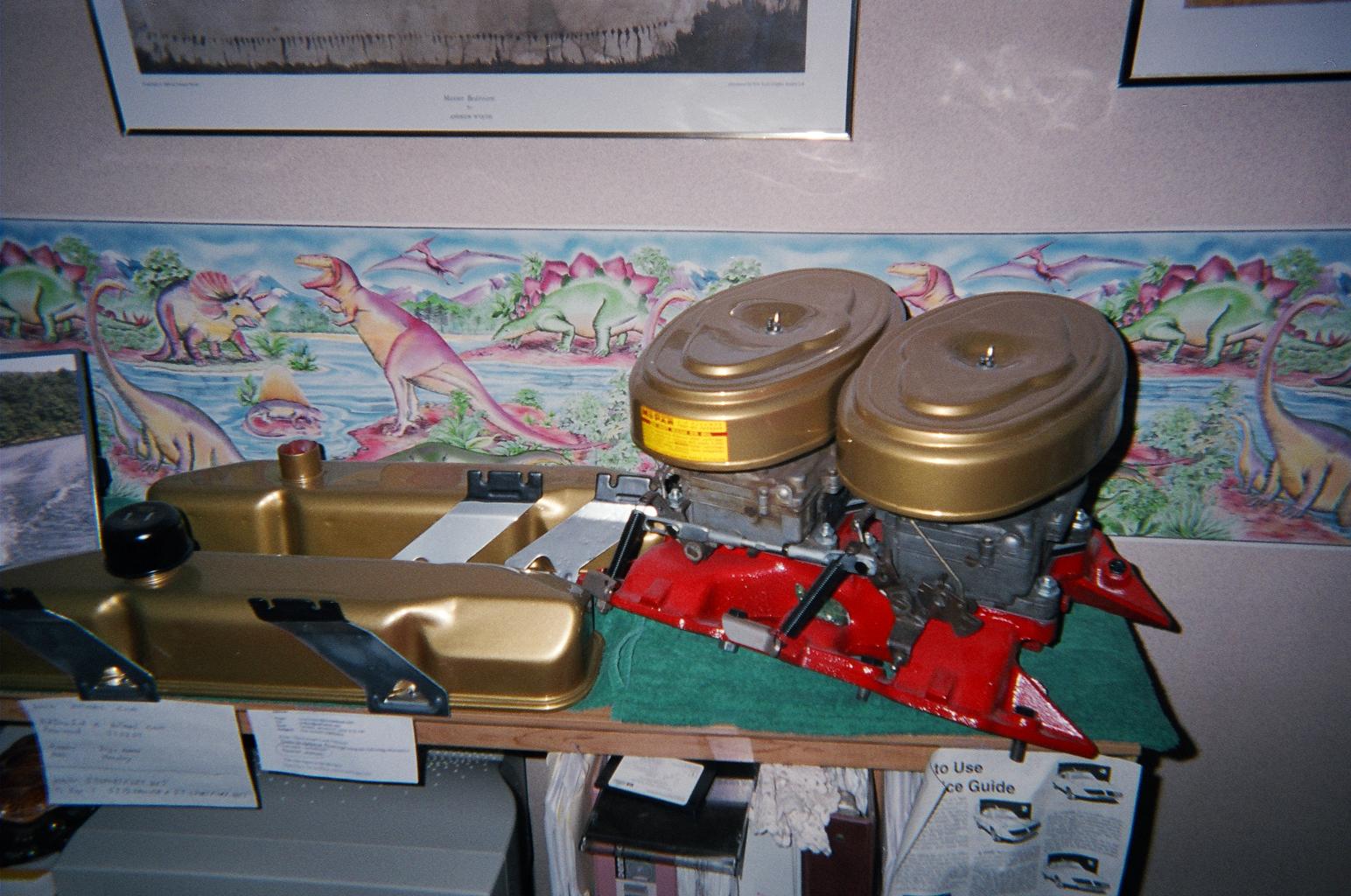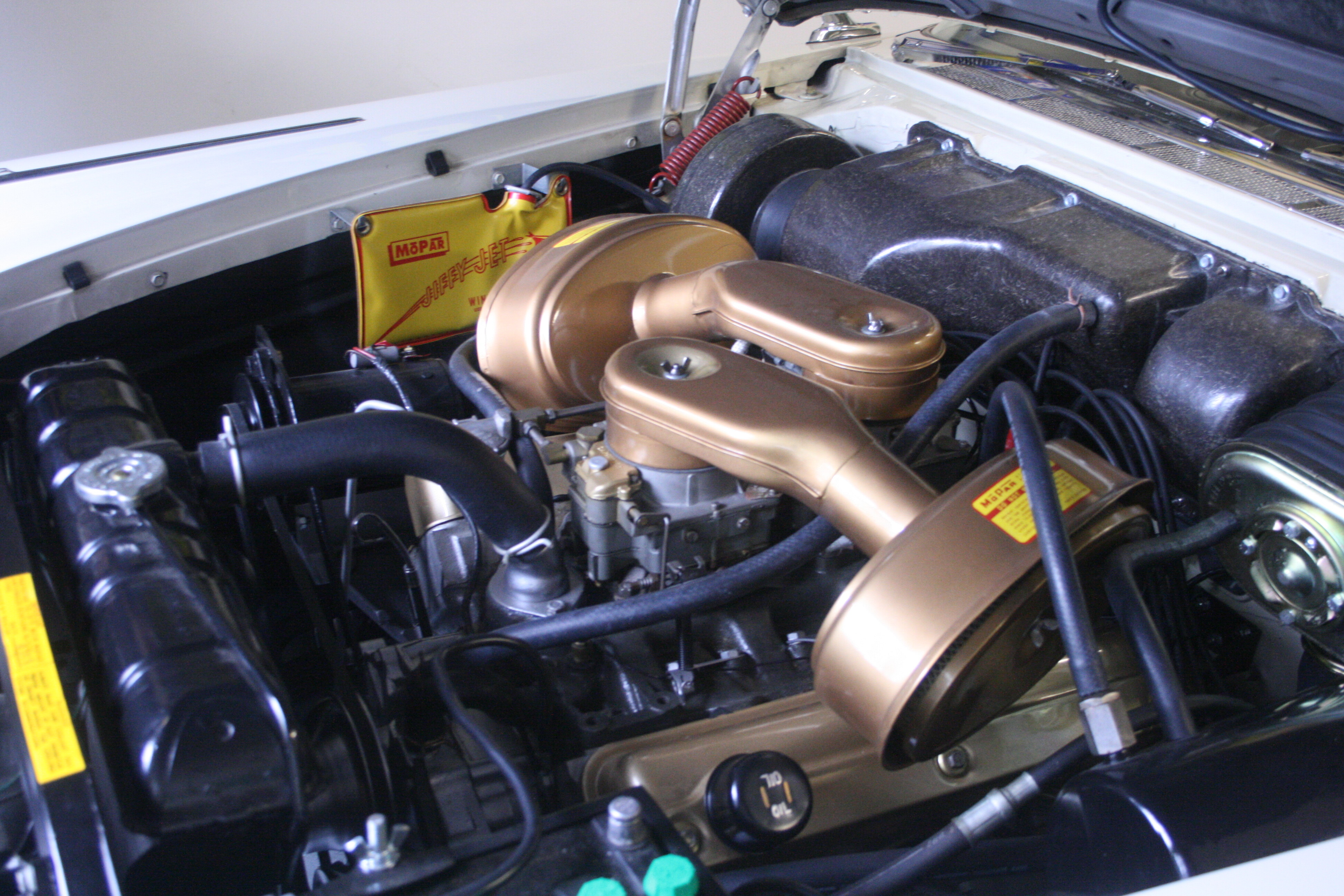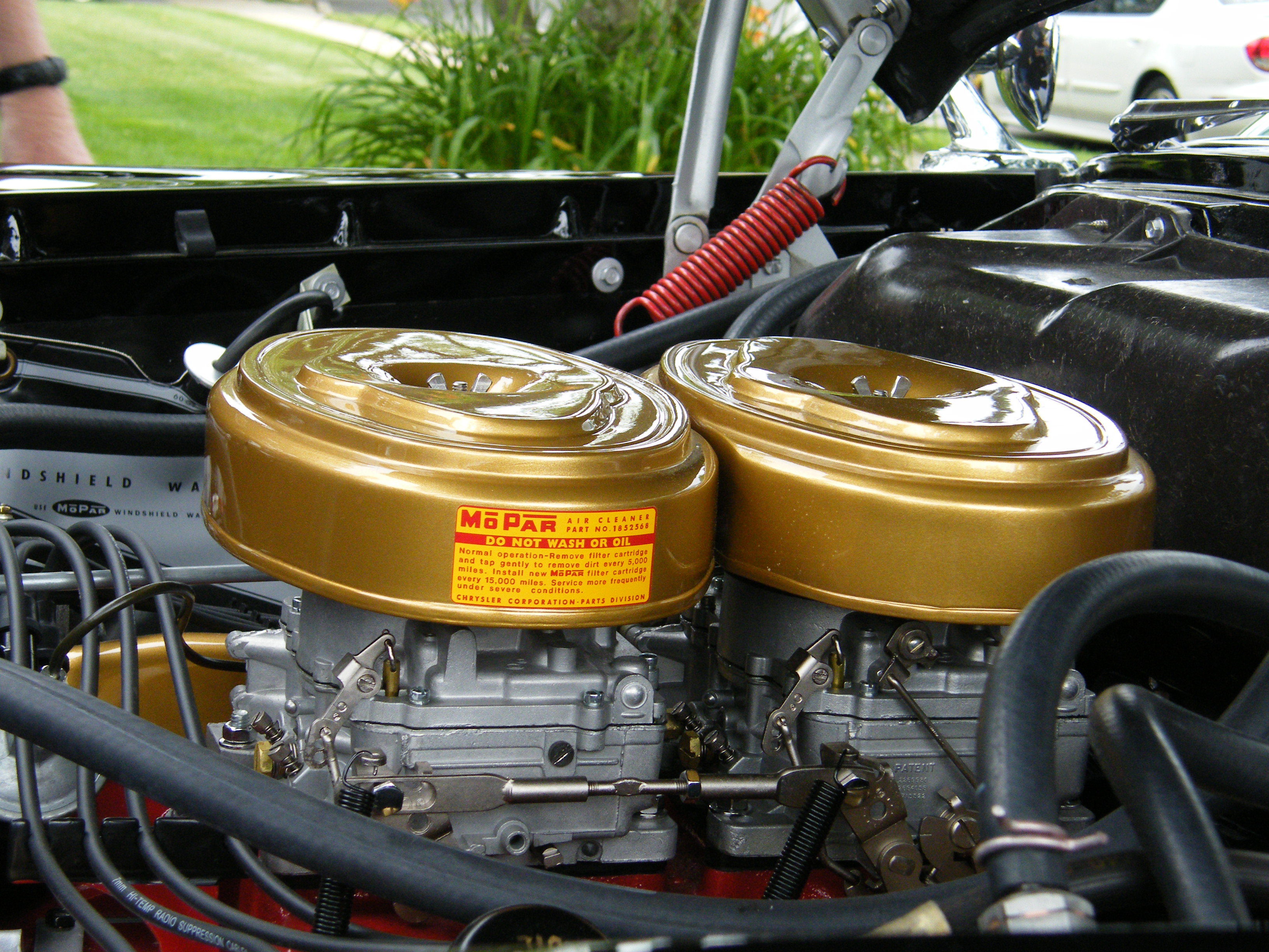After a complete tear down and inspection I was so pleased to find everything standard size along with brackets and looms I never thought existed. I have acquired most of the new engine internals for the rebuild and have started ‘preparing’ the externals to go back together. It will be totally factory stock – with factory plymouth golden commando colors – along with the dual quad option. The only thing I am taking liberty with is the color of the bolt heads. There was just too much red on this engine!