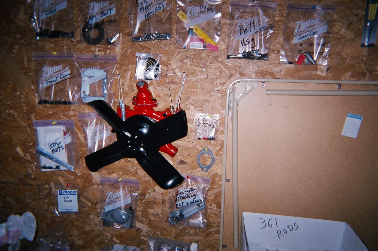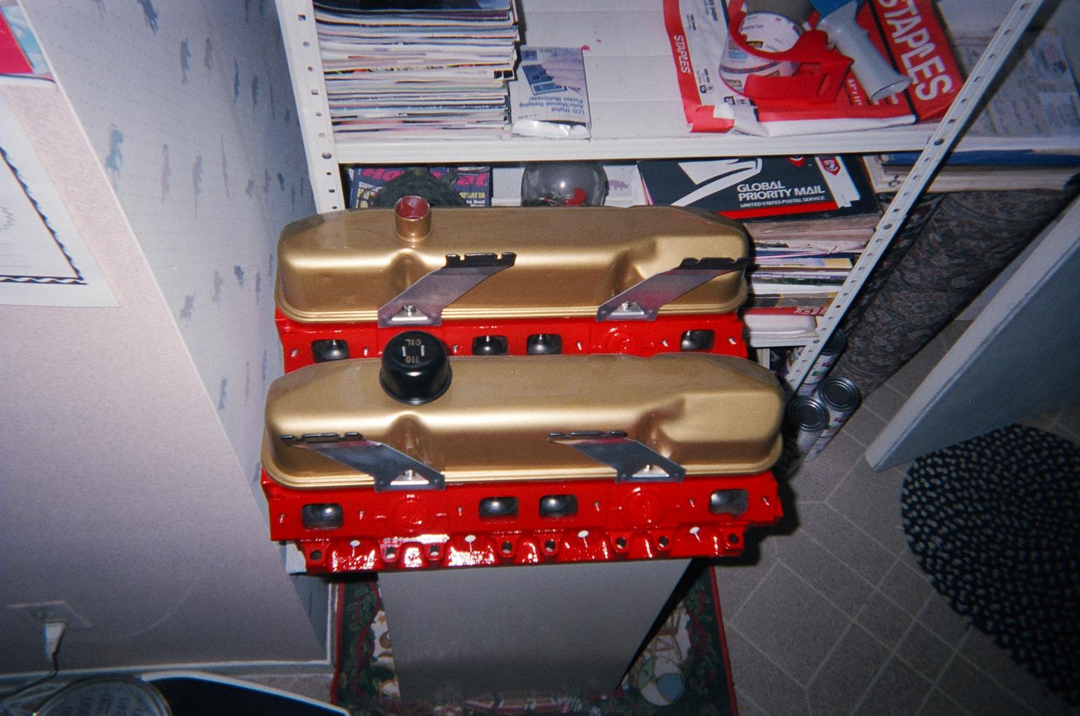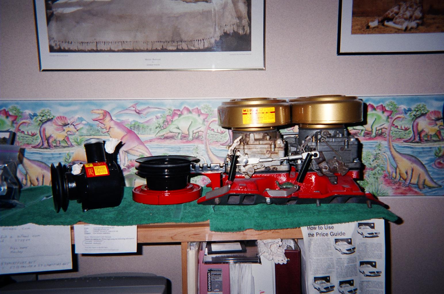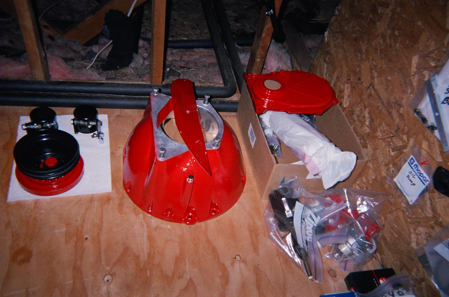 After a complete tear down and inspection I was so pleased to find everything standard size along with brackets and looms I never thought existed. I have acquired most of the new engine internals for the rebuild and have started ‘preparing’ the externals to go back together. It will be totally factory stock – with factory plymouth golden commando colors – along with the dual quad option. The only thing I am taking liberty with is the color of the bolt heads. There was just too much red on this engine!