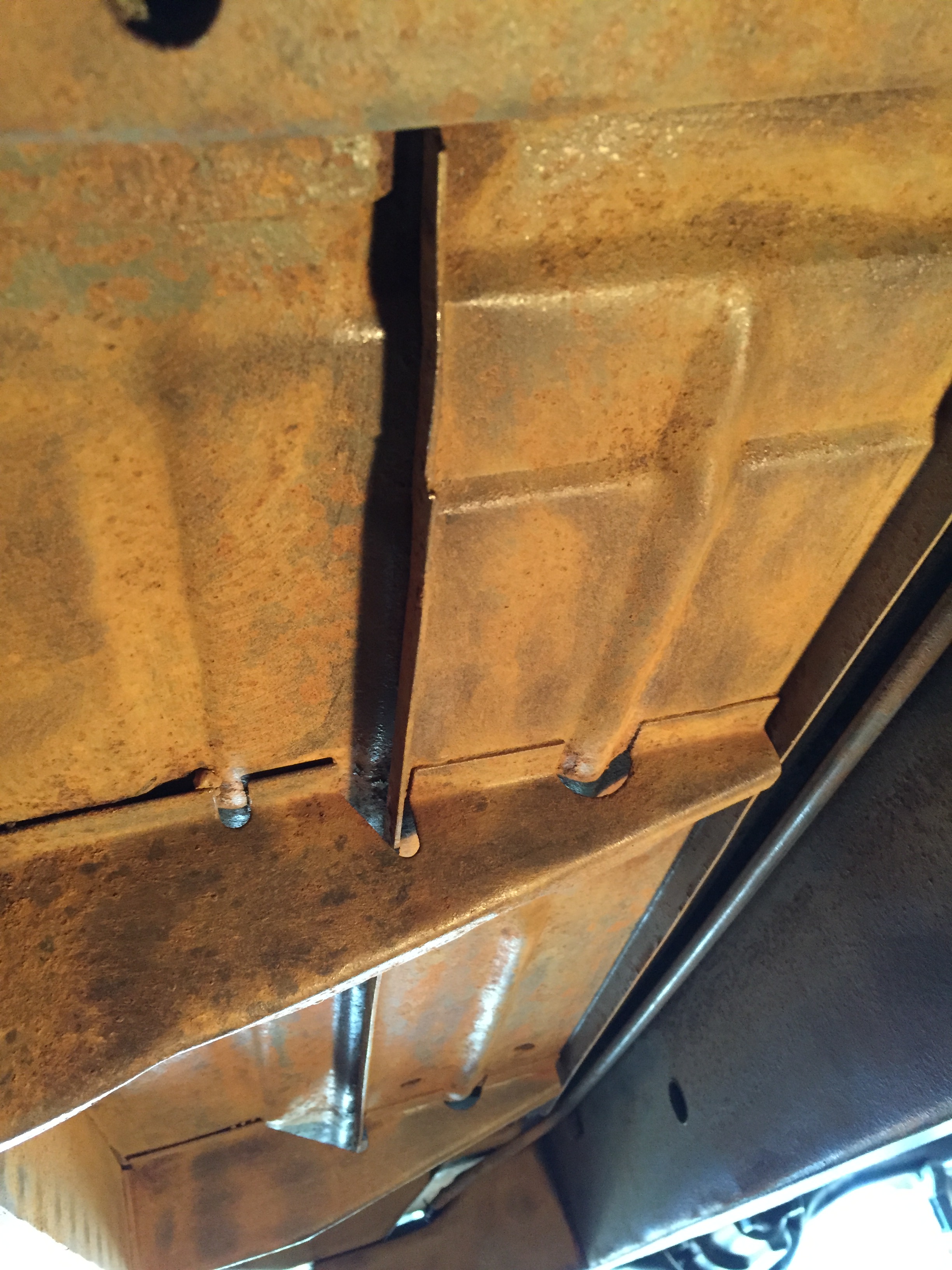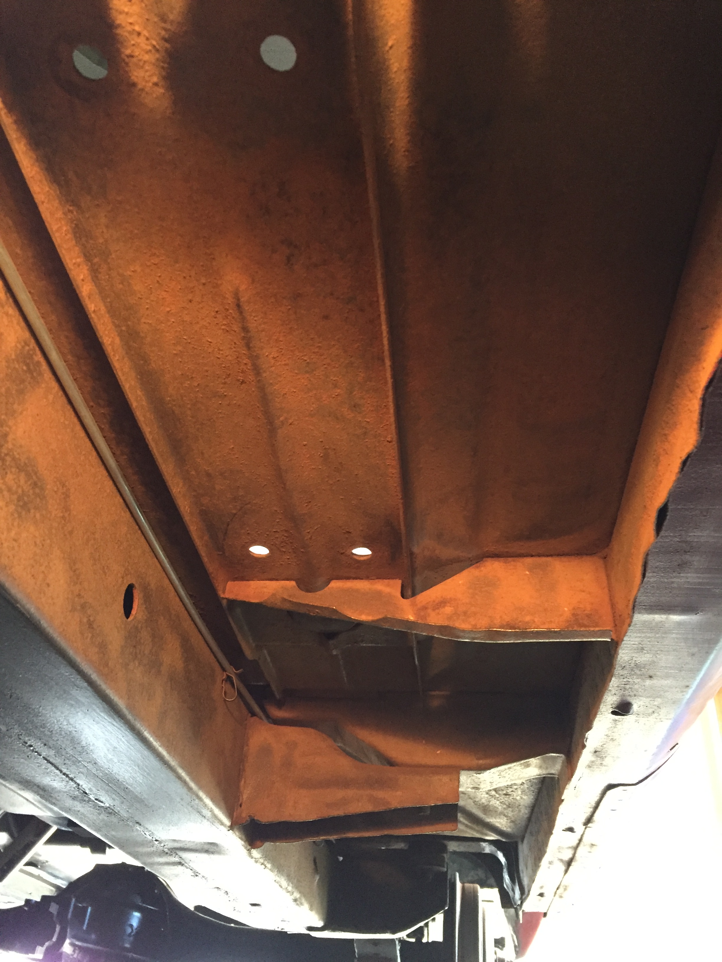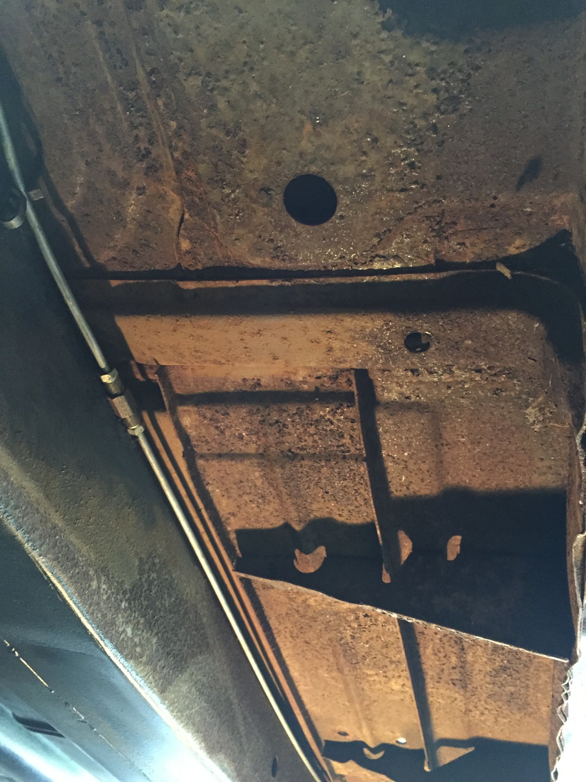 Two silver dollar sized holes in the floorboards, each side, right above the reinforcement brackets underneath. Everything else seems very solid. I’m thinking about cleaning up the perimeter, rustproofing some shim stock, and JB Welding to the floorboards. Other ideas?