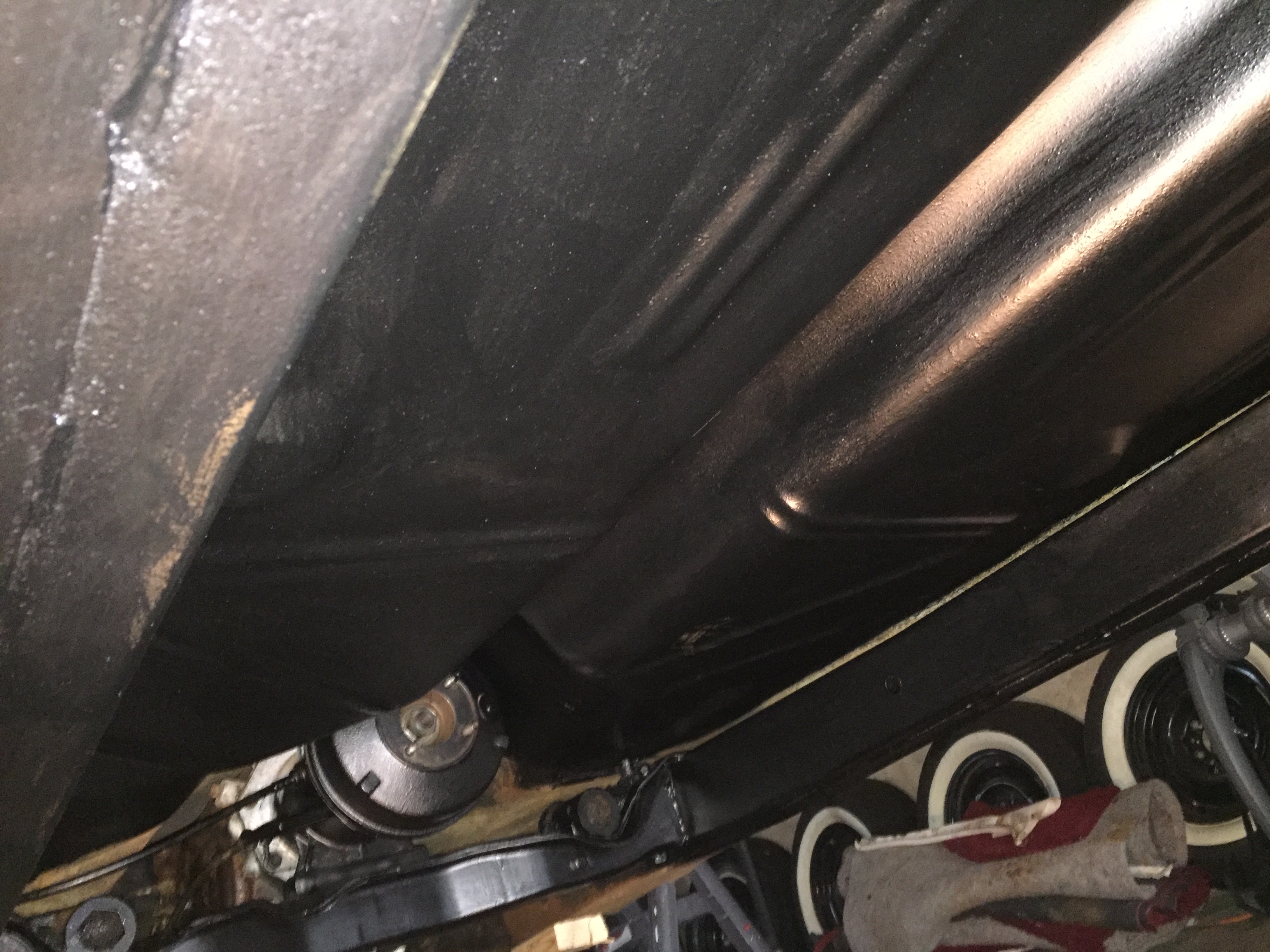 Everything rear of the transmission core is now brushed, with the exception of between the frame and the rockers. Some remains to be osphoed, and everything except for the trunk area needs painting. As I slide down the bannister of life, I will always remember this job as a splinter in my *ss…