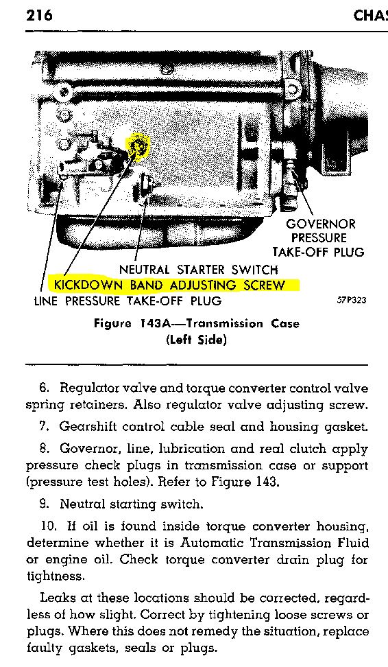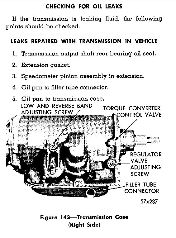 Dan - Other than having the holes welded closed l would buy a 12 x 12 inch piece of 18 gauge sheet metal from a big box store or ACE, cut to size, pre-drill for pop rivits. I would also use seam sealer between the metals and coat the entire underside. Water pumps don’t use a conventional lip seal, they have a carbon type seal so they will wear out but not age quickly. What looks like a pipe plug is actually the kickdown band adusting screw, look at page 216 in the service manual. The large lockdown nut may just need tightening dont move the adusting screw.. It won’t hurt the tranny to sit with no oil but l would not leave it without the pan on it.