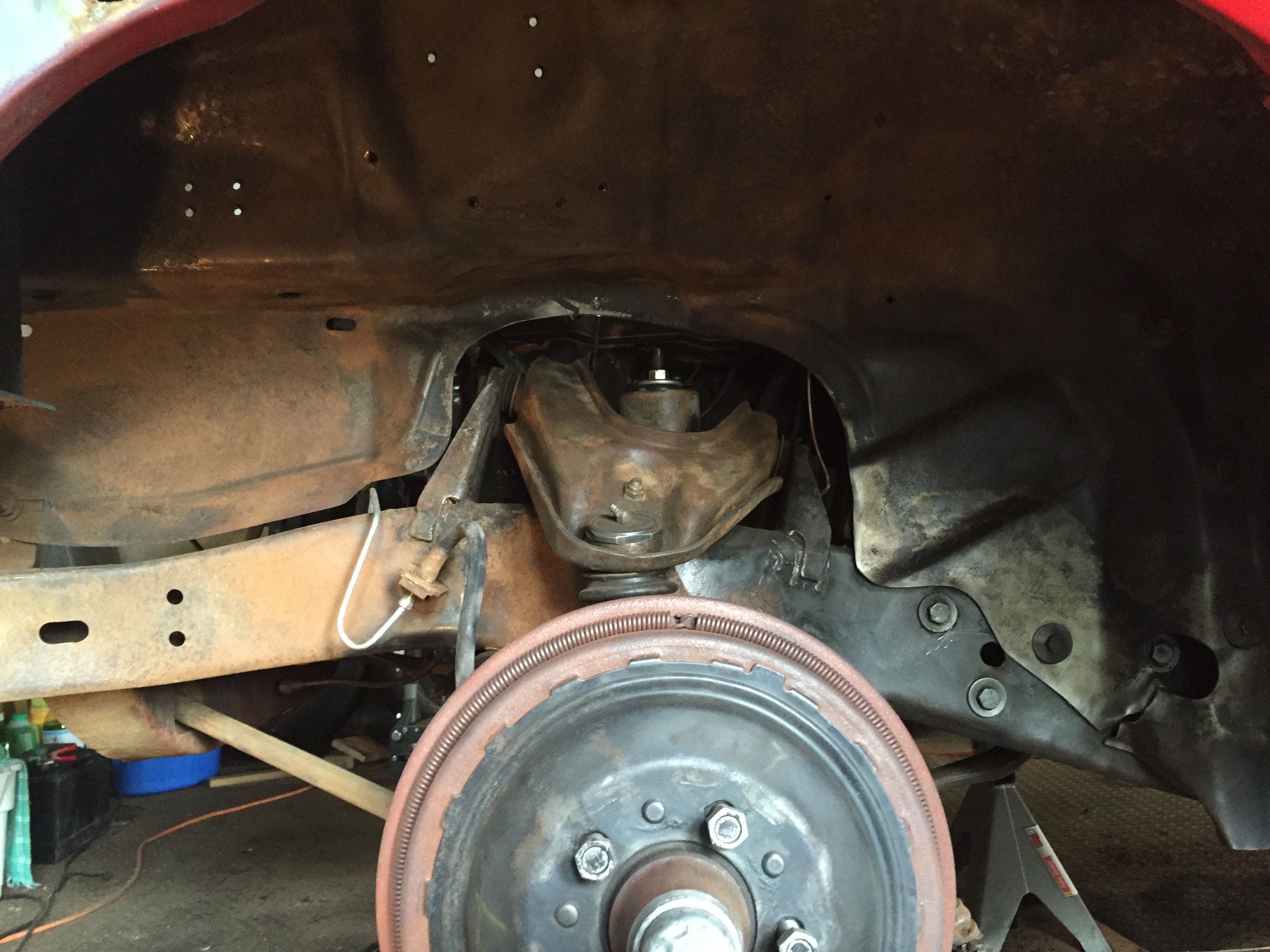 Not fun, fershur. I spent most of the day scraping, brushing and sanding inside the driver’s side fender. I still have some degreasing to do with mineral spirits, but here are the results: