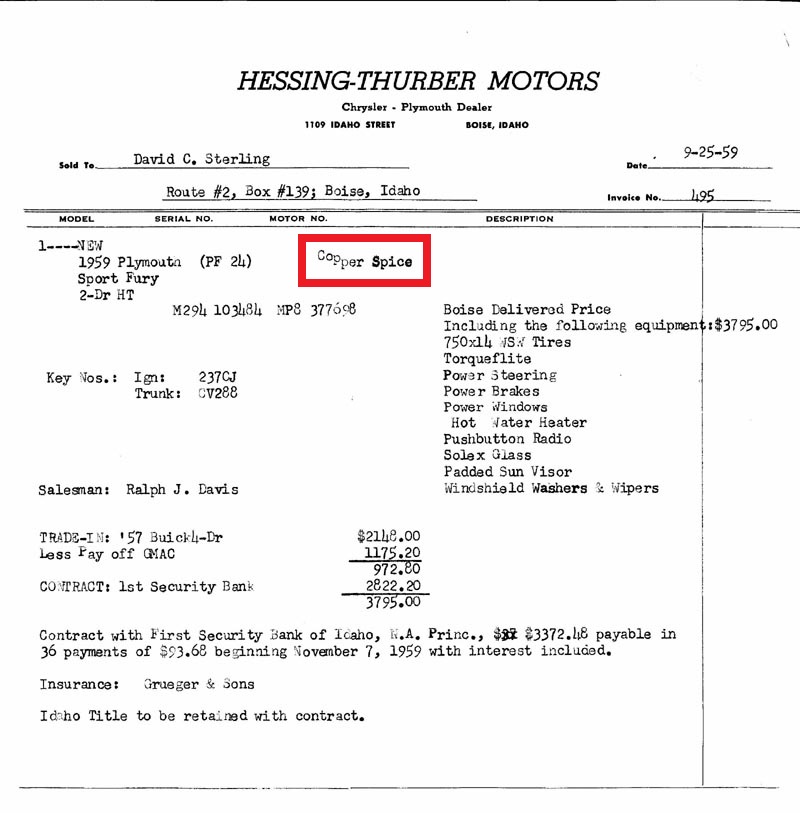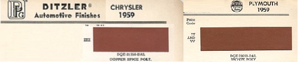 Thanks Will! They are having a heckuva time matching the color, though. The shop shoots Sherwin Williams, and back in 1959 S-W made “copper spice” which was a Chrysler color, not a Plymouth color. But as you can see from the chips, they are virtually indistinguishable: