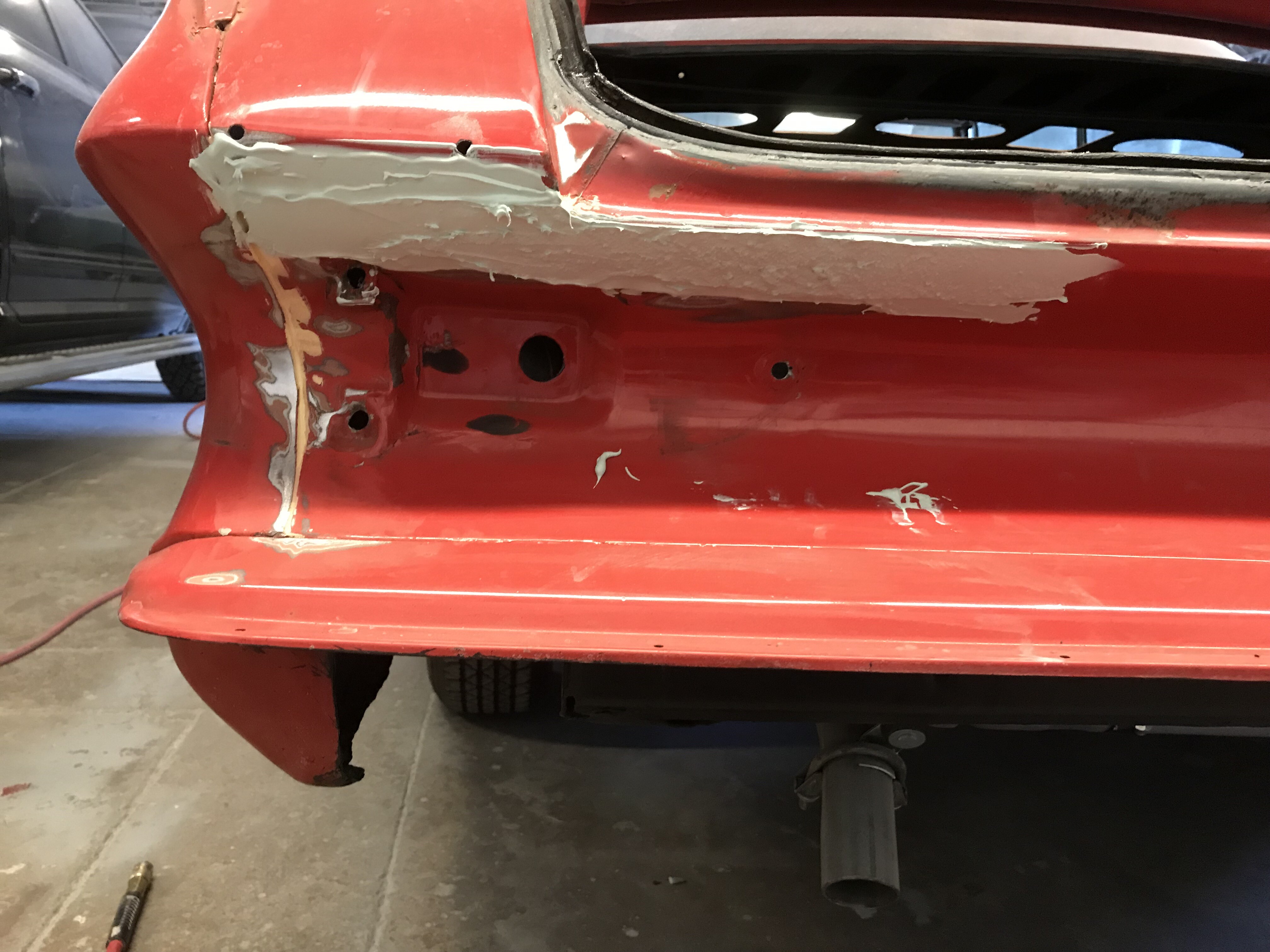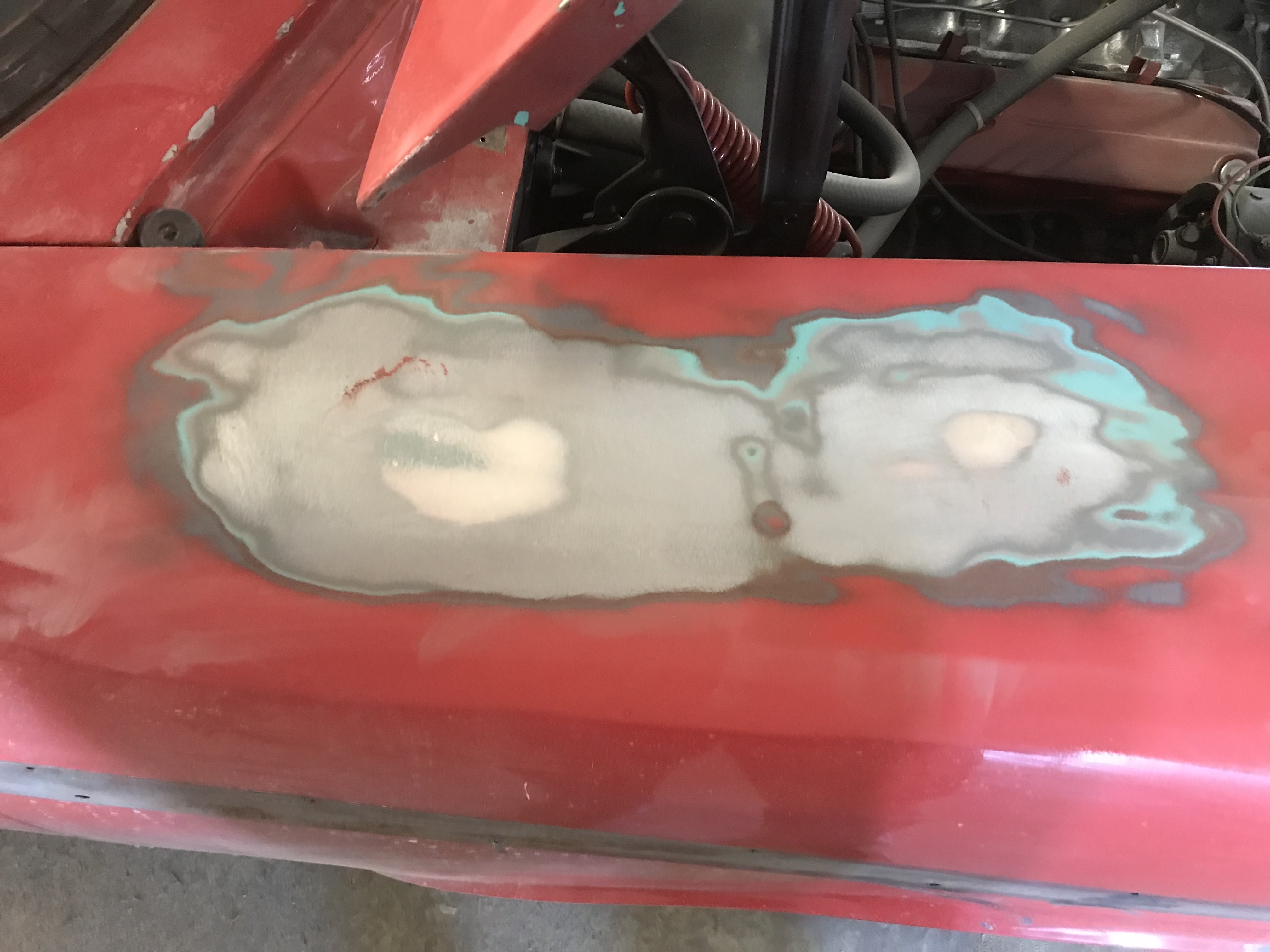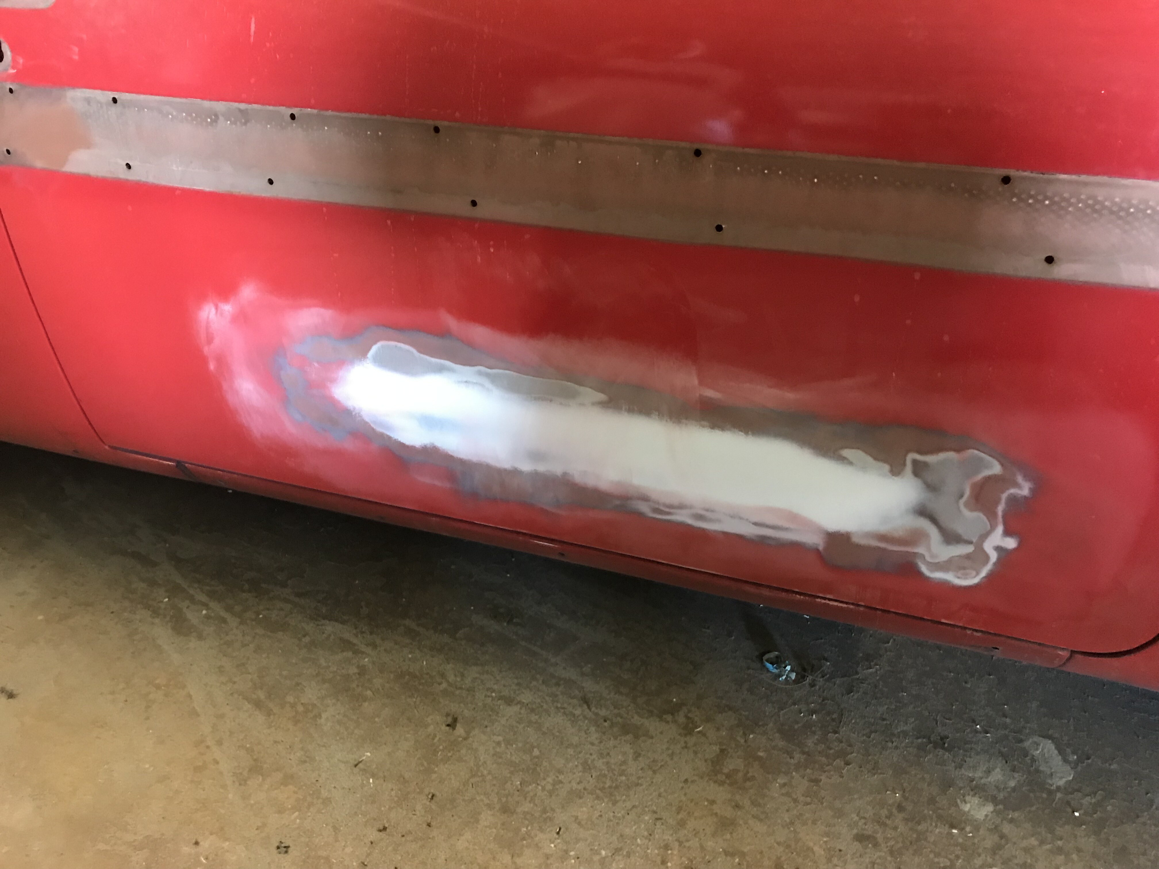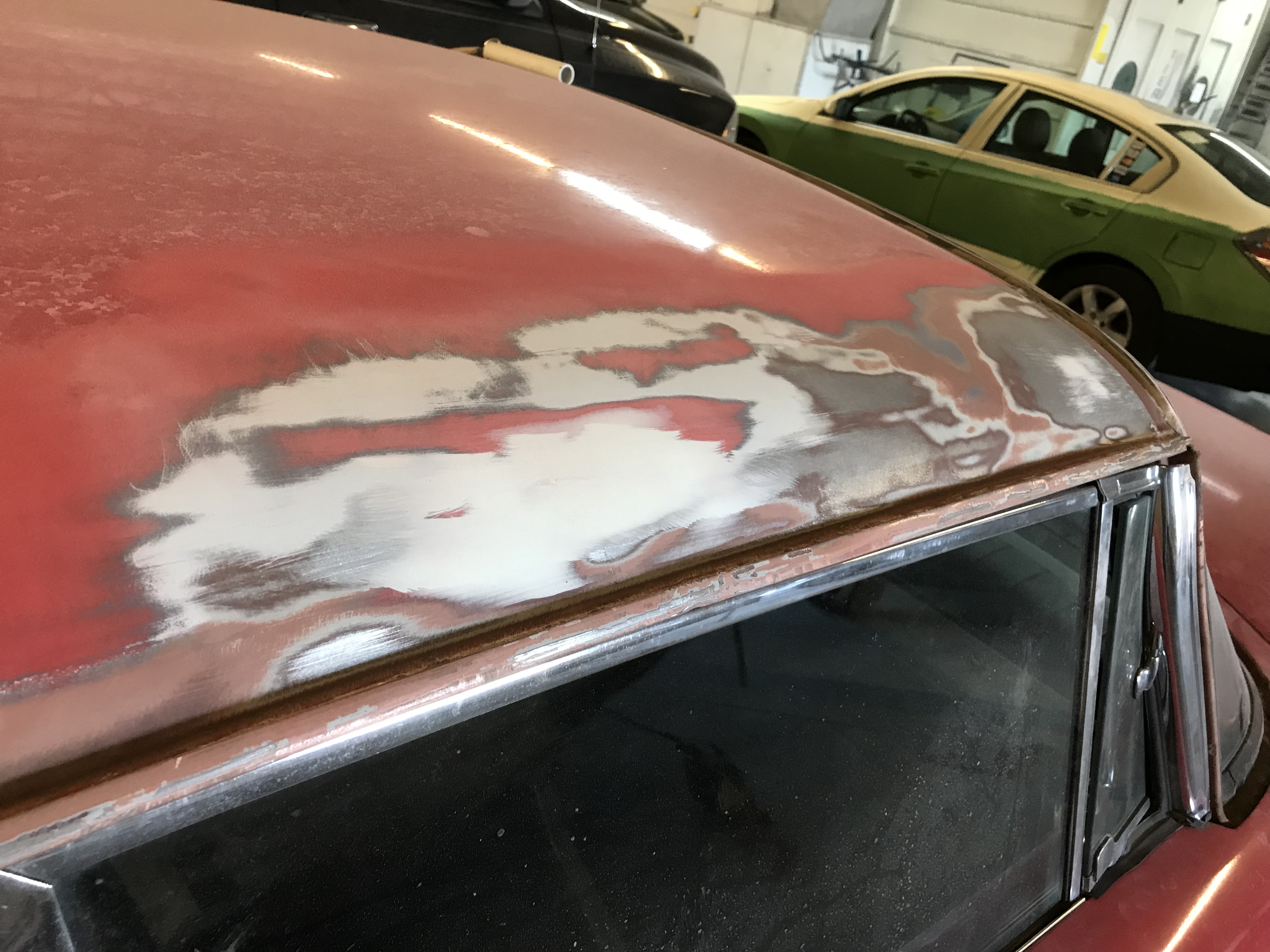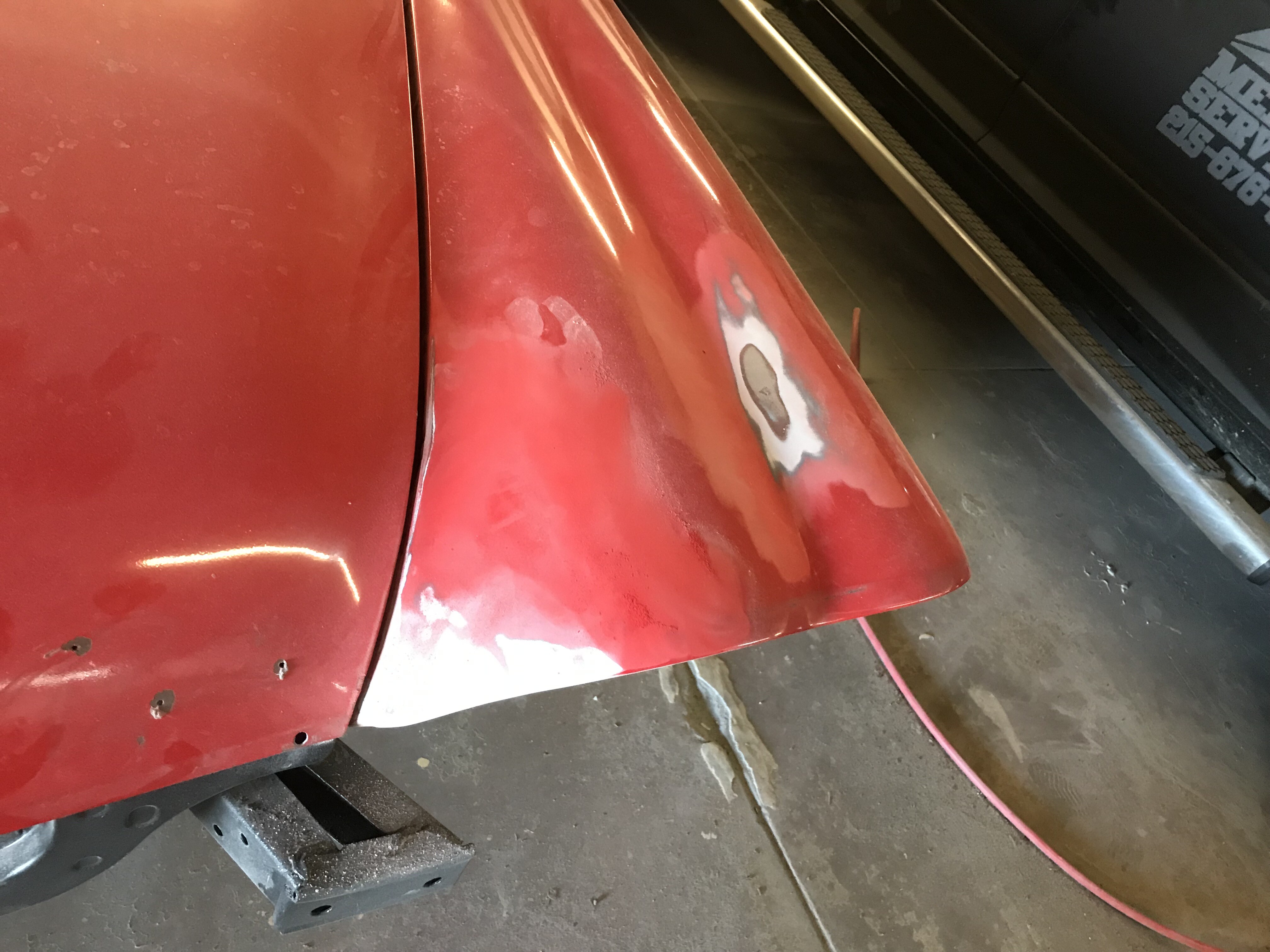 Some pix from the body shop. Anthony does awesome body work! He fixed the hood alignment at the cowl perfectly (dang, forgot to get a shot of that). Still to start on is the passenger rear quarter and the driver’s rear wheel well, but things are coming along. Anthony had found a dent in the roof that I never noticed (prolly, from kids lobbing rocks at “The P” when it sat out back of the Sterling’s business property), he fixed that in short order. In a little over a week they’ll shoot primer and look for warts, and then paint! I should have Faulkner back in three weeks.