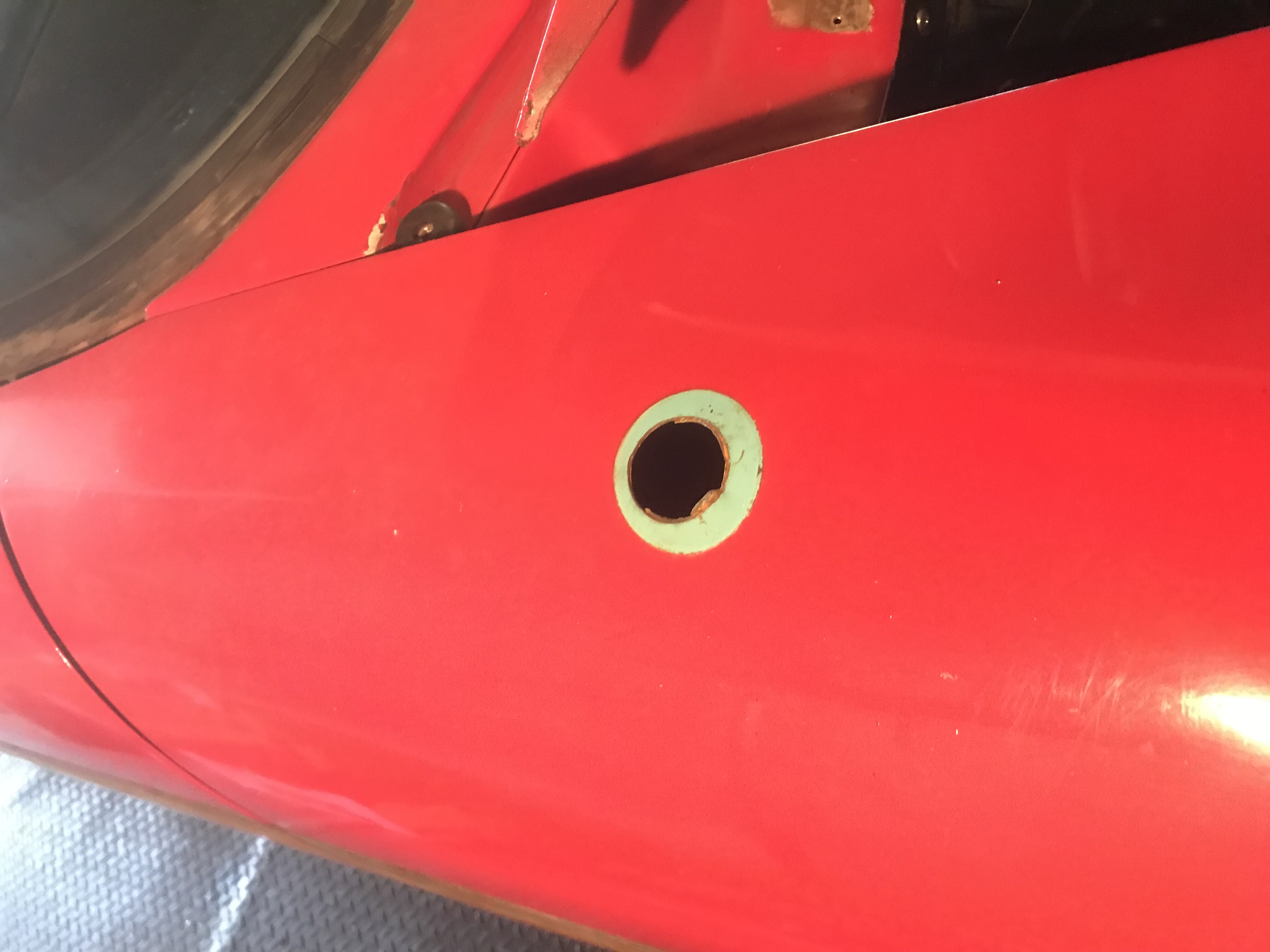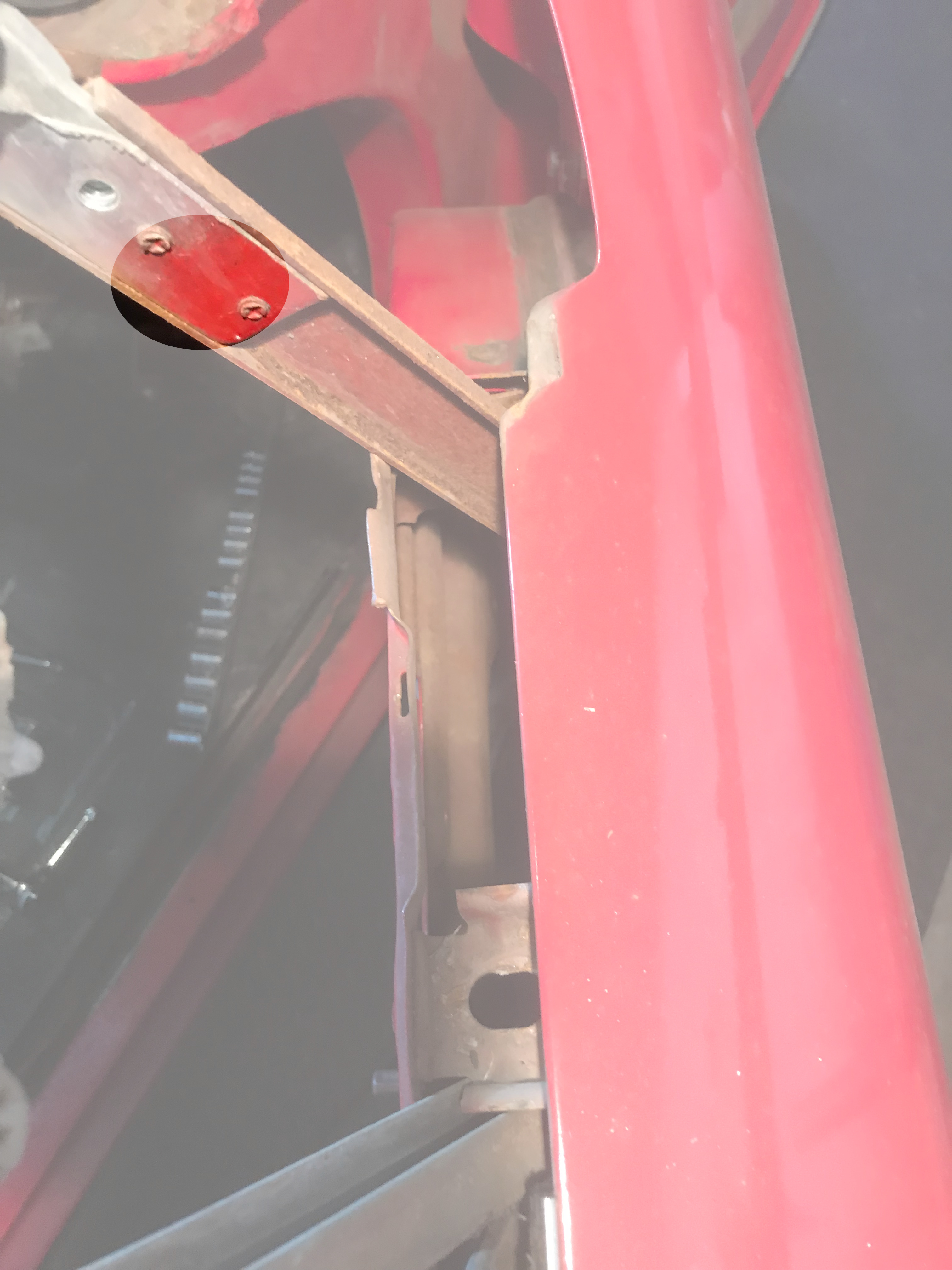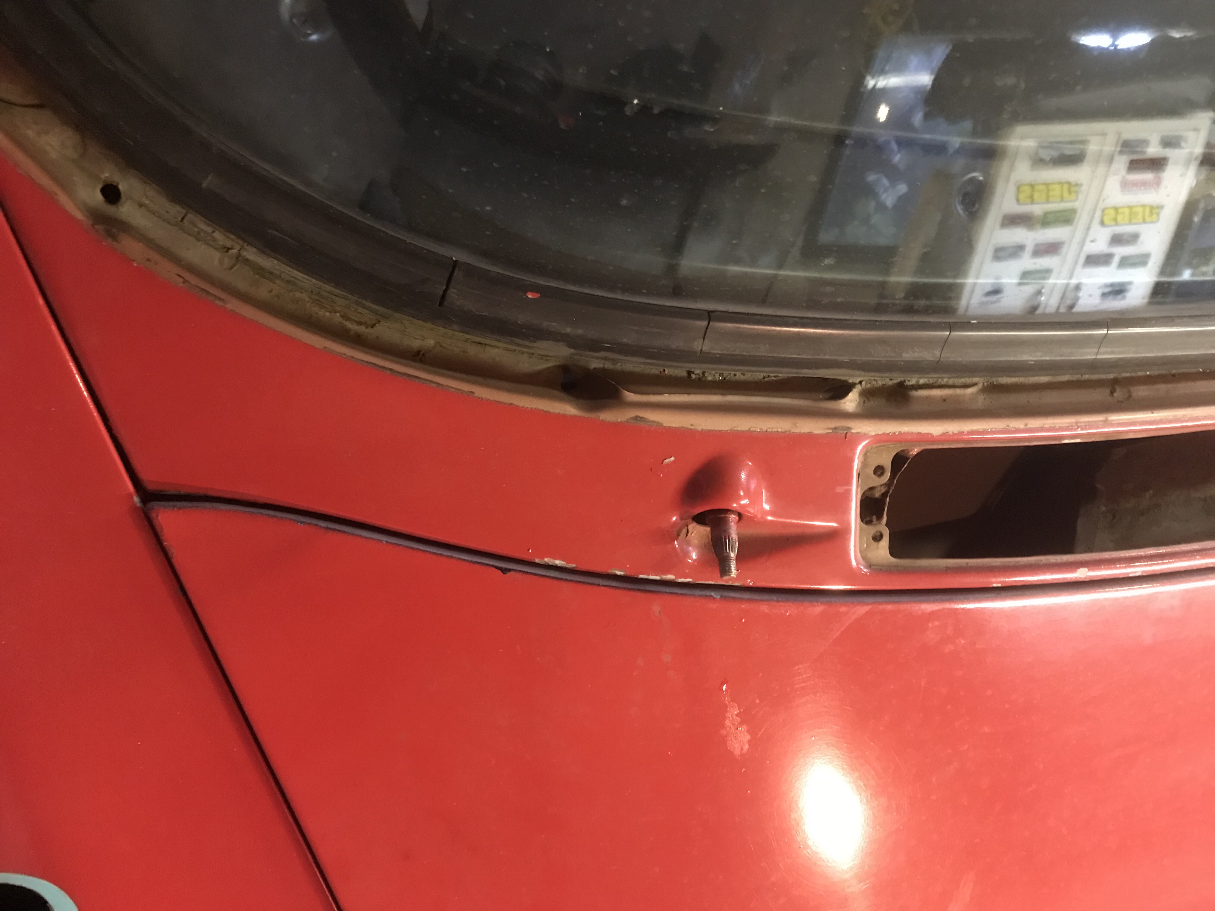 Years ago, when I replaced the cracked driver’s side vent window frame, I must have drilled out these pop rivets on the leading side of the vent frame before I could remove it - you can’t just pull the vent frame up and out, the front and leading edges aren’t parallel, and the front edge binds in the door. Unless I’m missing something! Matthew, did we reattach that front bracket when we went to reassemble? The driver’s side has bolts in it now: