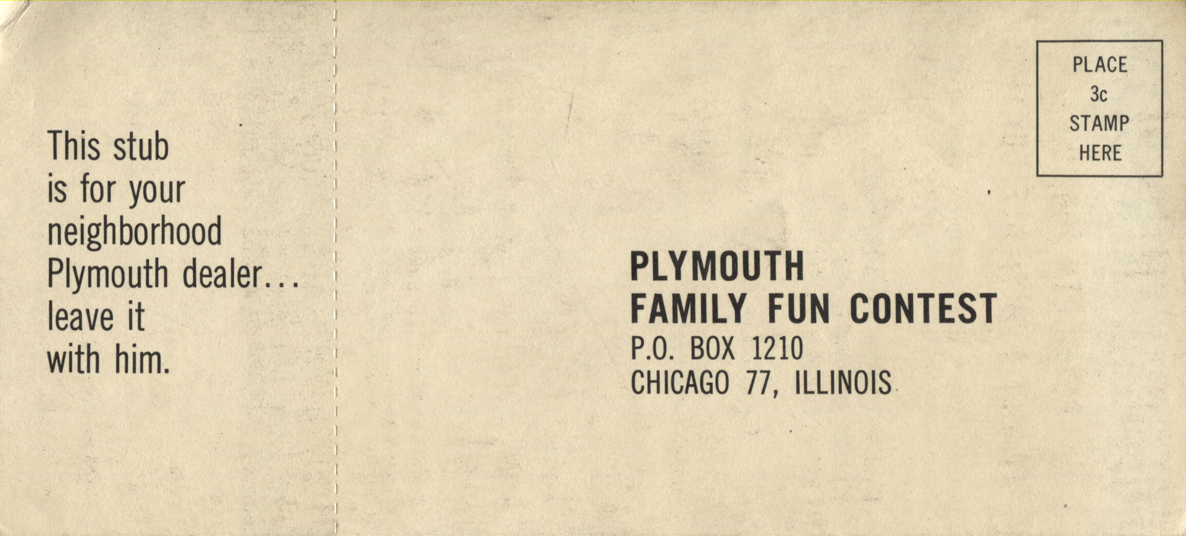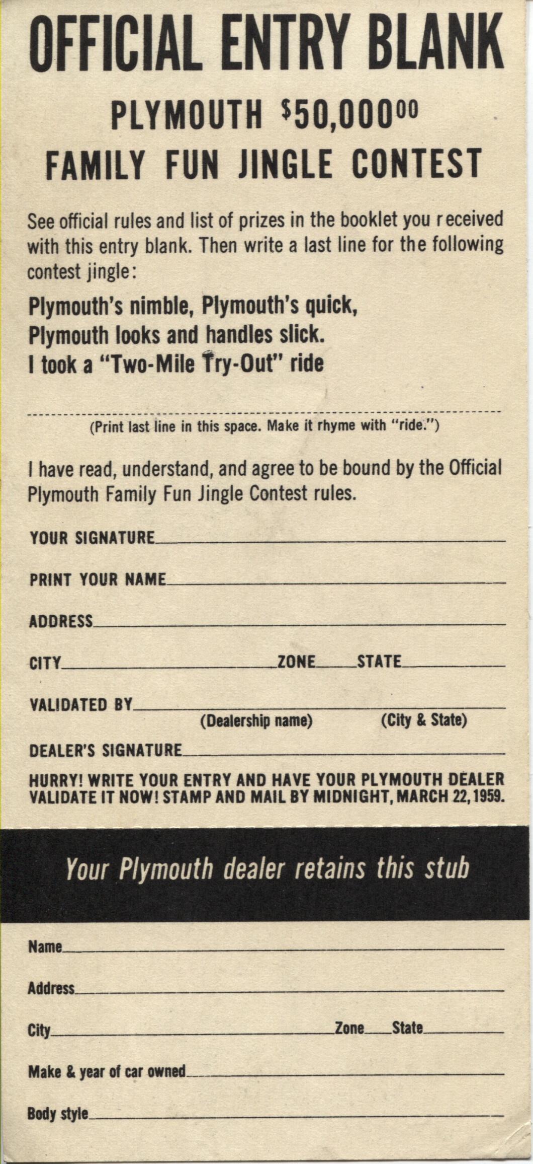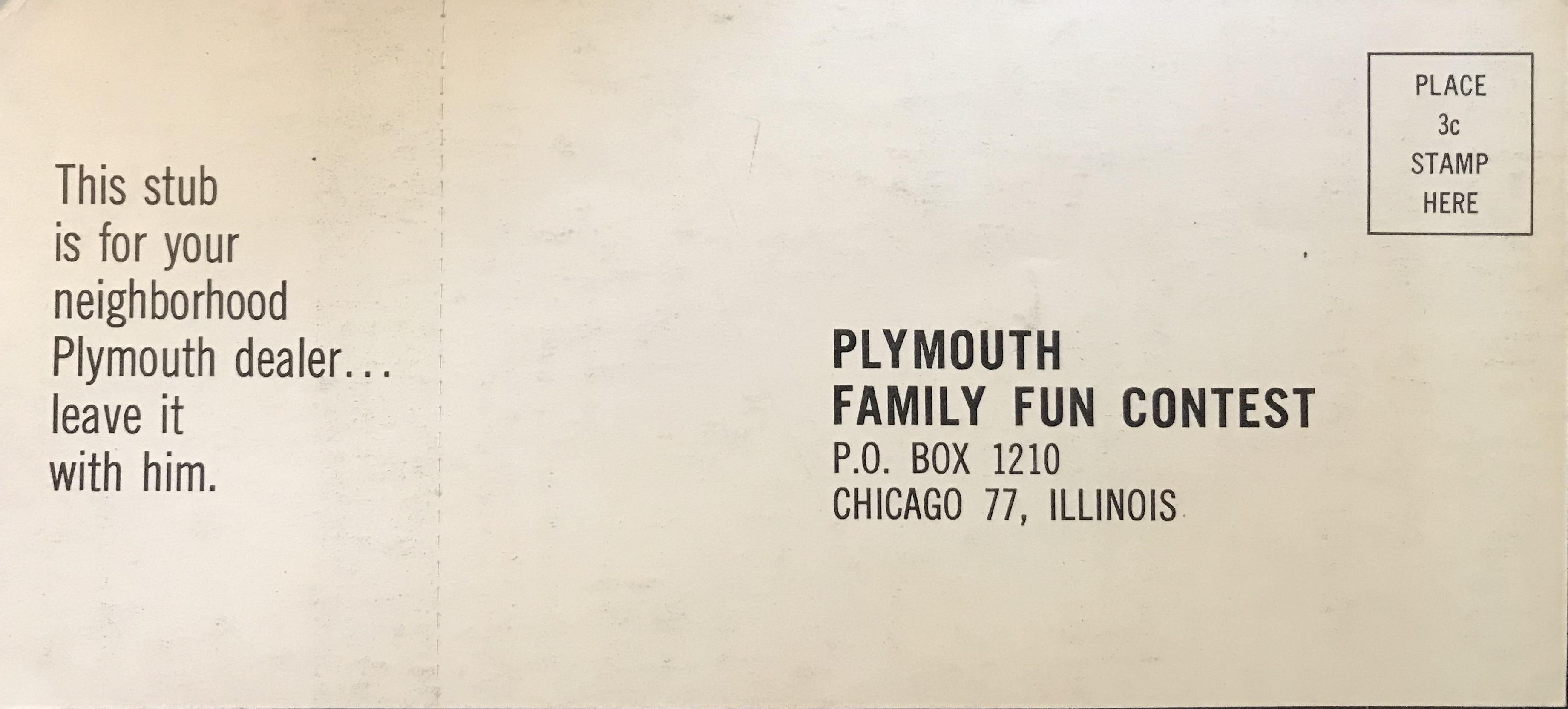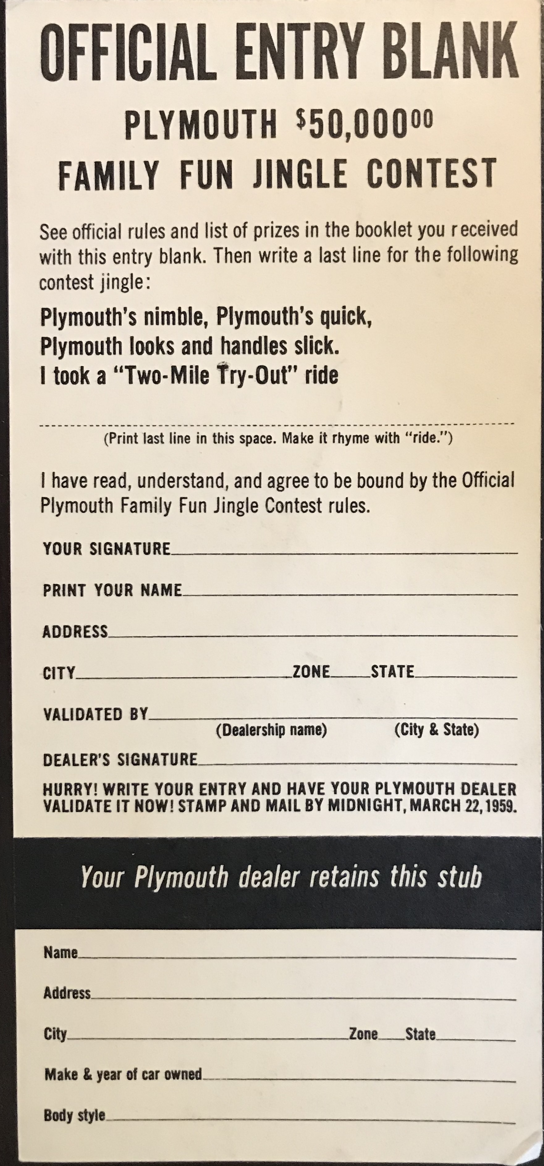 I’m going through my ephemera, putting it in plastic sleeves and binders - and came across this “Plymouth Family Fun Contest”. It’s not too late to enter! Just fill out the form below, and don’t forget to include your Postal Zone (for those of you who remember them). Now, complete the jingle: