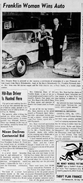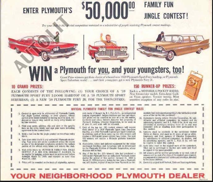 Googled “Plymouth Jingle Contest 1959” and they both popped right up. Several newspapers are making their archives searchable on line. It’s an expensive, time-consuming process, but it’s an amazing research tool.