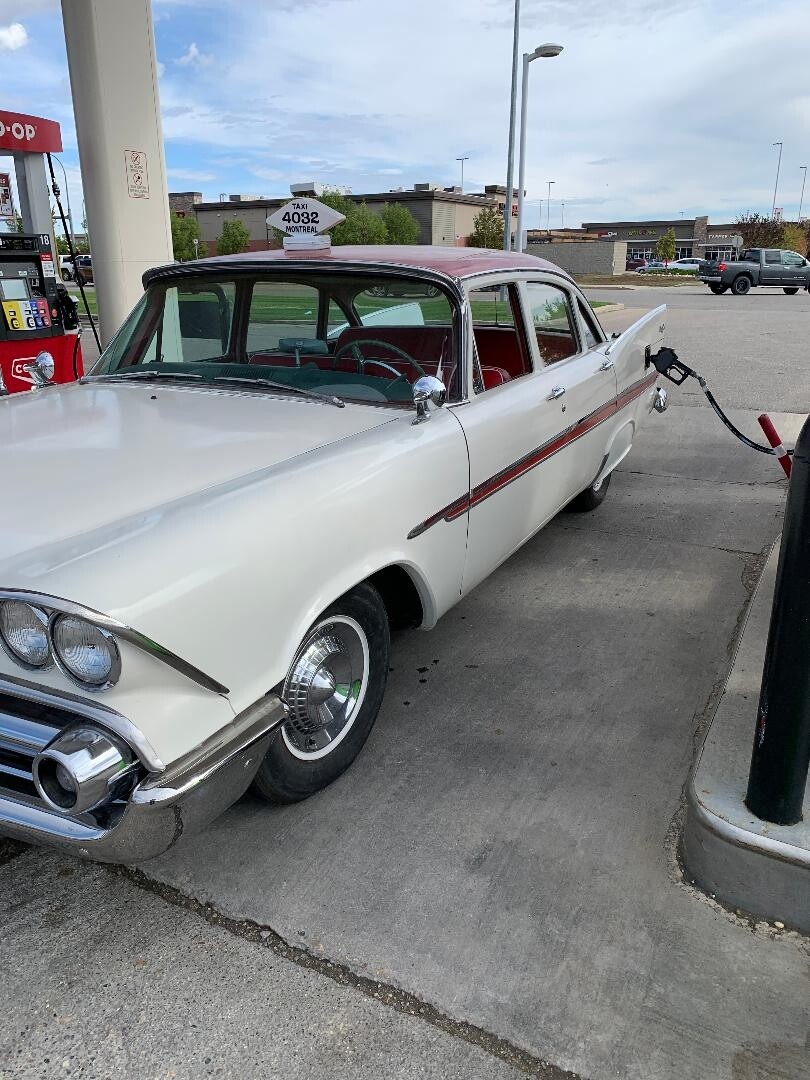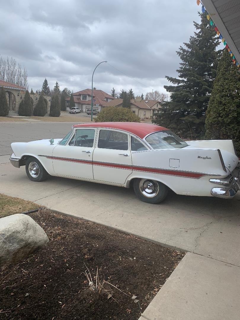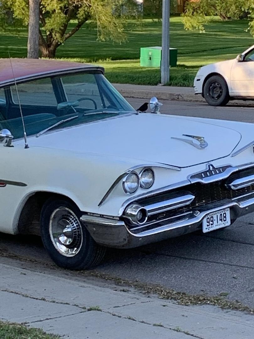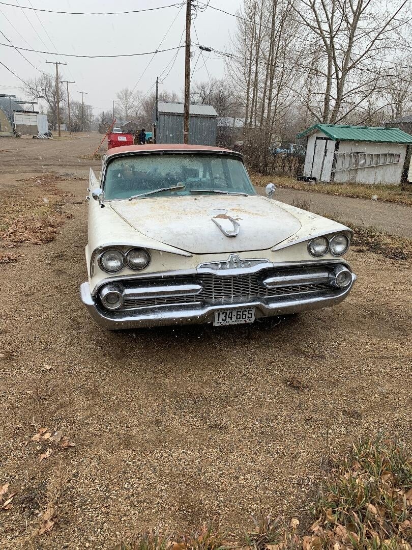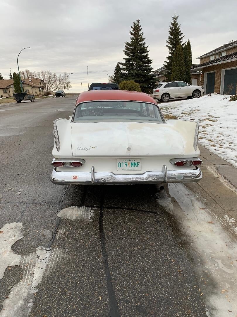 All I know about the car is it spent it’s formative years in Vancouver, before being put out to pasture in Saskatchewan where I found it. It does sorta run and drive, but the rt. fr. brakes are on the steel and the wipers etc. are so so, I decided it wasn’t worth the gamble to drive it the 2 hr’s to my place. Power nothing, push button auto, 313 poly V7 (it seems at the moment.)