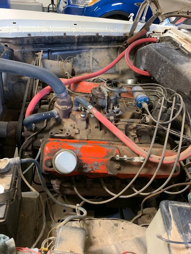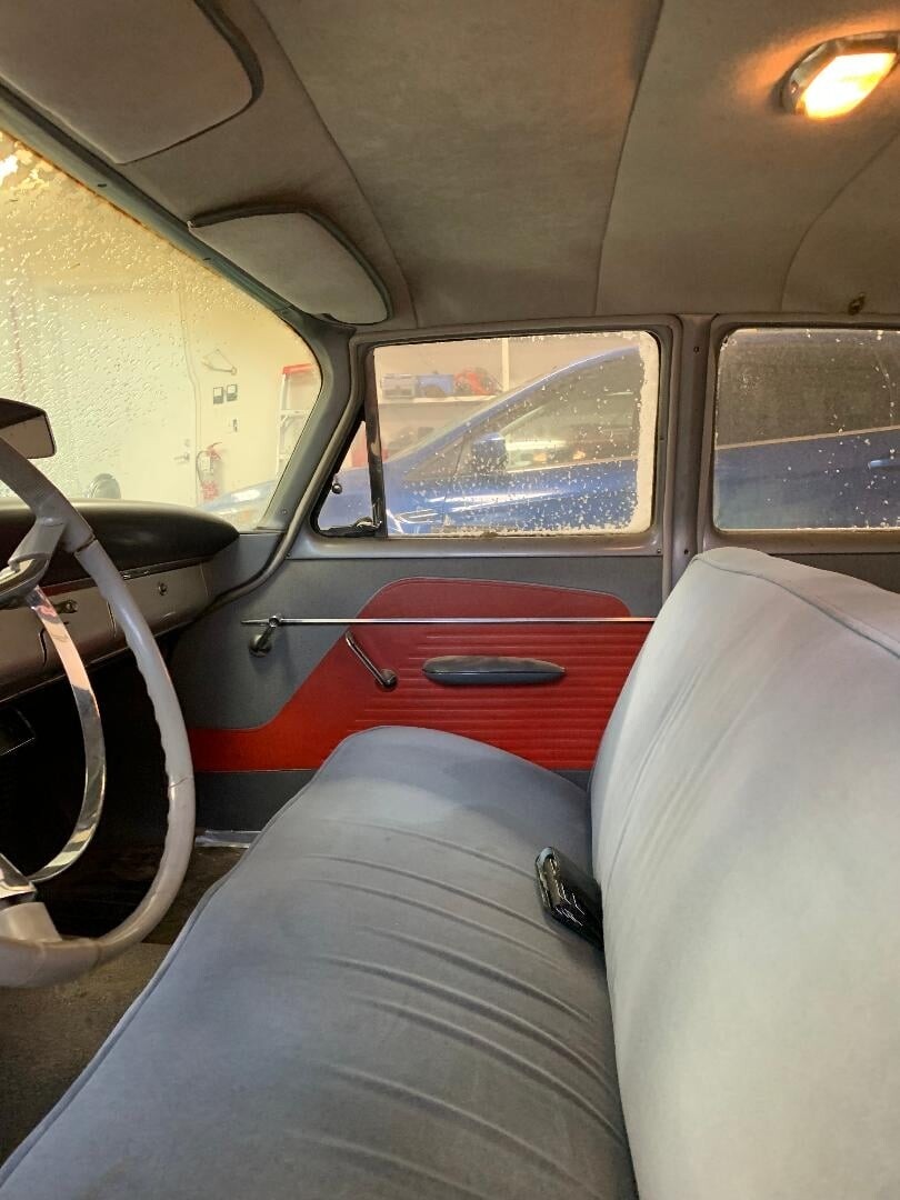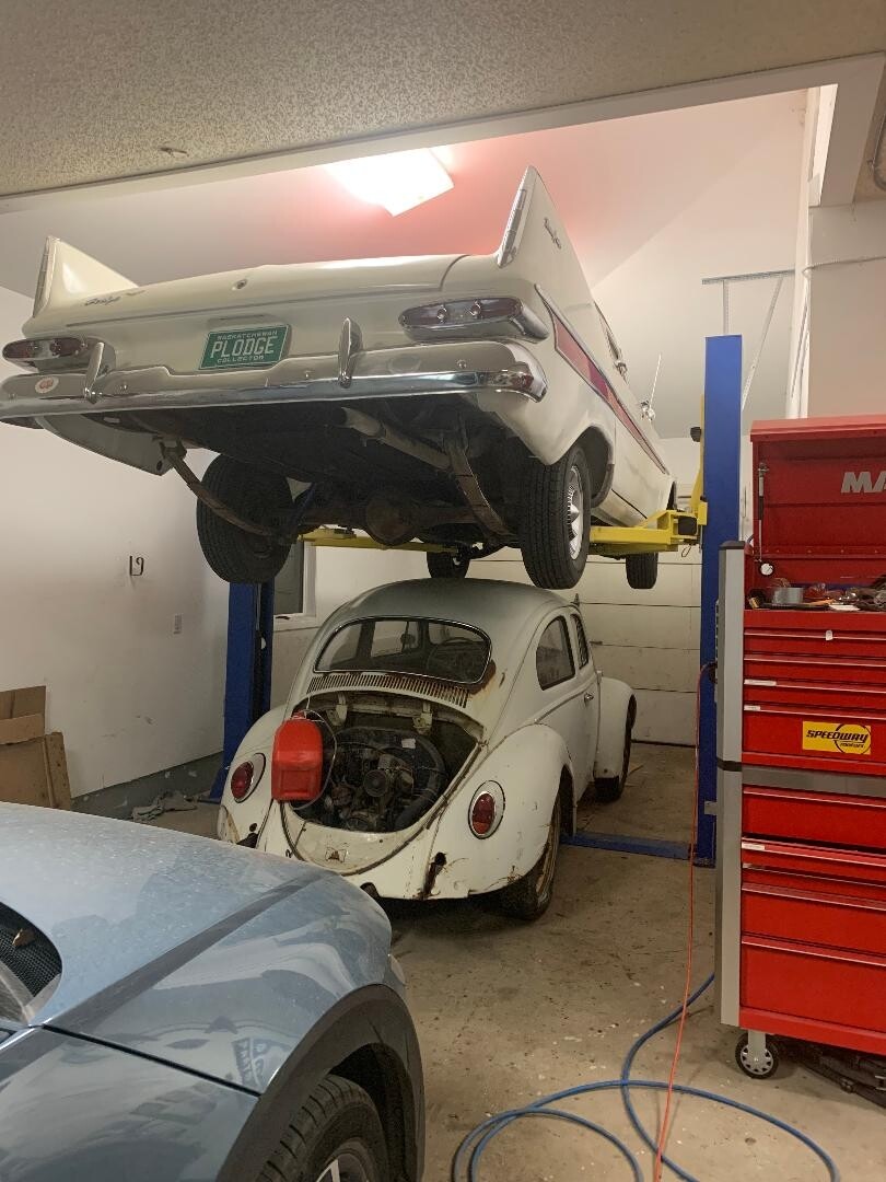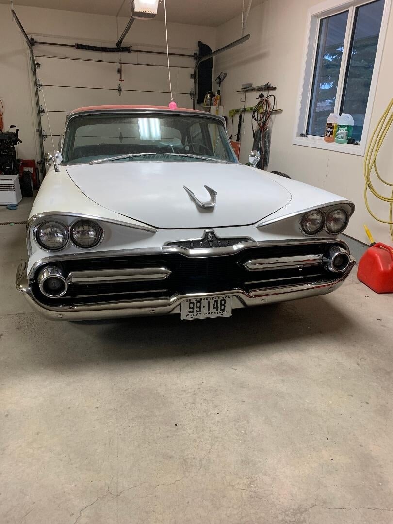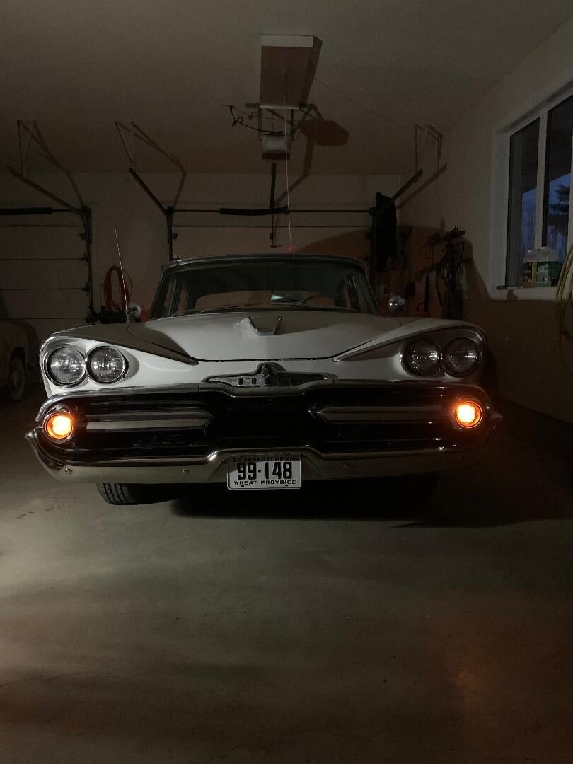 All I know about the car is it spent it’s formative years in Vancouver, before being put out to pasture in Saskatchewan where I found it. It does sorta run and drive, but the rt. fr. brakes are on the steel and the wipers etc. are so so, I decided it wasn’t worth the gamble to drive it the 2 hr’s to my place. Power nothing, push button auto, 313 poly V7 (it seems at the moment.)