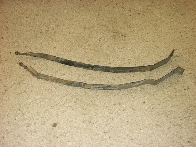 Dan and Dave, When I ordered my replacement gas tank straps from an Arizona junk yard, they sent me these (see picture). What I wanted was one wide, long strap for my station wagon, what I got was two narrow, short straps. Obviously, they then sent me a correct replacement, but did not want these back. I cannot guarantee that they are for a 1959 Plymouth sedan, etc., but it is highly likely. So I am offering them to one of the group members free, except for the cost of shipping (should be about 2 pounds shipping weight). They are in good shape with minimal rust and are about 24 inches long (not including the stud) by 1 1/4 inches wide.