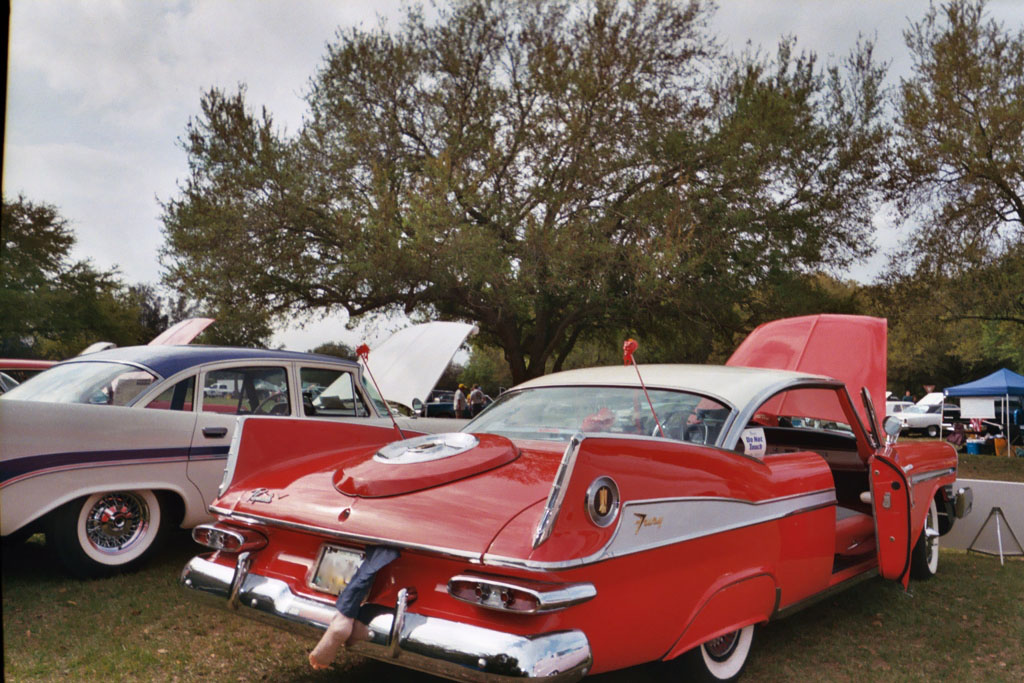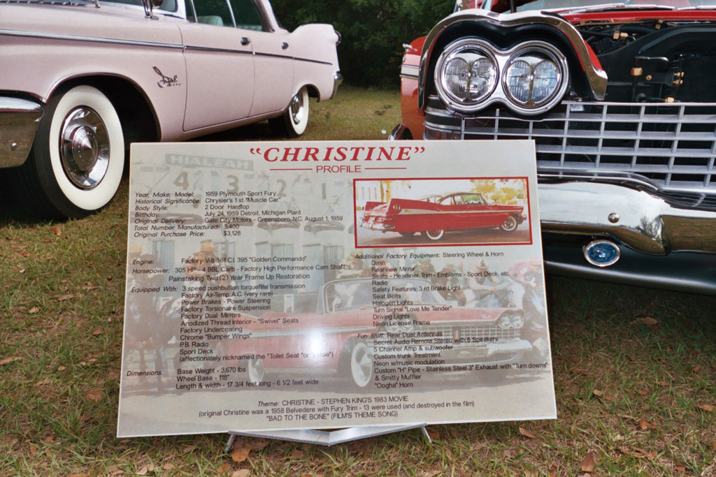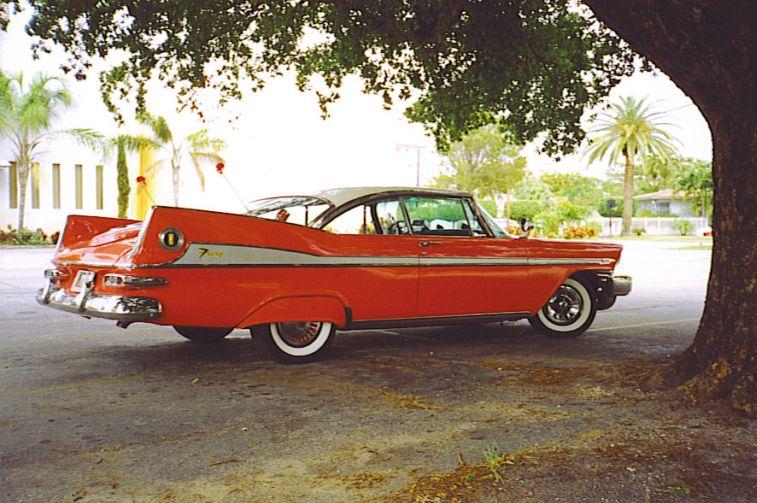 "A little history for you - the 59 Plymouth Fury was introduced here in Miami at two locations: JORDAN MARSH DEPT. Store on their boat dock on Biscayne Bay (Moon over Miami theme) the store is now defunct. It was a high-end dept. store in the 50’s through the 70’s but fell to the competition. The other was at HIALEAH RACETRACK (out of business two years ago after being the country’s most elegant track since the 40’s- it lost it’s attractive race dates to it’s competitor Gulfstream Park and to politics).The sign in front of my car has the original newspaper adv. from the racetrack as a background showing a red 59 conv at the starting gate with the horses. I have the original adv. and was able to duplicate it for my sign.