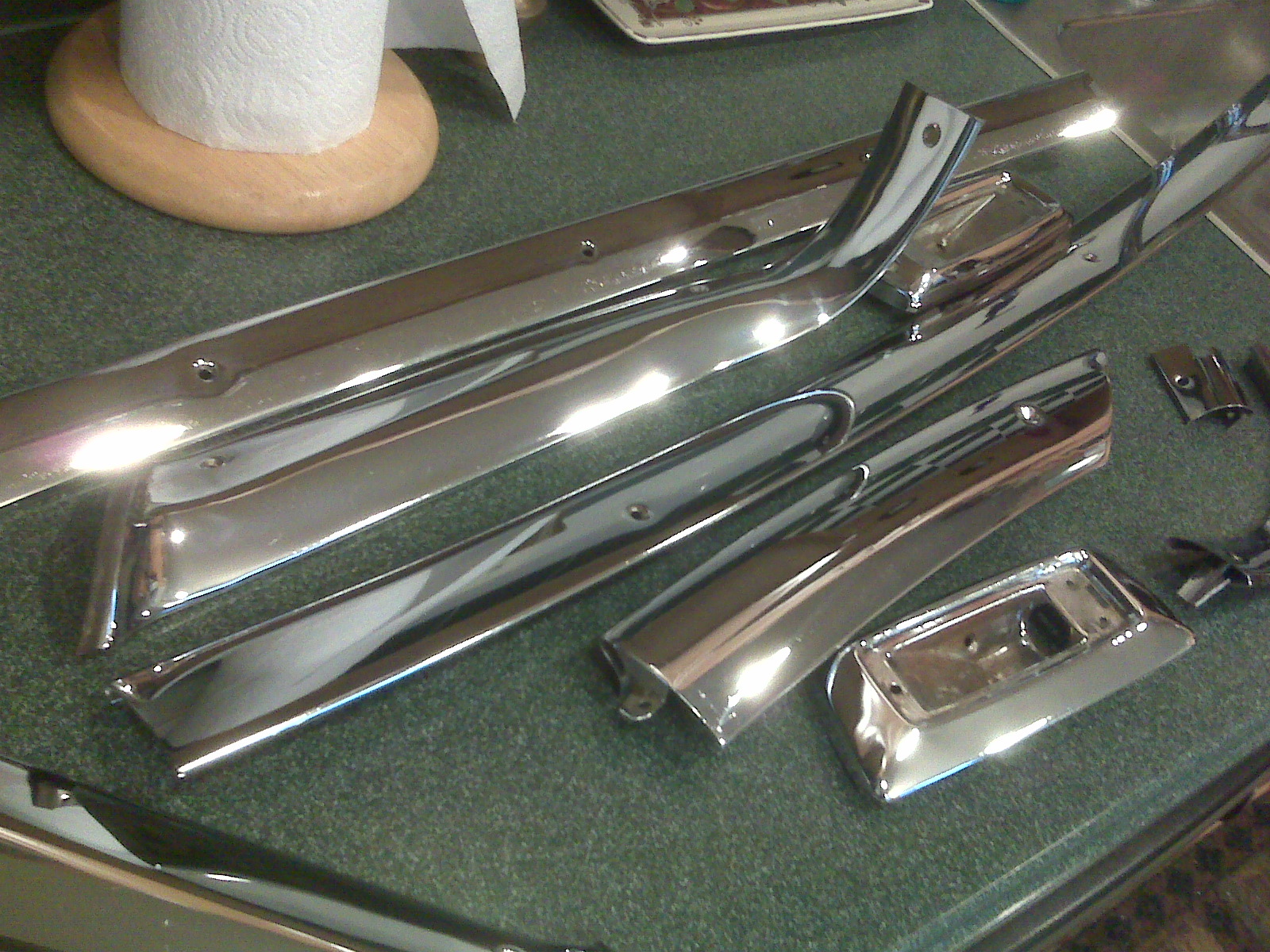 I’ve got the entire headliner disassembled now. All the chrome that wasn’t in decent shape was rechromed, and I’ve polished everything else. (Just can’t find Unipol, Matthew; I ended up using this stuff that I bought at Carlisle..)