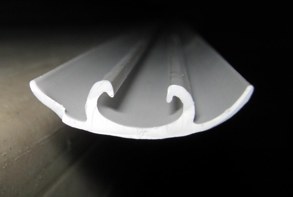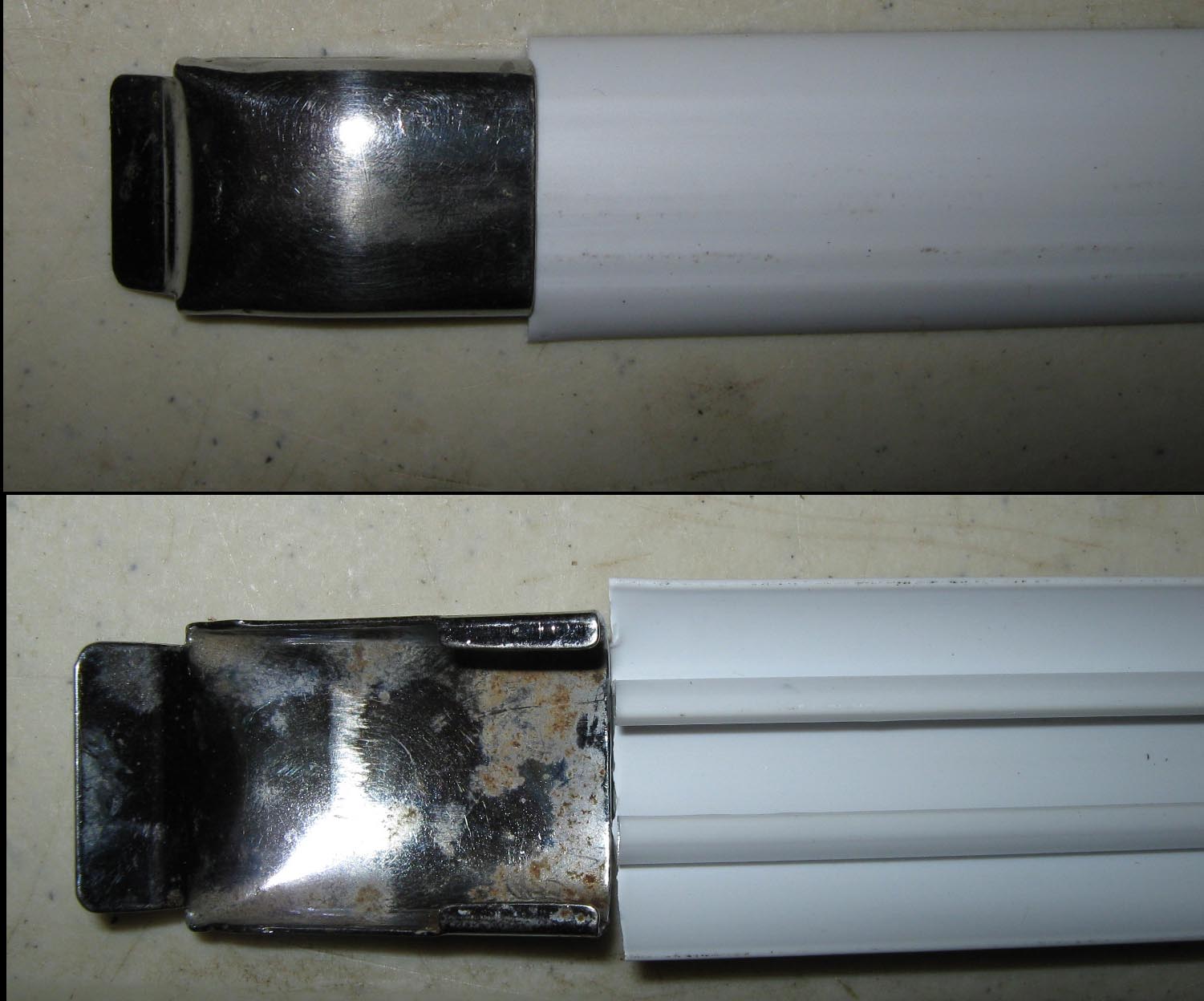 I’ve got a problem, though, with the Caravan strips I’ll be using. They’re white plastic, I’ll be painting them silver. They snap onto the rails great – but, they’re wider than the four chrome strip ends that Tom gave me. Since the only thing holding the ends on is snapping onto the strips, I guess I’ll have to trim the strips at the ends a bit…