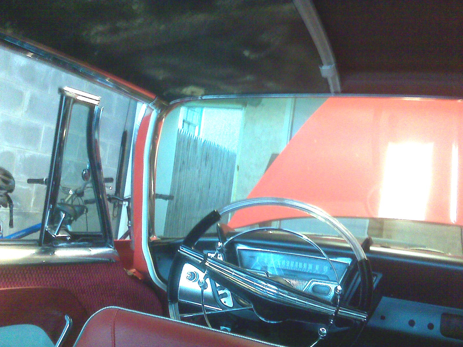 …and it’s all back together! Here’s a rather bad picture; but the old left and right panels are up (the luan center is a candidate for the trash), and all the upper interior chrome is back in, including the rechromed upper siderails: