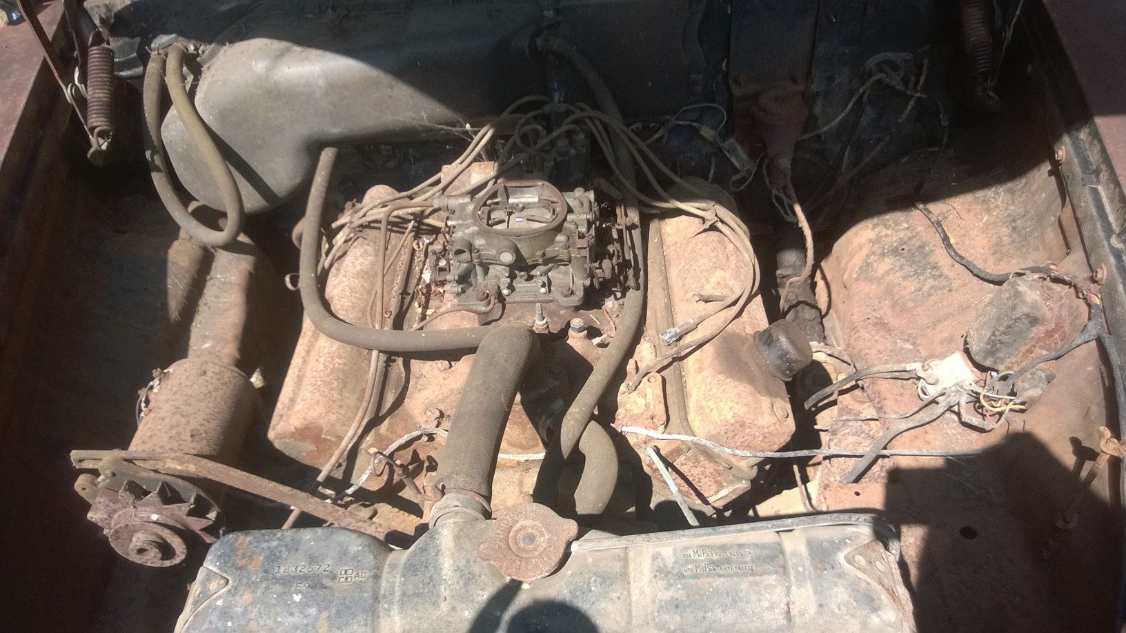 A Southern car… Needs a floor pan on both sides and a trunk pan.. Motor and trans is in it.. 361 auto… No seats at all.. Some have told me to just put anything in it and I know that will be the easiest way and probably the cheapest but I want all the trim on it and the factory seats and door panels in it. I want the outside old and the inside new…