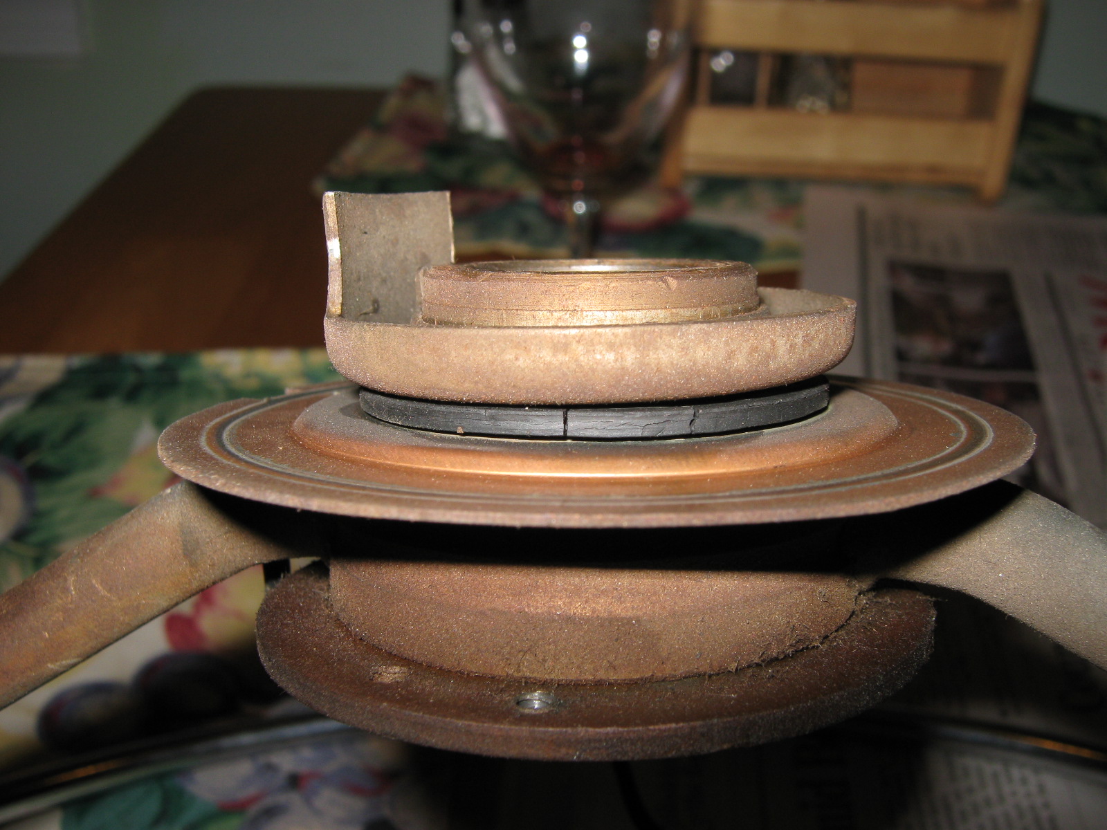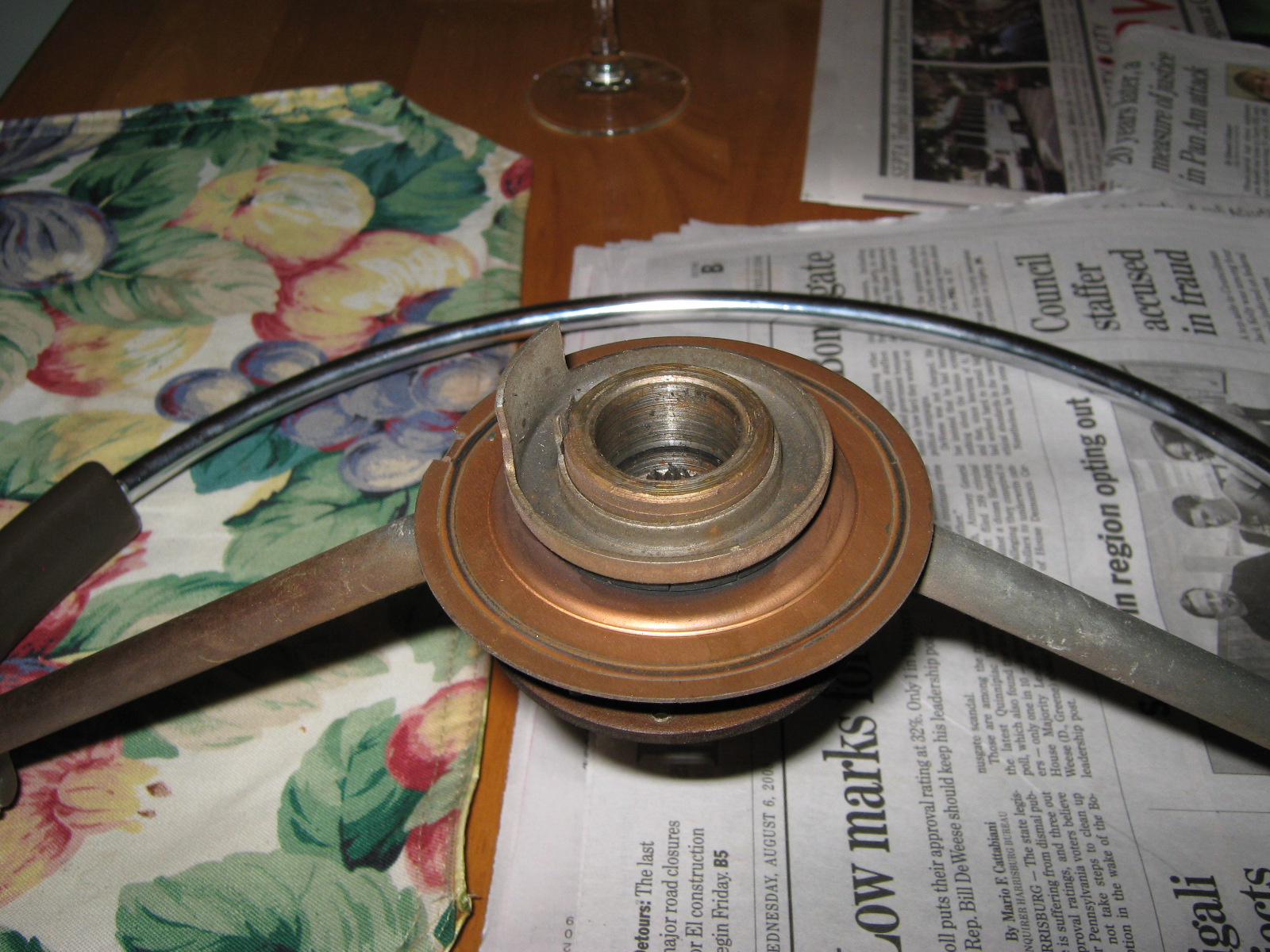 Found my wheel puller, and popped the steering wheel off faster than you can say “Robert Doucet” The detente on the plunger is fine, and so is the roller wheel; but there’s wobble in the contact plate. There’s a grommet of some sort between the contact plate and the retainer – looks like it’s cracked and dried out: