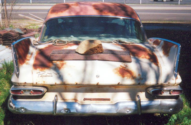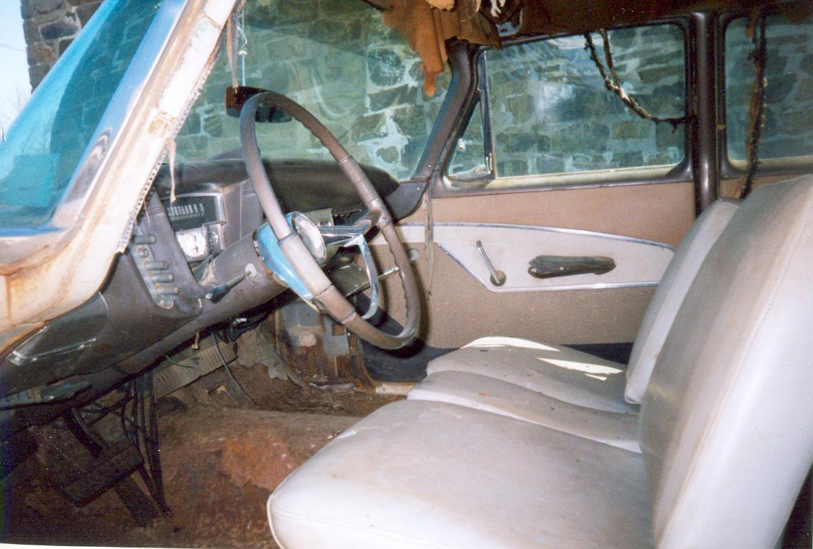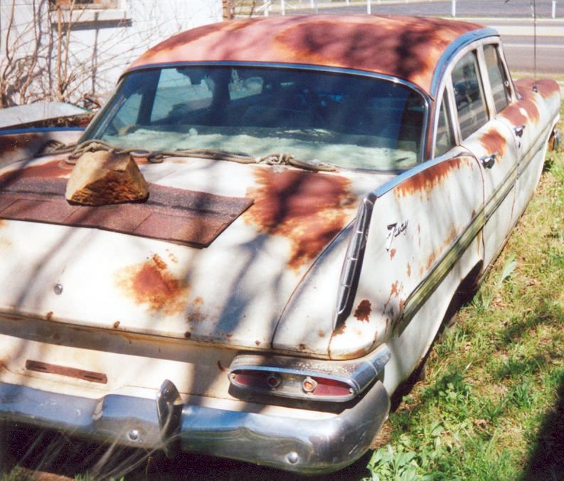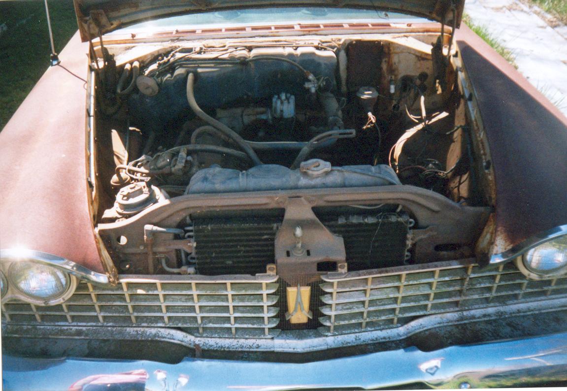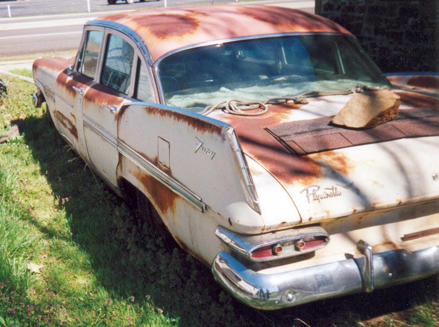 “My Fury was delivered on Wednesday (4/13/05), the same day I received the pictures. I’m real happy about fixing her up. The Fury had originally come from Oklahoma and had been in Arkansas since at least 1973. What amazes me about it is that most all the engine and tranny parts are still on the car. The interior is pretty good for a car that hasn’t exactly been the center of attention. Last but not least is the fact that all the glass is in great condition, no smoking or cracks. In the picture the engine looks incomplete, but some of it was in the trunk. The engine is a 318. This is definitely a fixer-upper and I’ve already become attached to her. I have a 72 chevy short wide truck and thought nothing could compare, well I was wrong. Finally a 59 Fury, a four door but that’s more room for my family to enjoy the fine craftsmanship of Plymouth with me.”