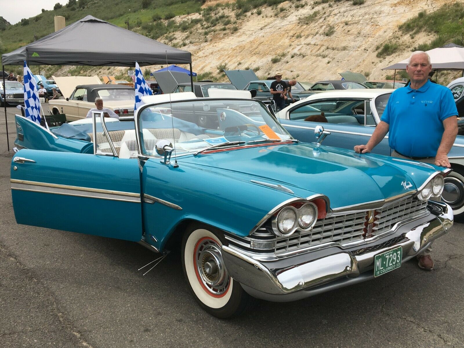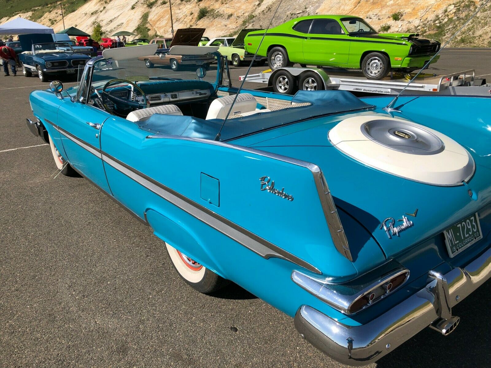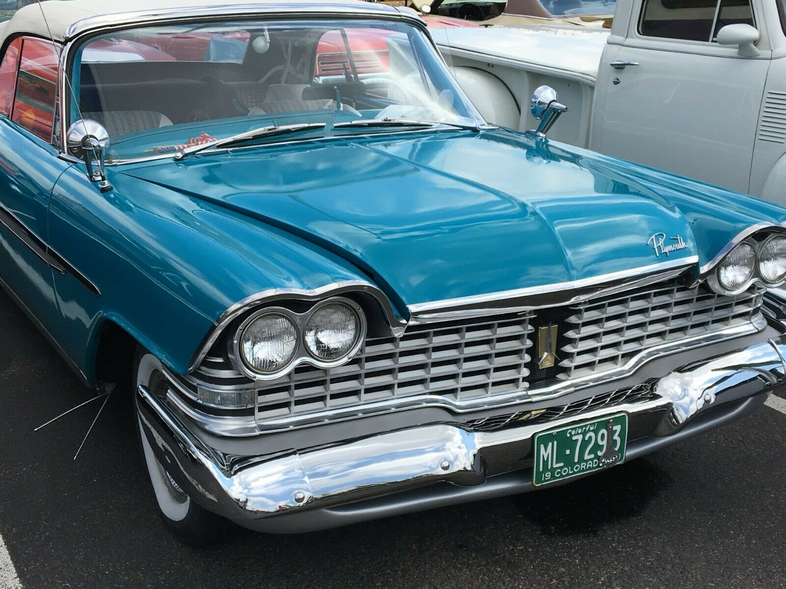 This is my pride and joy 59 Plymouth Belvedere Convertible that I put back on the road 7 years ago. Originally Black but is now painted in the Spring Color of Turquoise that Plymouth offered back then. Car was built in the Evanston, Indiana Assembly Plant on April 30th, 1959 according to Chrysler Historical records. Car was located in Montana on a ranchers field and hauled back to Denver to start its restoration.