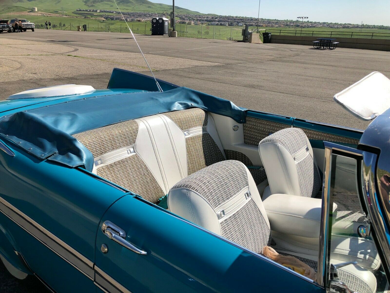 I also had the Sport Fury type swivel seats installed with the SF Cloth and Vinyl material. Car comes with the 1959 Only front Bumper wings, dual antennae, Deluxe see-thru acrylic steering wheel, AM radio, Padded dash. Also an original transmission mounted 1959 dealer installed A/C control pod. I never had the lines made to hook all of this up to the engine compressor. but the hard to find pod goes with the car. The white convertible top is 7 years old and has one small tear in it at a pivot point of the top, but presently sealed up to keep any moisture out.